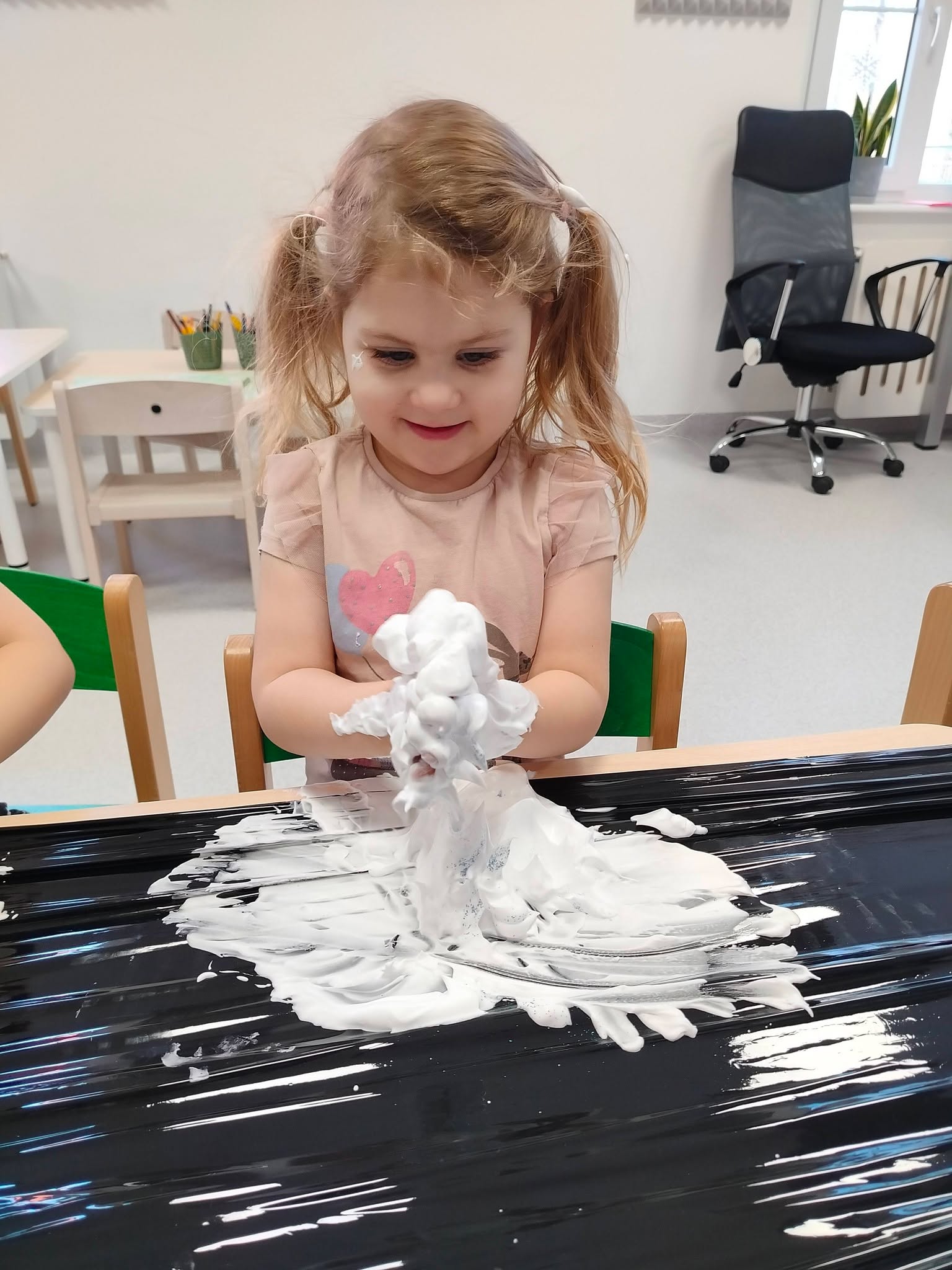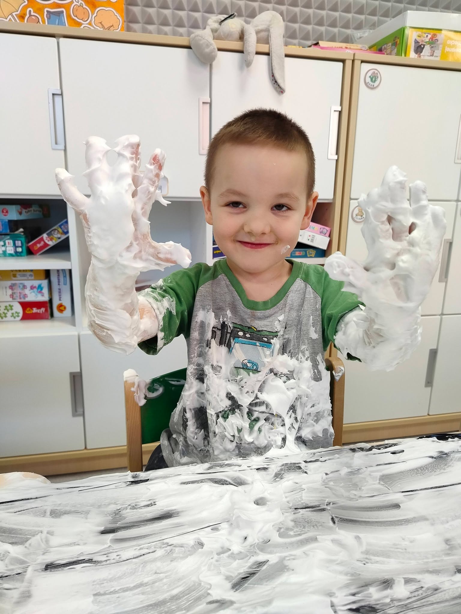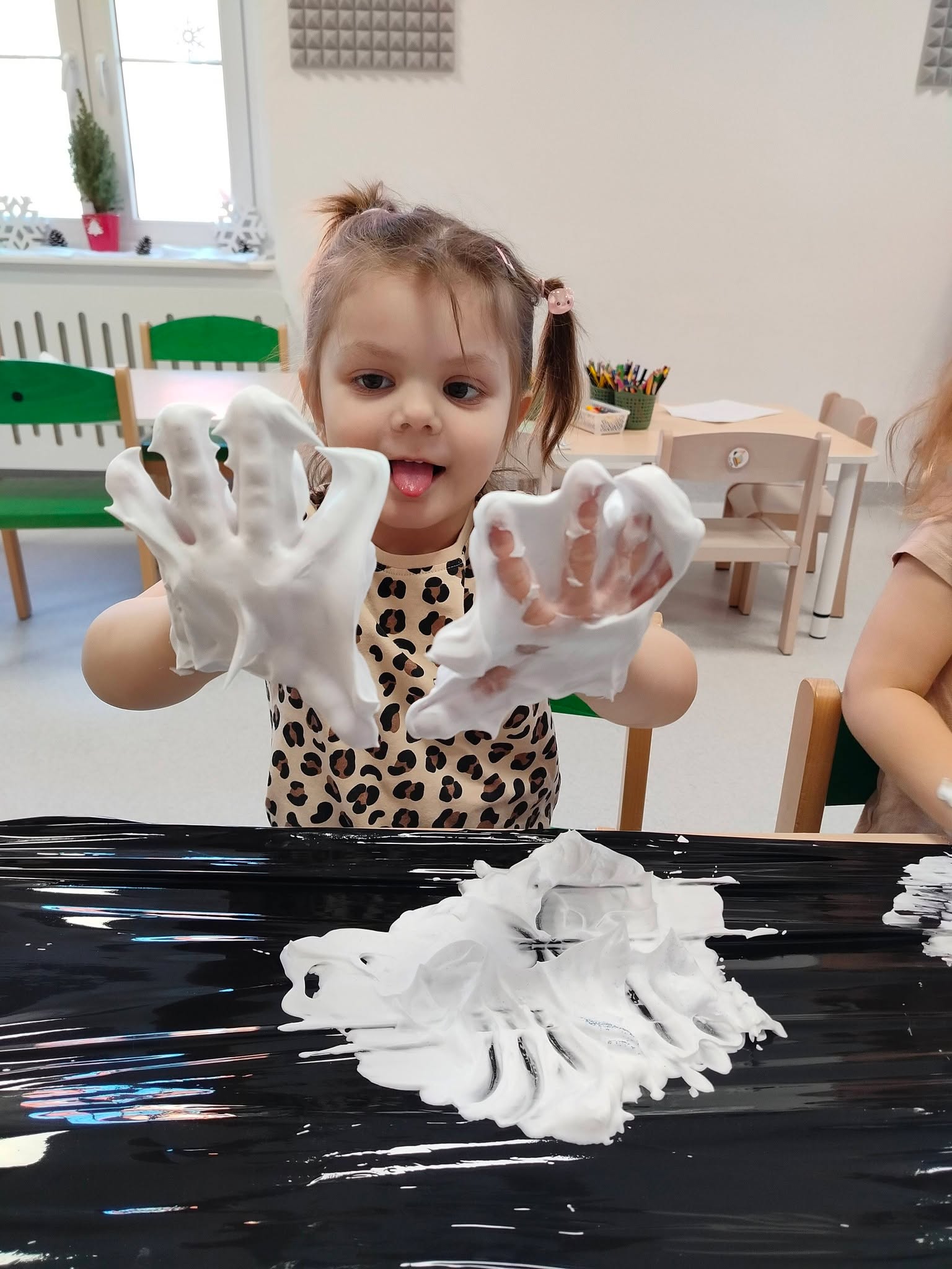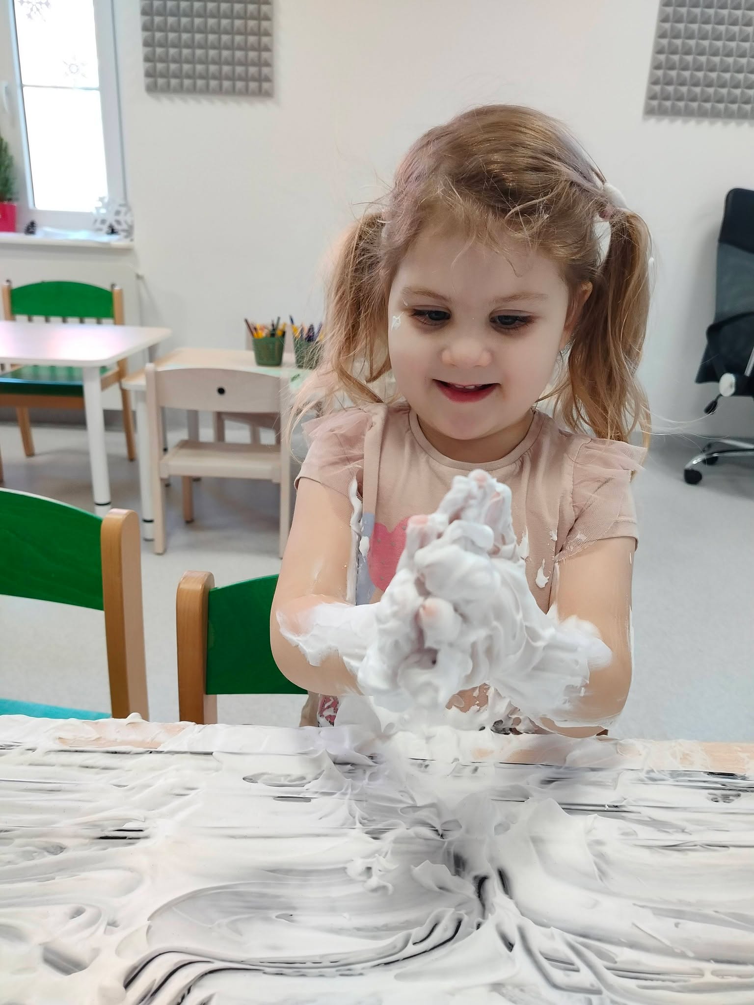 Dziś było sensorycznie i zimowo ❄️😄 Najpierw piankowe szaleństwo w sali – mazanie, ugniatanie i mnóstwo śmiechu, a potem wyjście na śnieg 🤩🌨️❄️