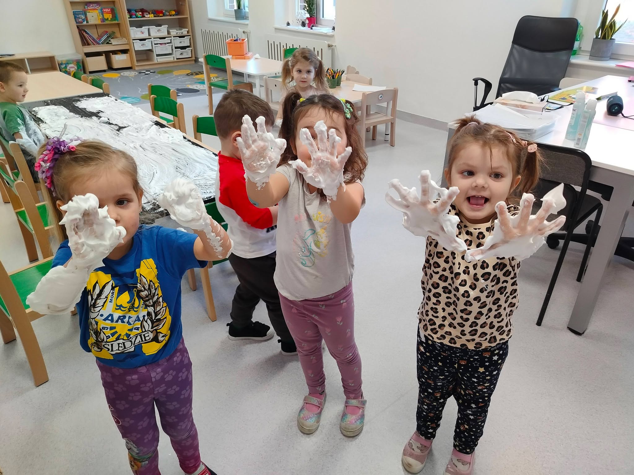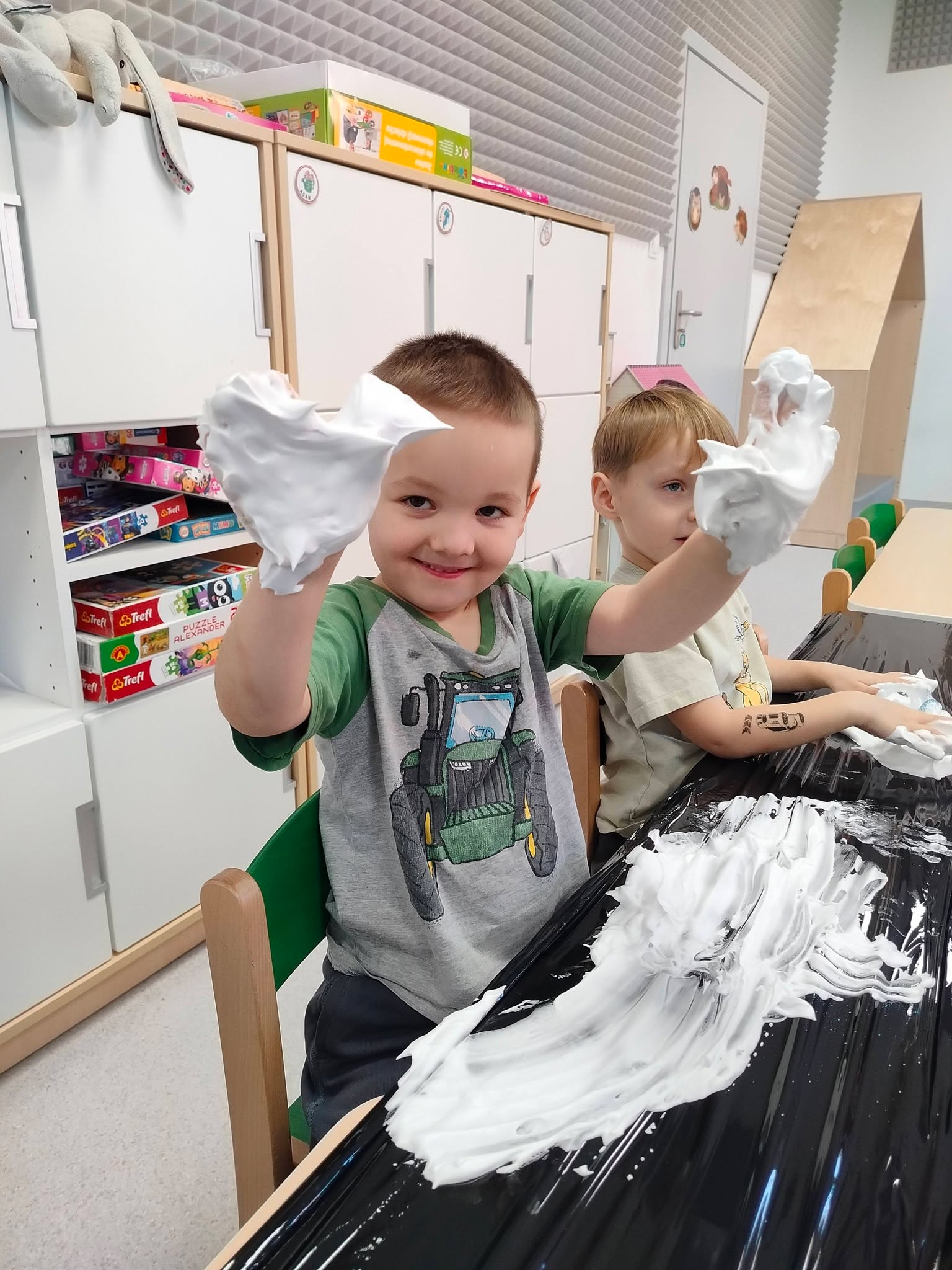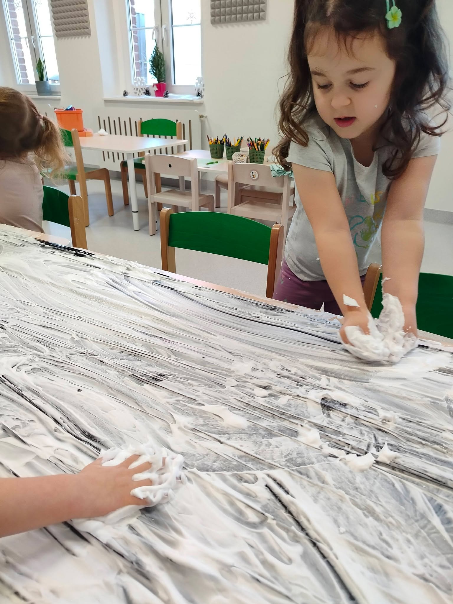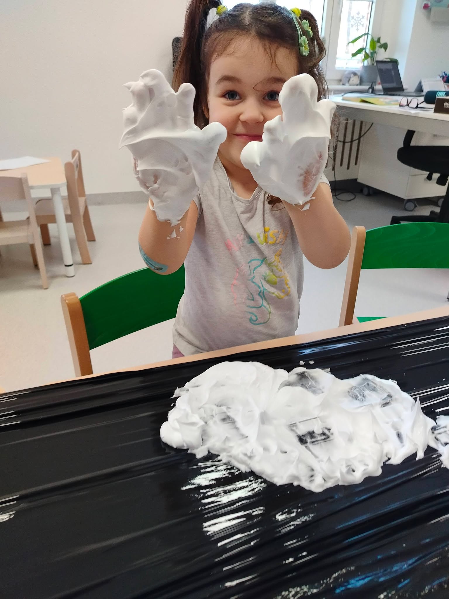 Dziś było sensorycznie i zimowo ❄️😄 Najpierw piankowe szaleństwo w sali – mazanie, ugniatanie i mnóstwo śmiechu, a potem wyjście na śnieg 🤩🌨️❄️