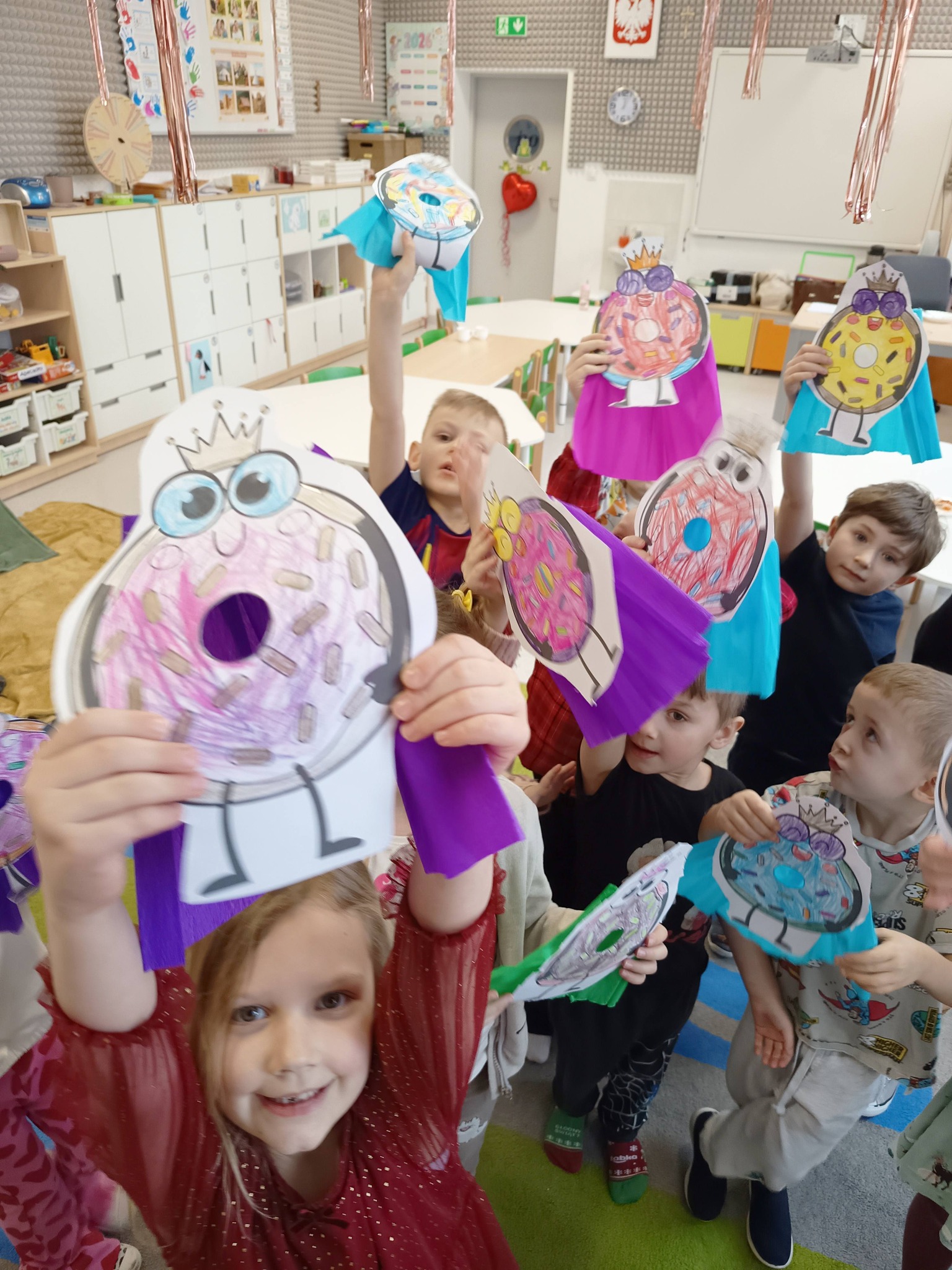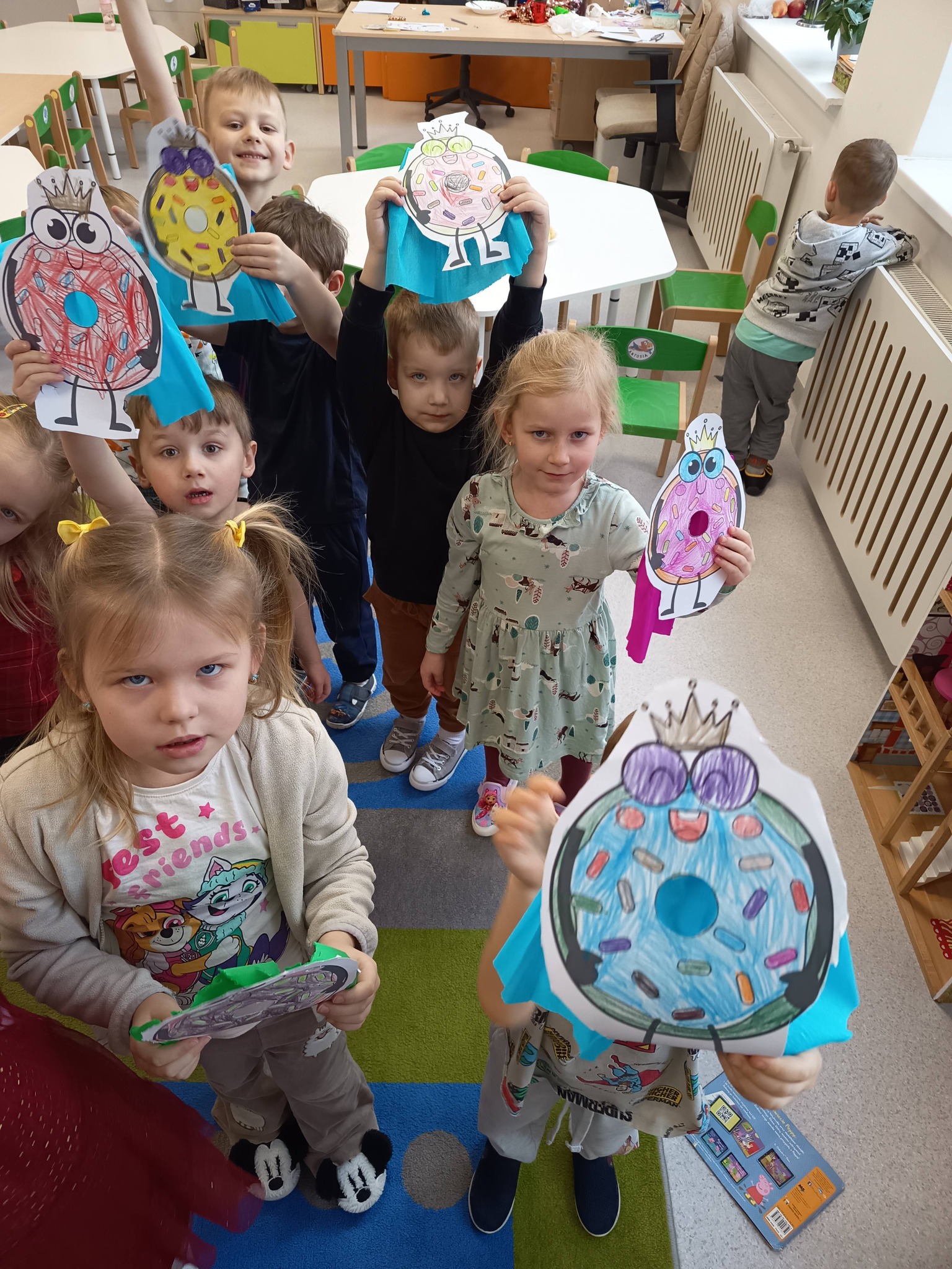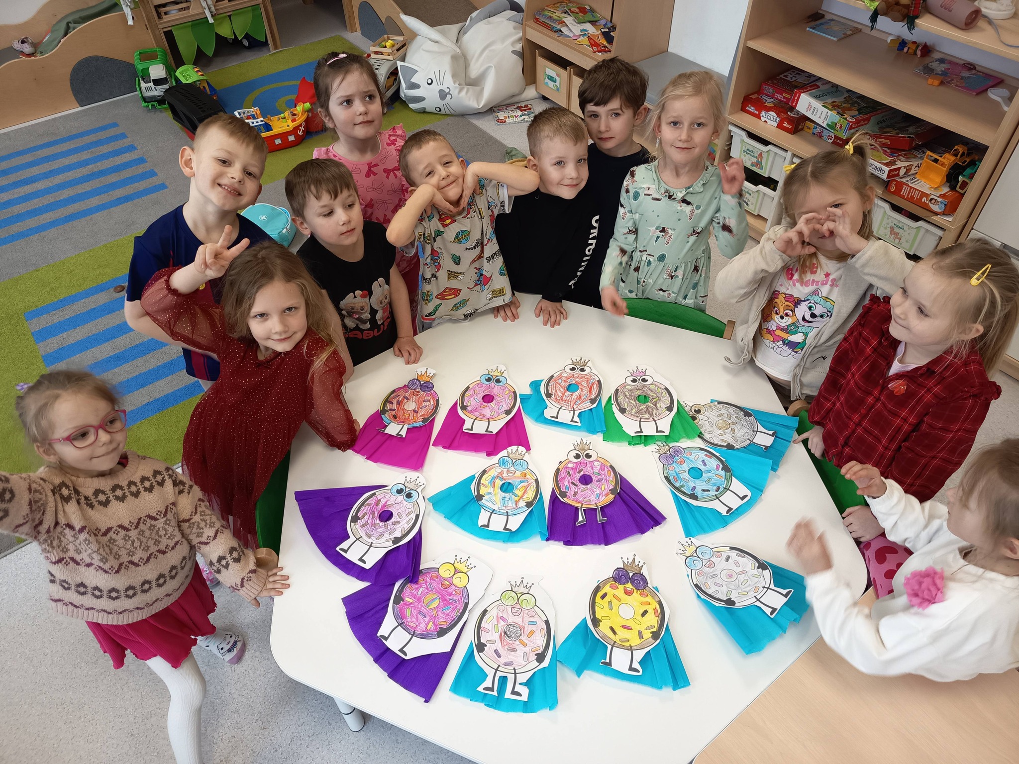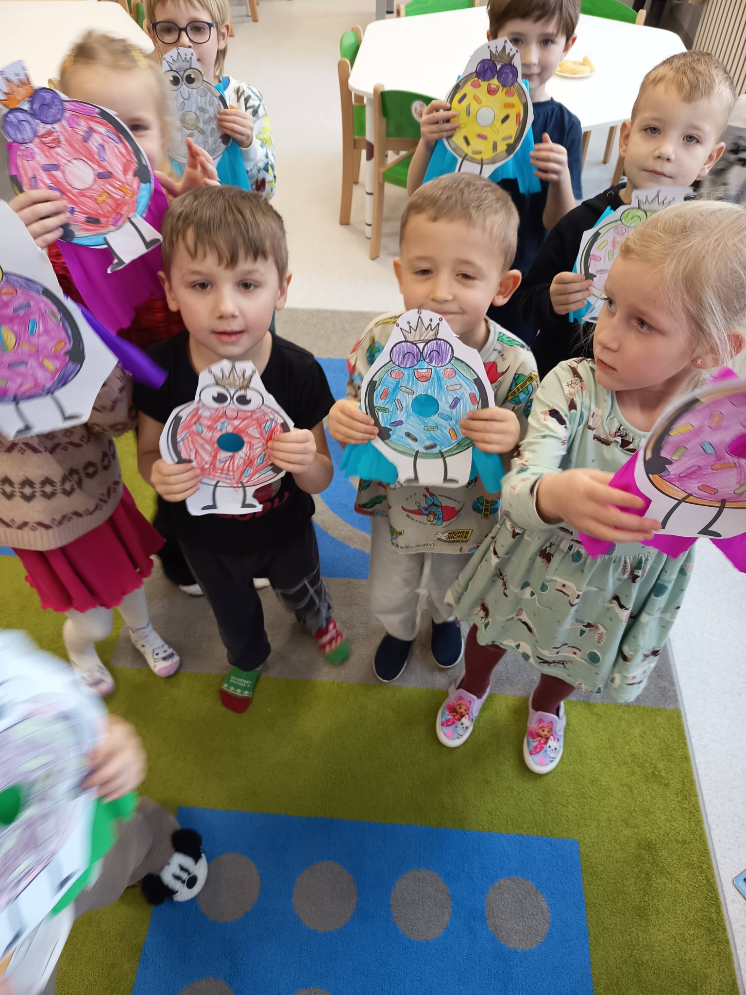 Nie zabrakło także działań twórczych – mali artyści wykonali pracę plastyczną „Jego Wysokość Pączek”, a następnie z entuzjazmem uczestniczyli w tematycznych grach dydaktycznych 🎨🎲