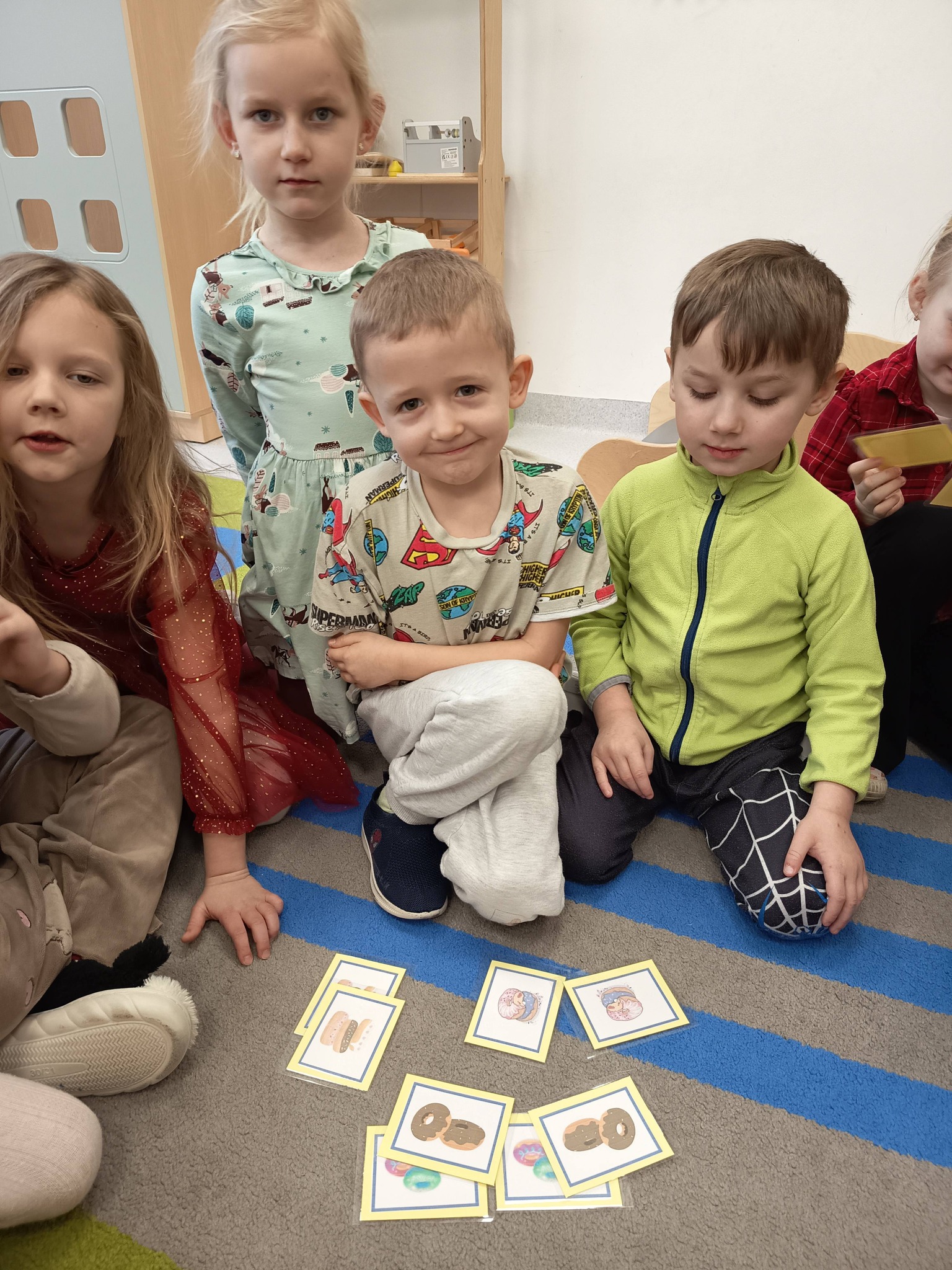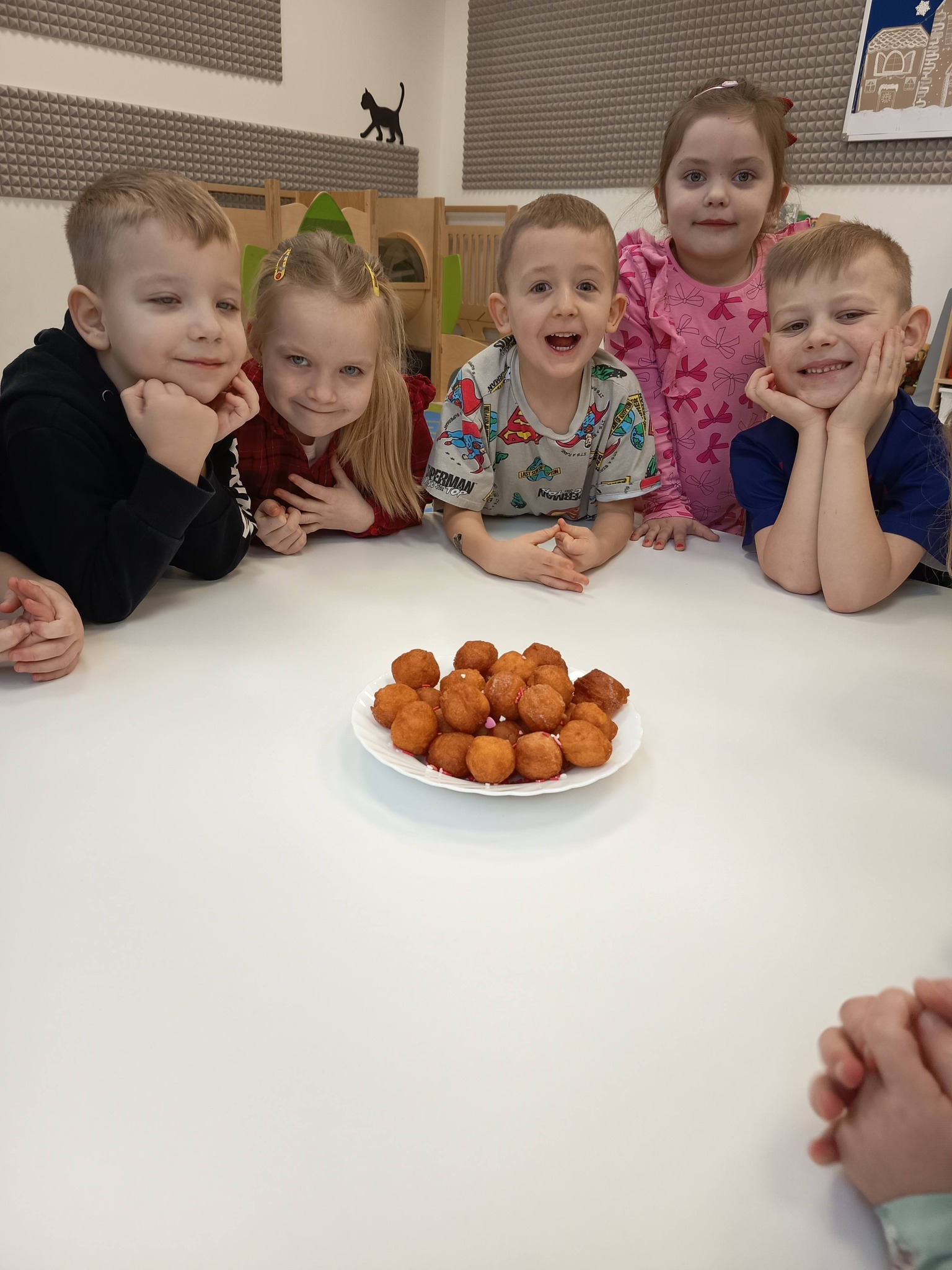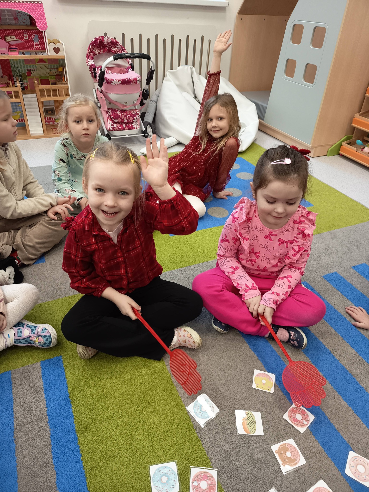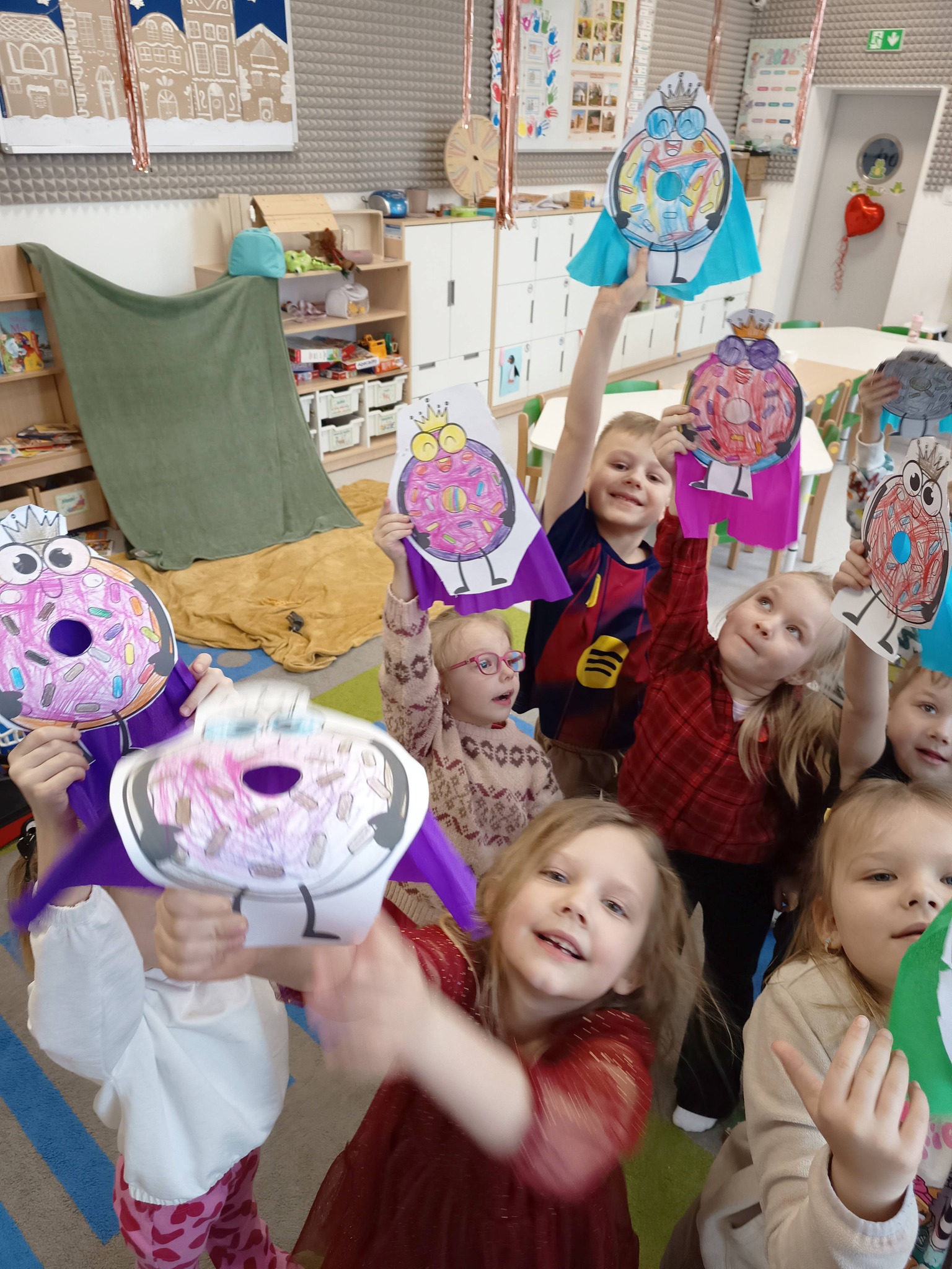 Nie zabrakło także działań twórczych – mali artyści wykonali pracę plastyczną „Jego Wysokość Pączek”, a następnie z entuzjazmem uczestniczyli w tematycznych grach dydaktycznych 🎨🎲