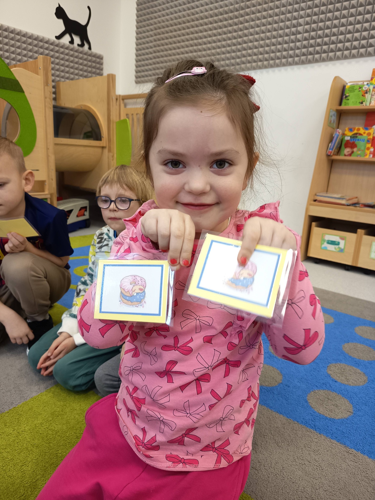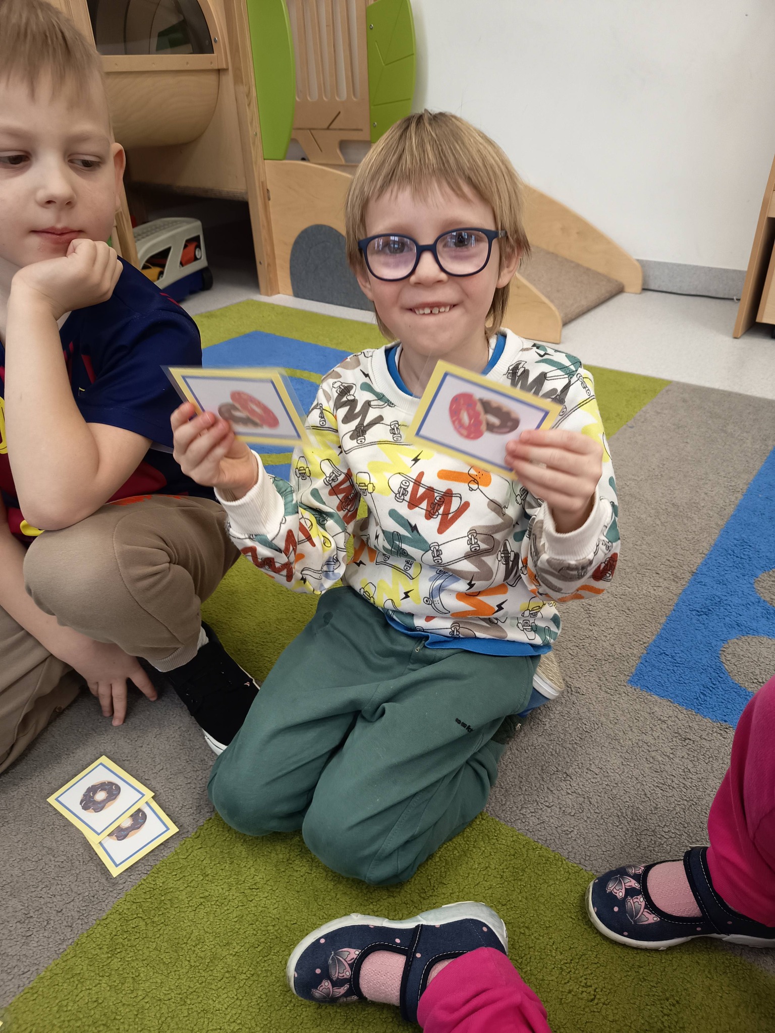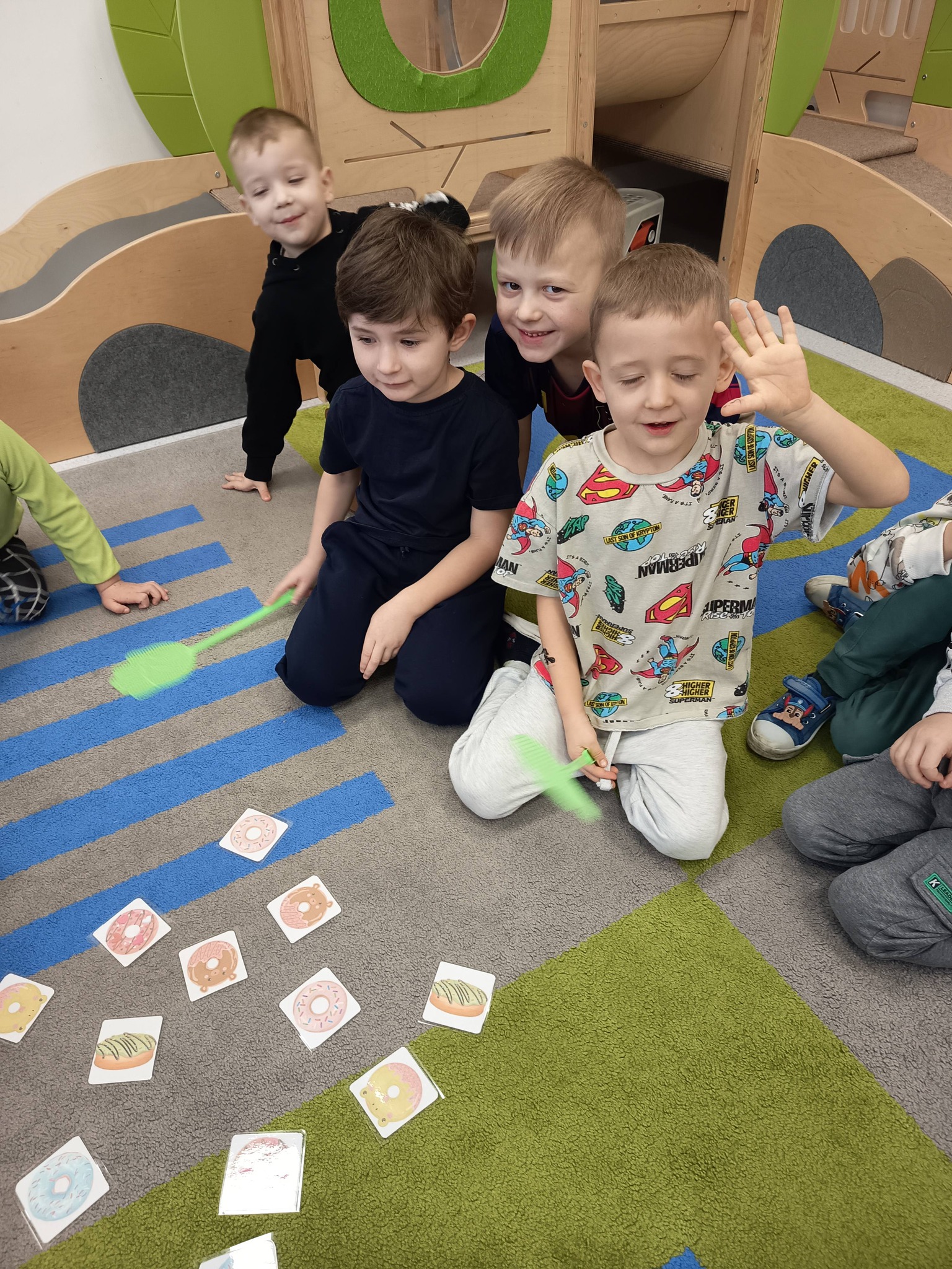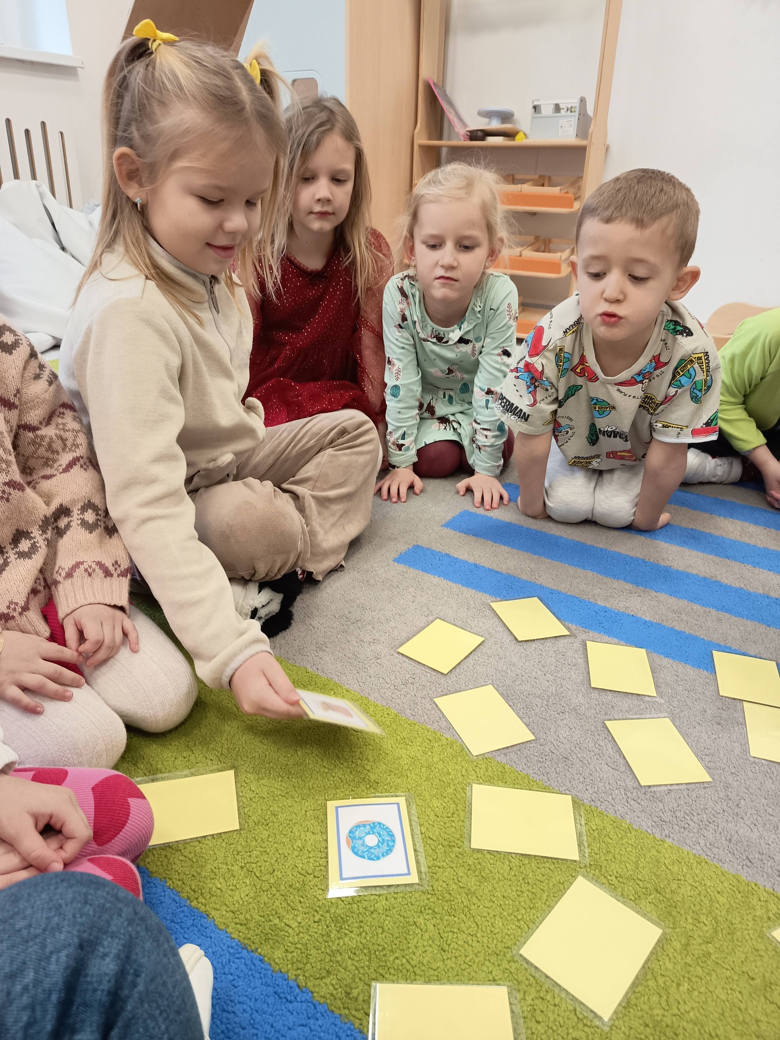 Nie zabrakło także działań twórczych – mali artyści wykonali pracę plastyczną „Jego Wysokość Pączek”, a następnie z entuzjazmem uczestniczyli w tematycznych grach dydaktycznych 🎨🎲