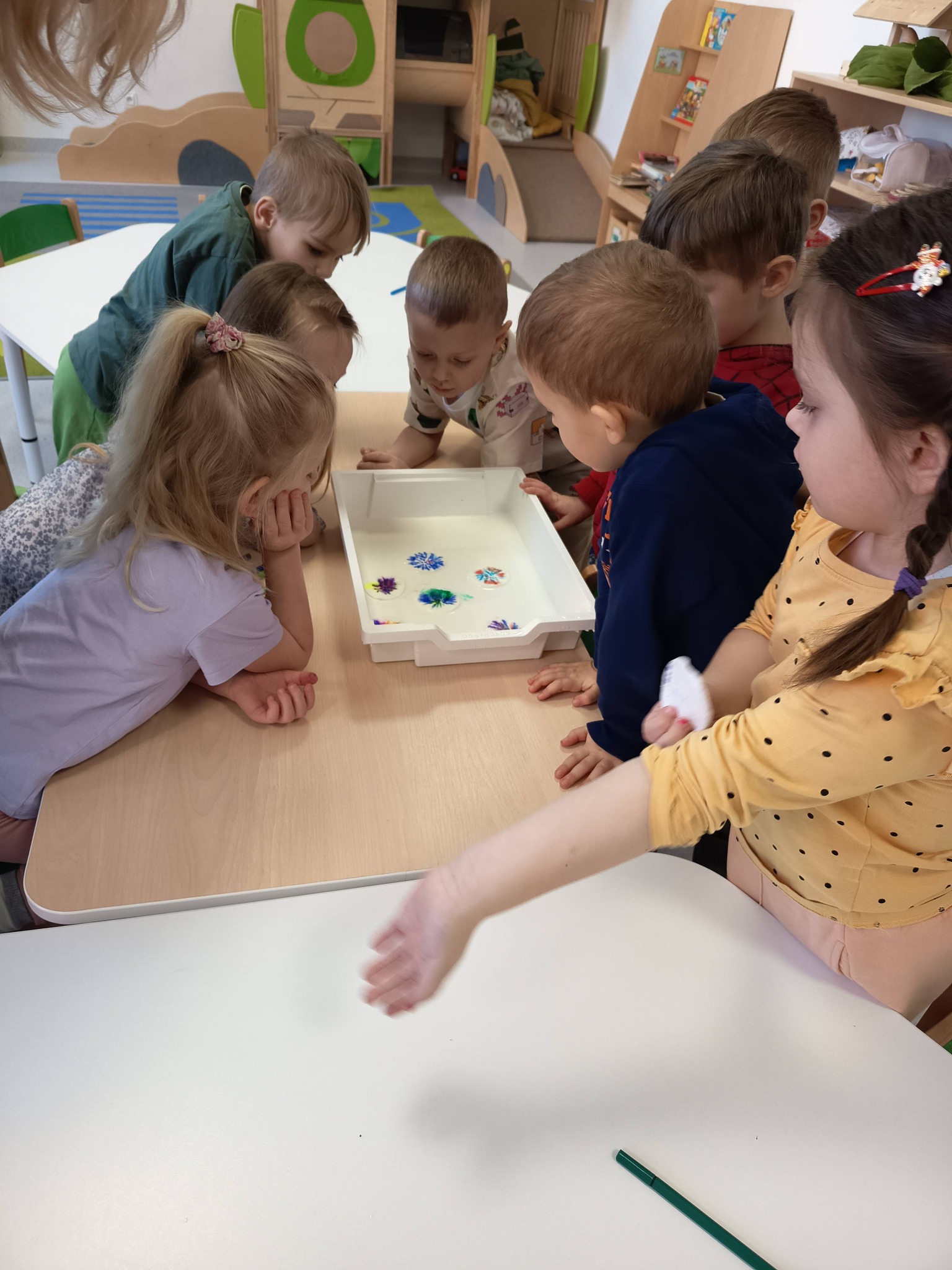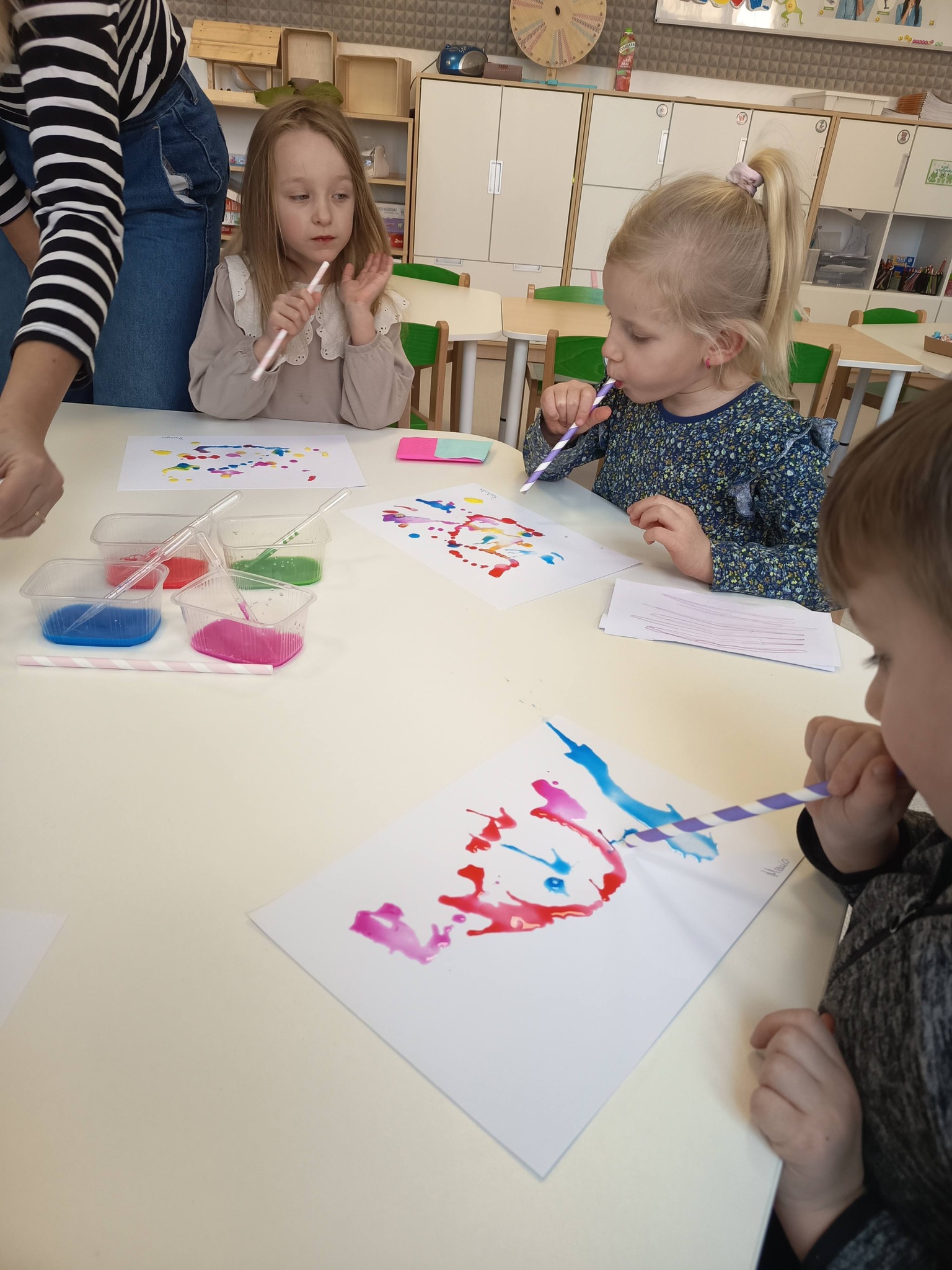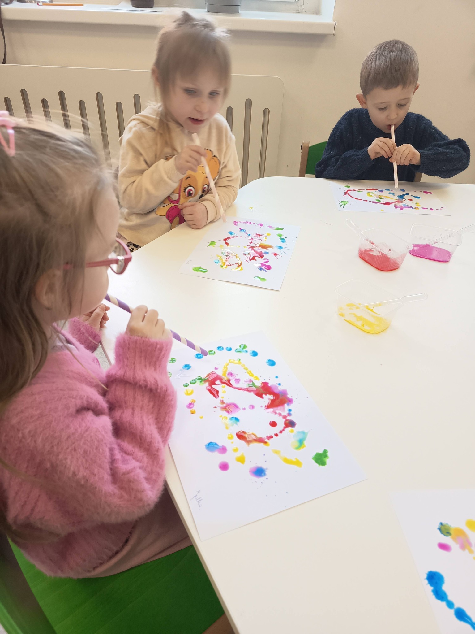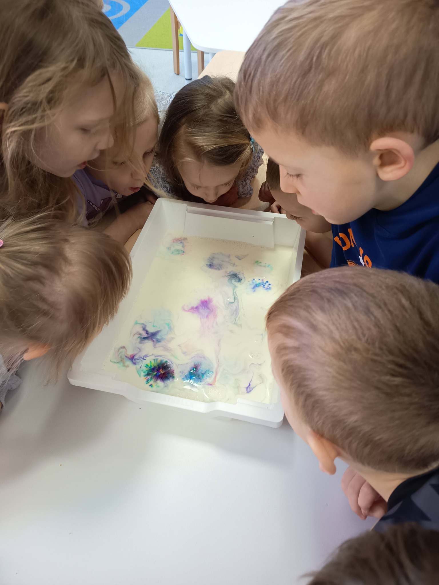 Podczas zajęć:🎨 sprawdzaliśmy, jak powstają piękne kolory, barwiąc mleko płatkiem kosmetycznym pomalowanym mazakami,🌬️ tworzyliśmy niezwykłe obrazy poprzez rozdmuchiwanie kleksów z farby,🎈 a także wykonaliśmy kolorowe gniotki z balonów, które świetnie sprawdzają się do ćwiczeń rączek i zabawy sensorycznej.