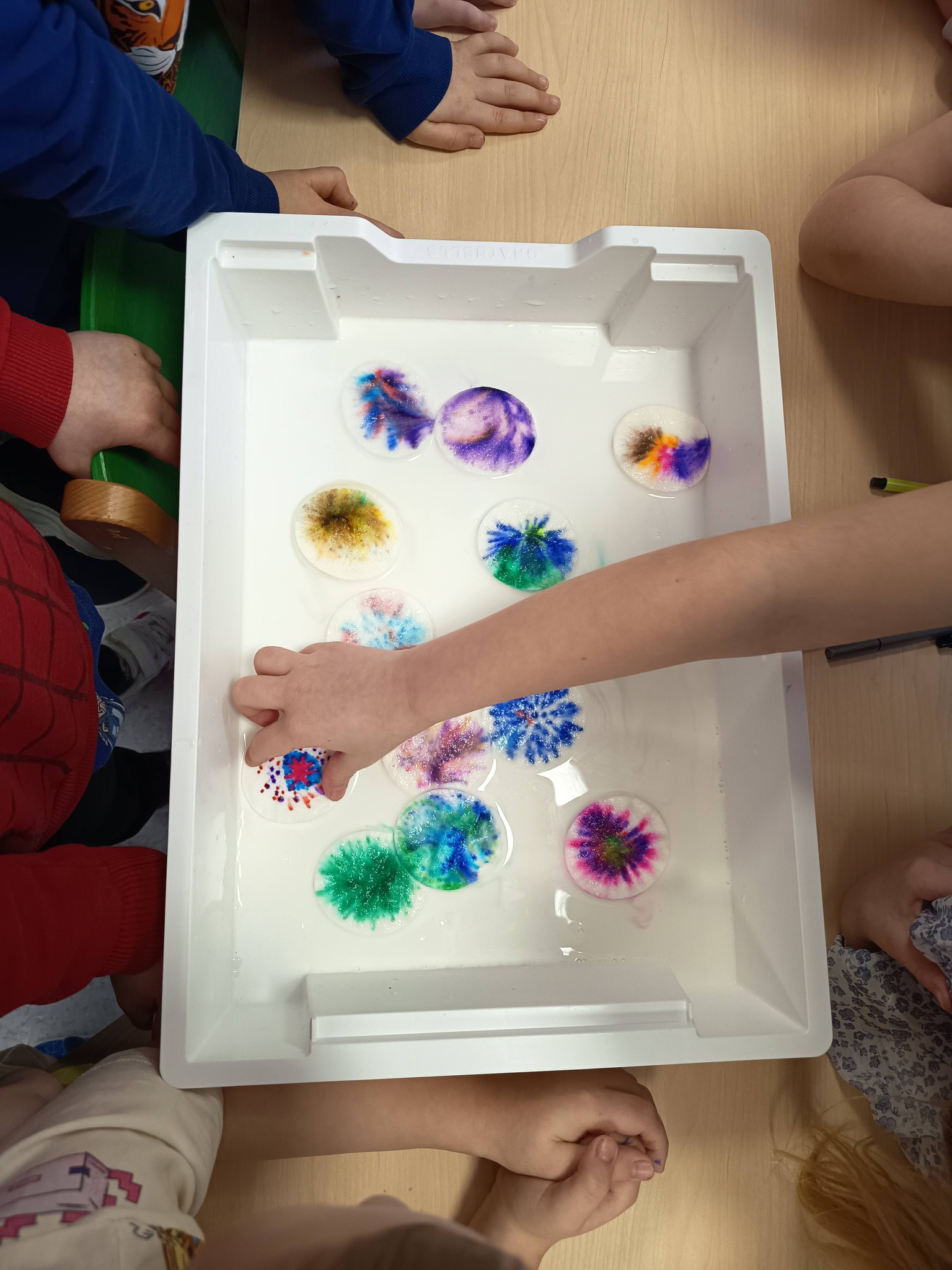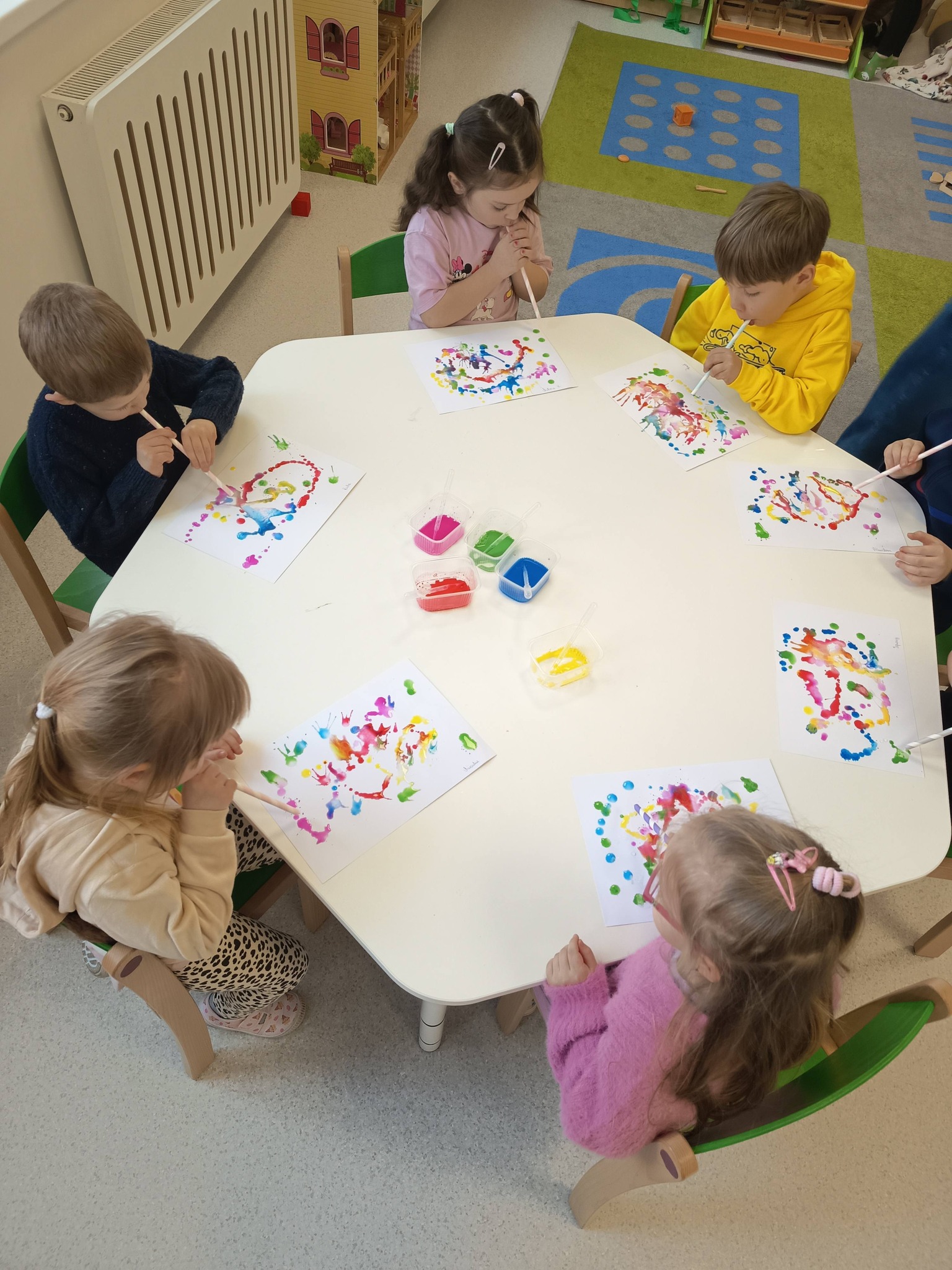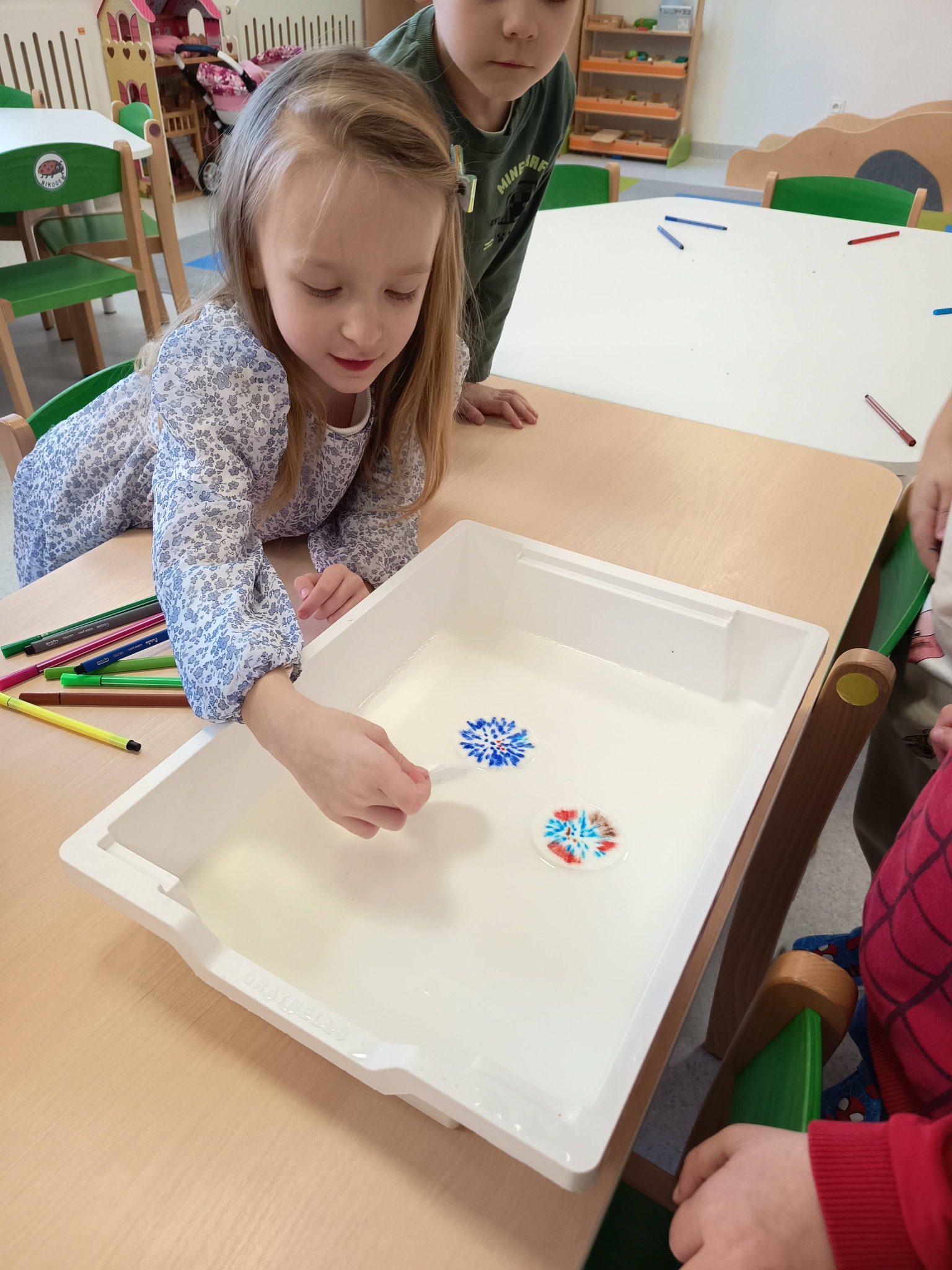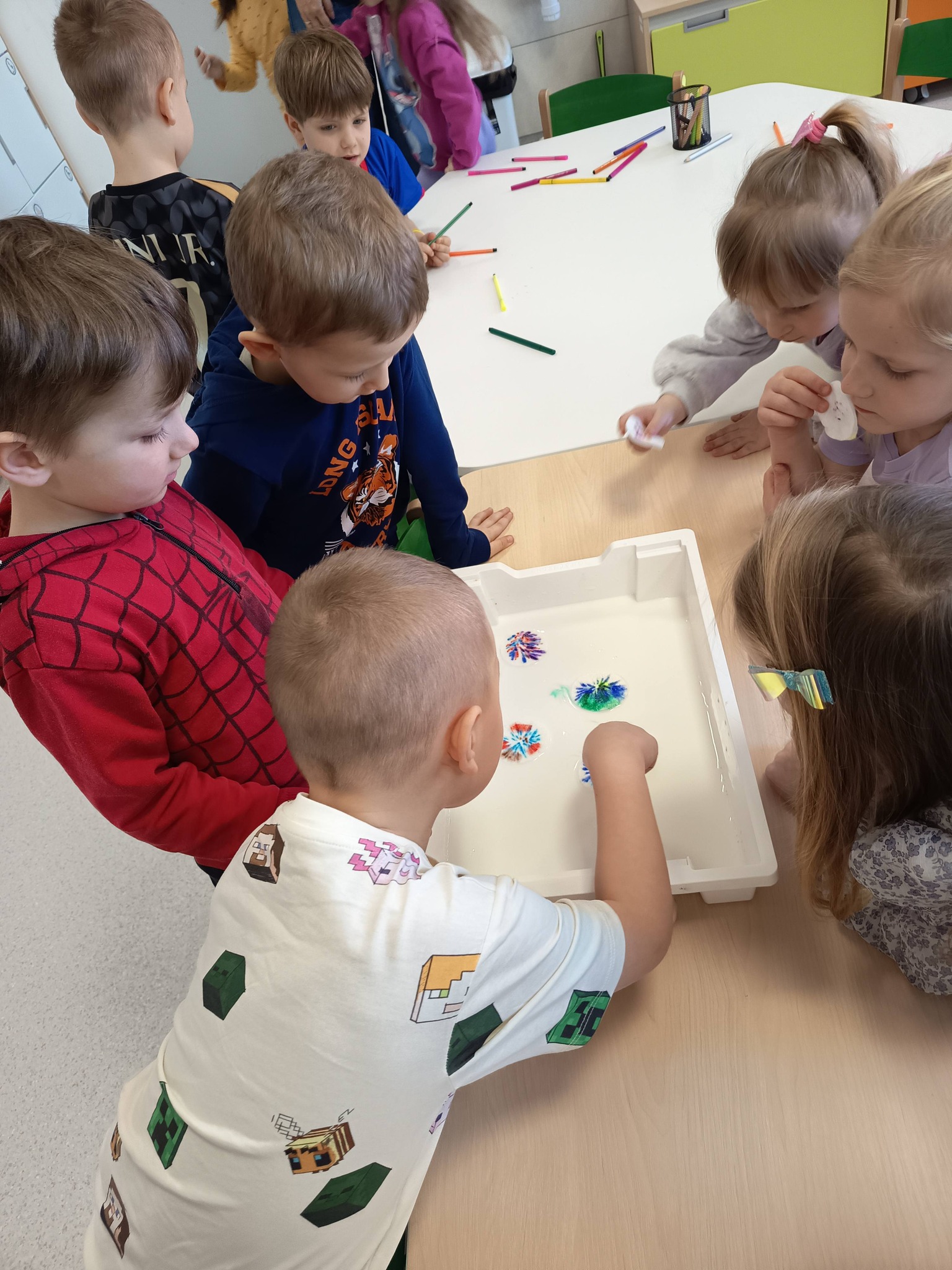 Podczas zajęć:🎨 sprawdzaliśmy, jak powstają piękne kolory, barwiąc mleko płatkiem kosmetycznym pomalowanym mazakami,🌬️ tworzyliśmy niezwykłe obrazy poprzez rozdmuchiwanie kleksów z farby,🎈 a także wykonaliśmy kolorowe gniotki z balonów, które świetnie sprawdzają się do ćwiczeń rączek i zabawy sensorycznej.