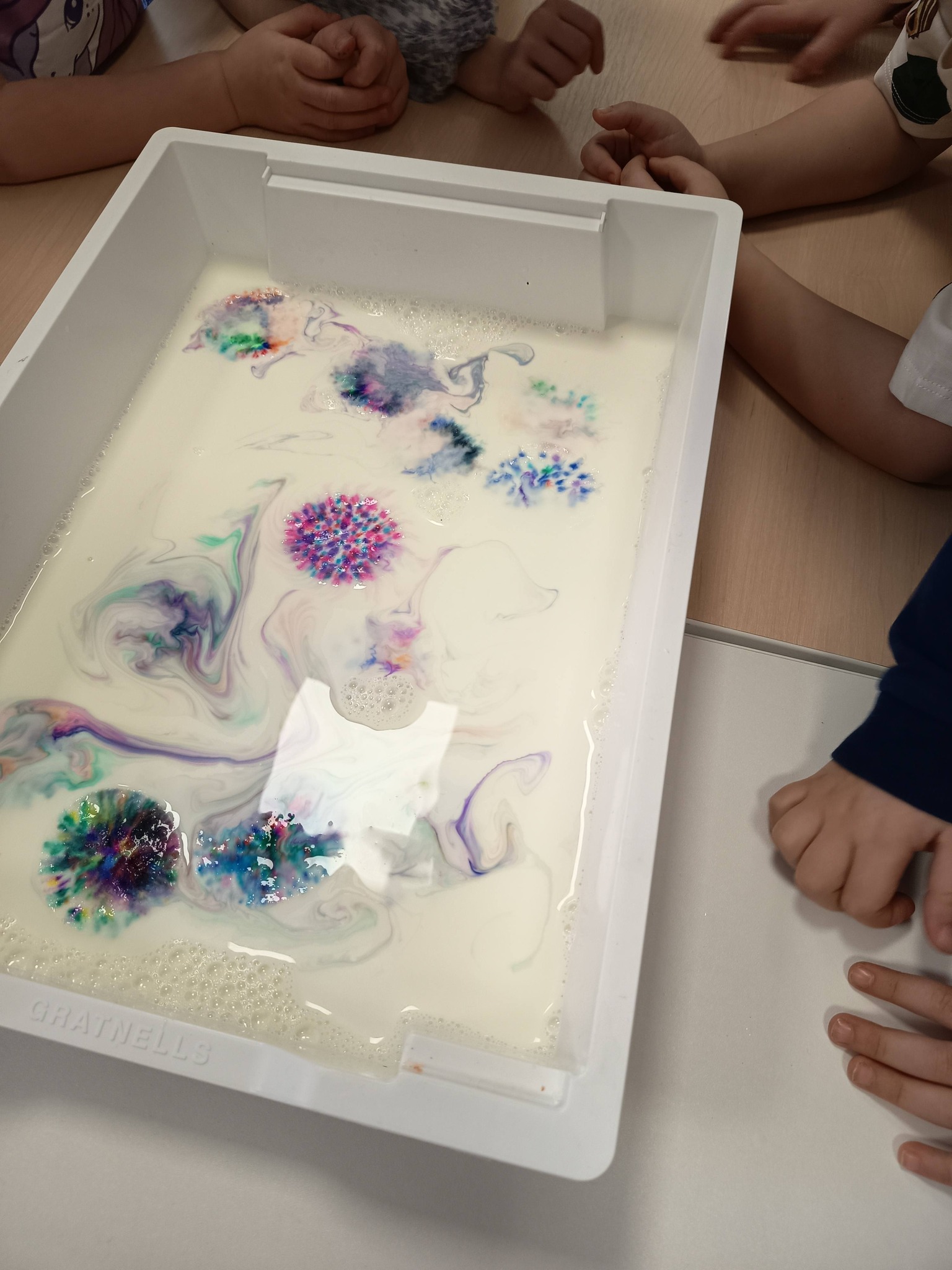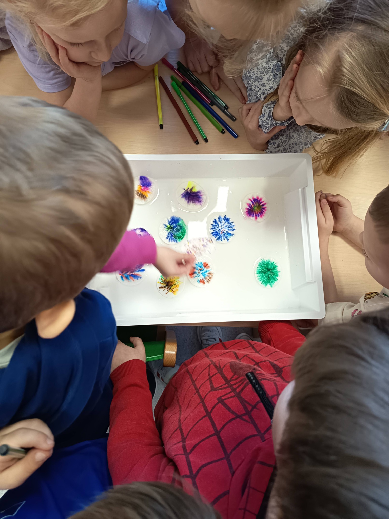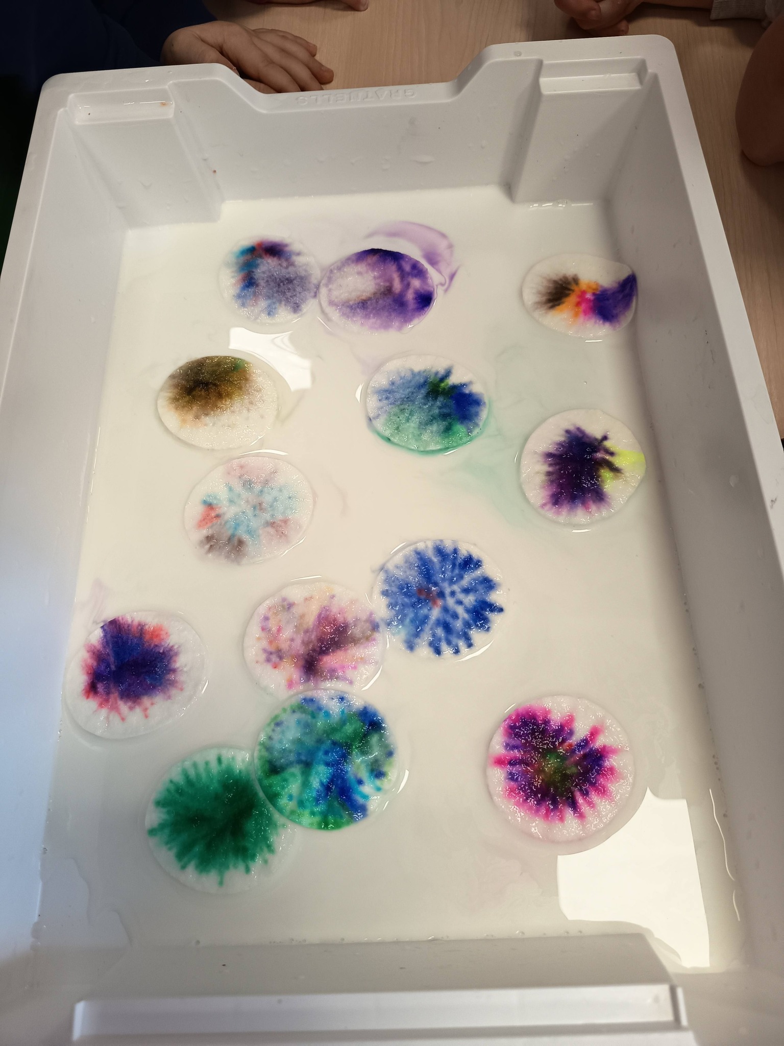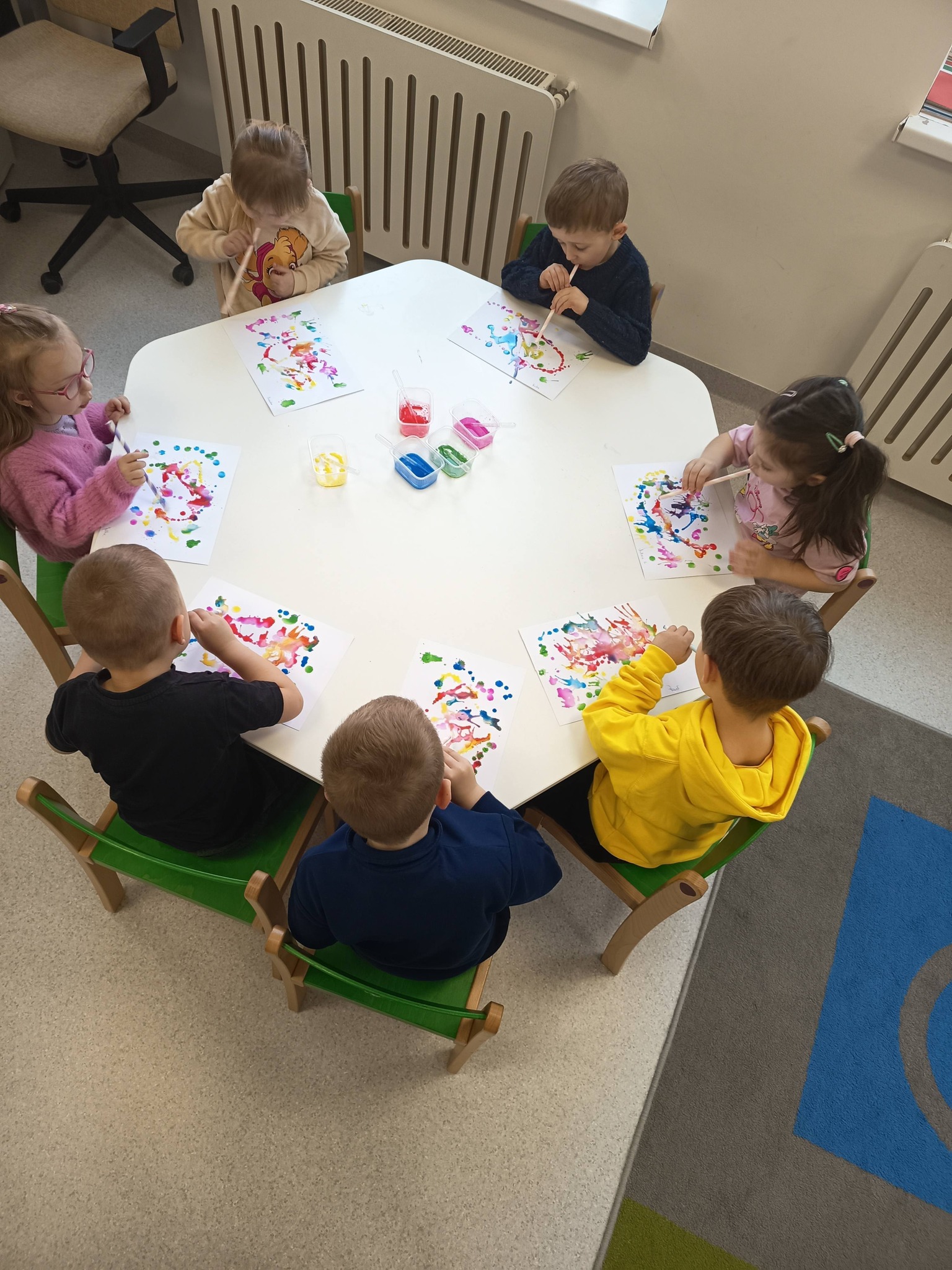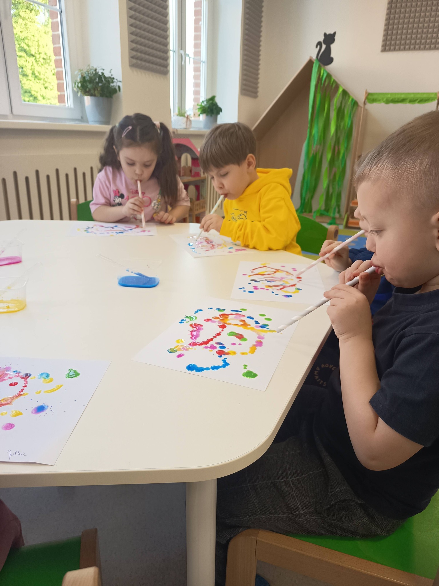 Podczas zajęć:🎨 sprawdzaliśmy, jak powstają piękne kolory, barwiąc mleko płatkiem kosmetycznym pomalowanym mazakami,🌬️ tworzyliśmy niezwykłe obrazy poprzez rozdmuchiwanie kleksów z farby,🎈 a także wykonaliśmy kolorowe gniotki z balonów, które świetnie sprawdzają się do ćwiczeń rączek i zabawy sensorycznej.