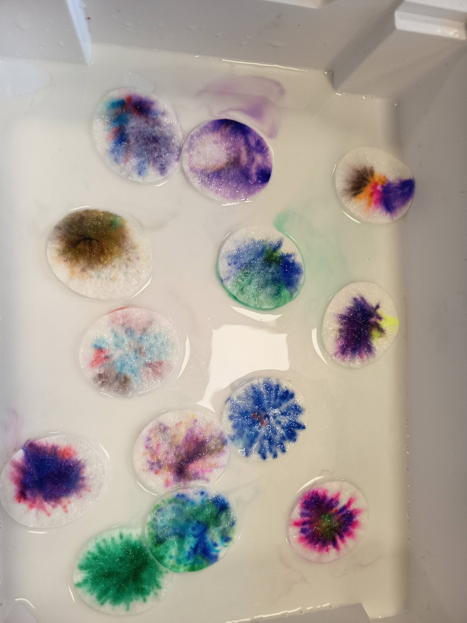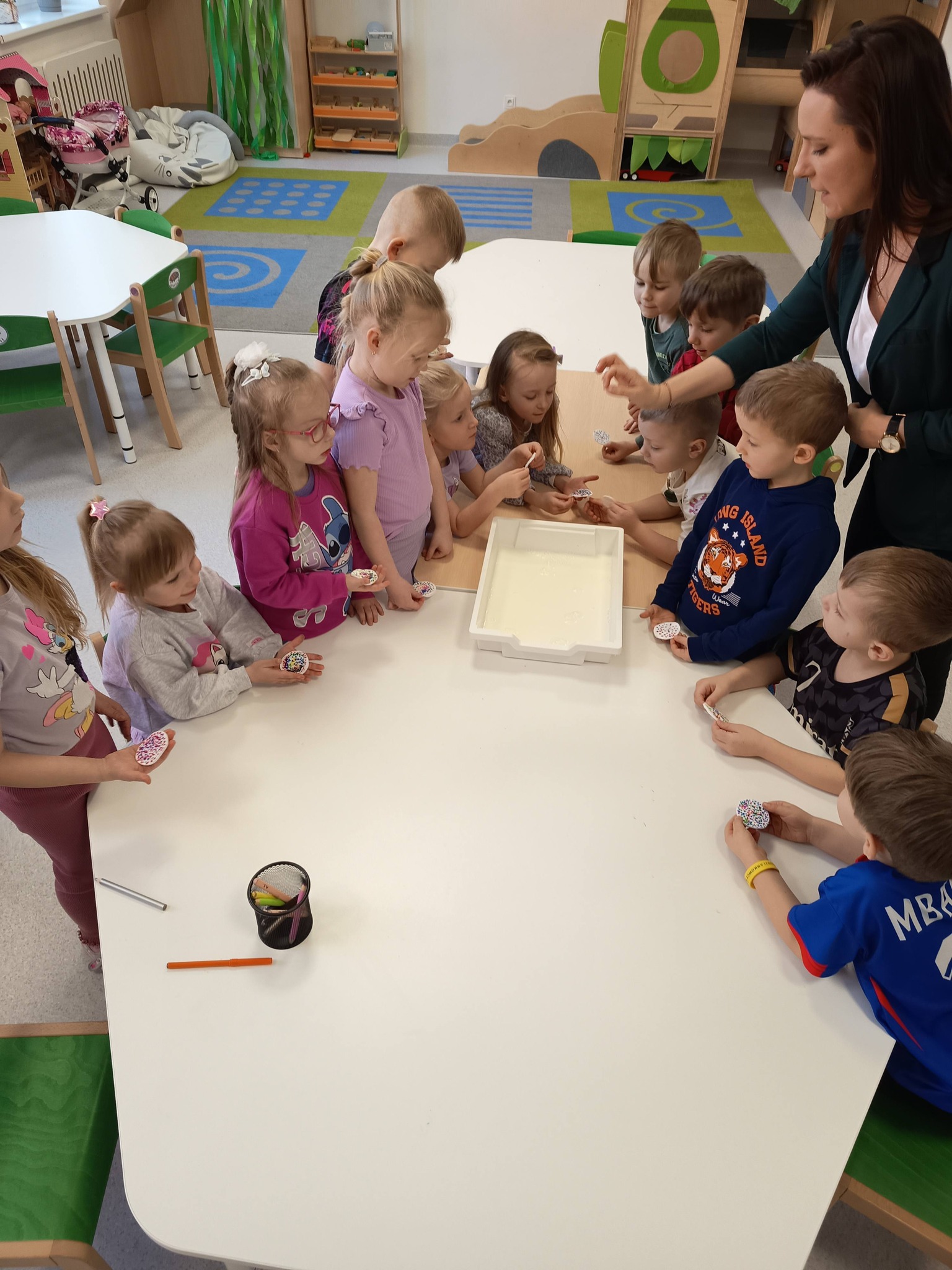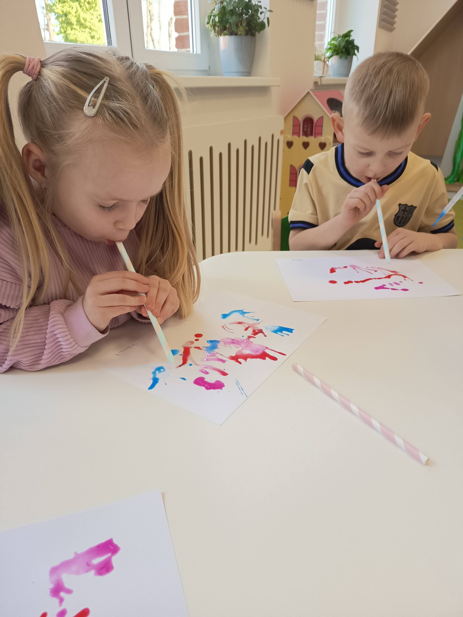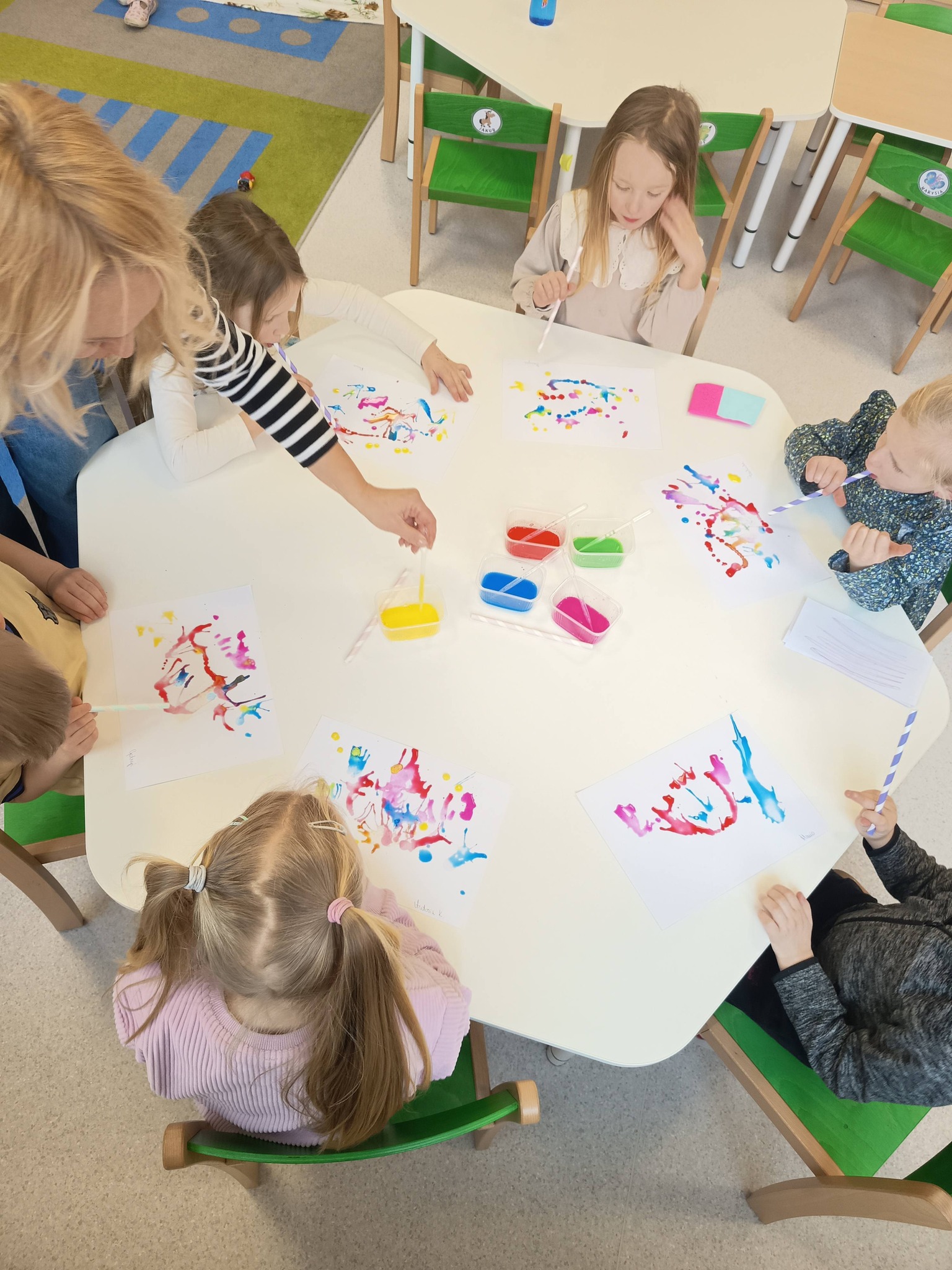 Podczas zajęć:🎨 sprawdzaliśmy, jak powstają piękne kolory, barwiąc mleko płatkiem kosmetycznym pomalowanym mazakami,🌬️ tworzyliśmy niezwykłe obrazy poprzez rozdmuchiwanie kleksów z farby,🎈 a także wykonaliśmy kolorowe gniotki z balonów, które świetnie sprawdzają się do ćwiczeń rączek i zabawy sensorycznej.