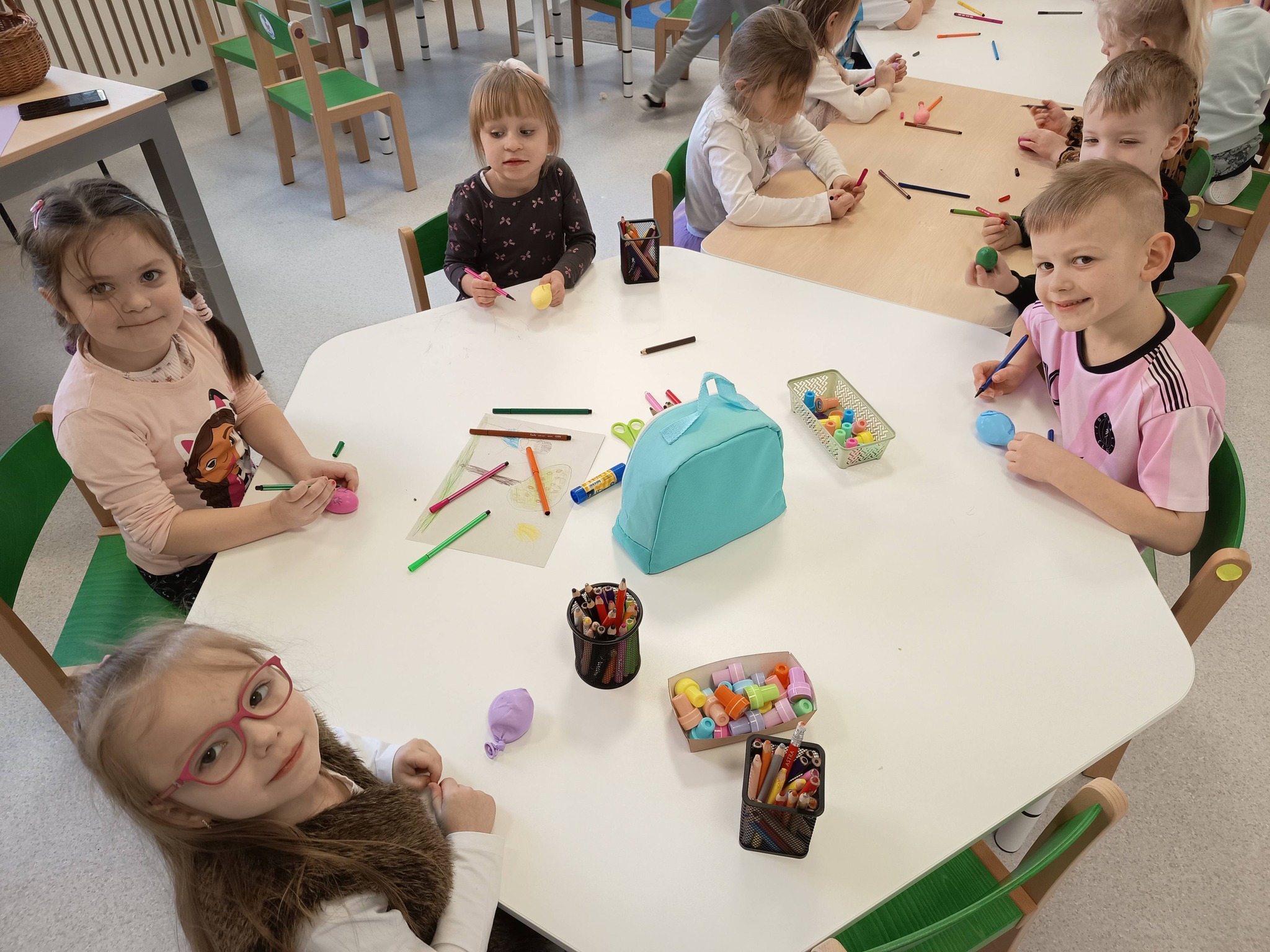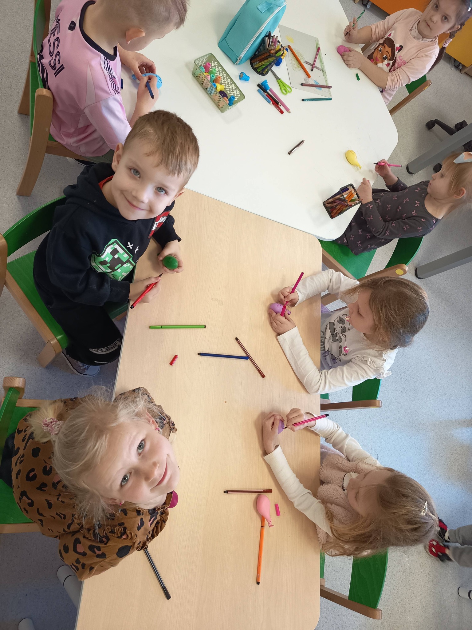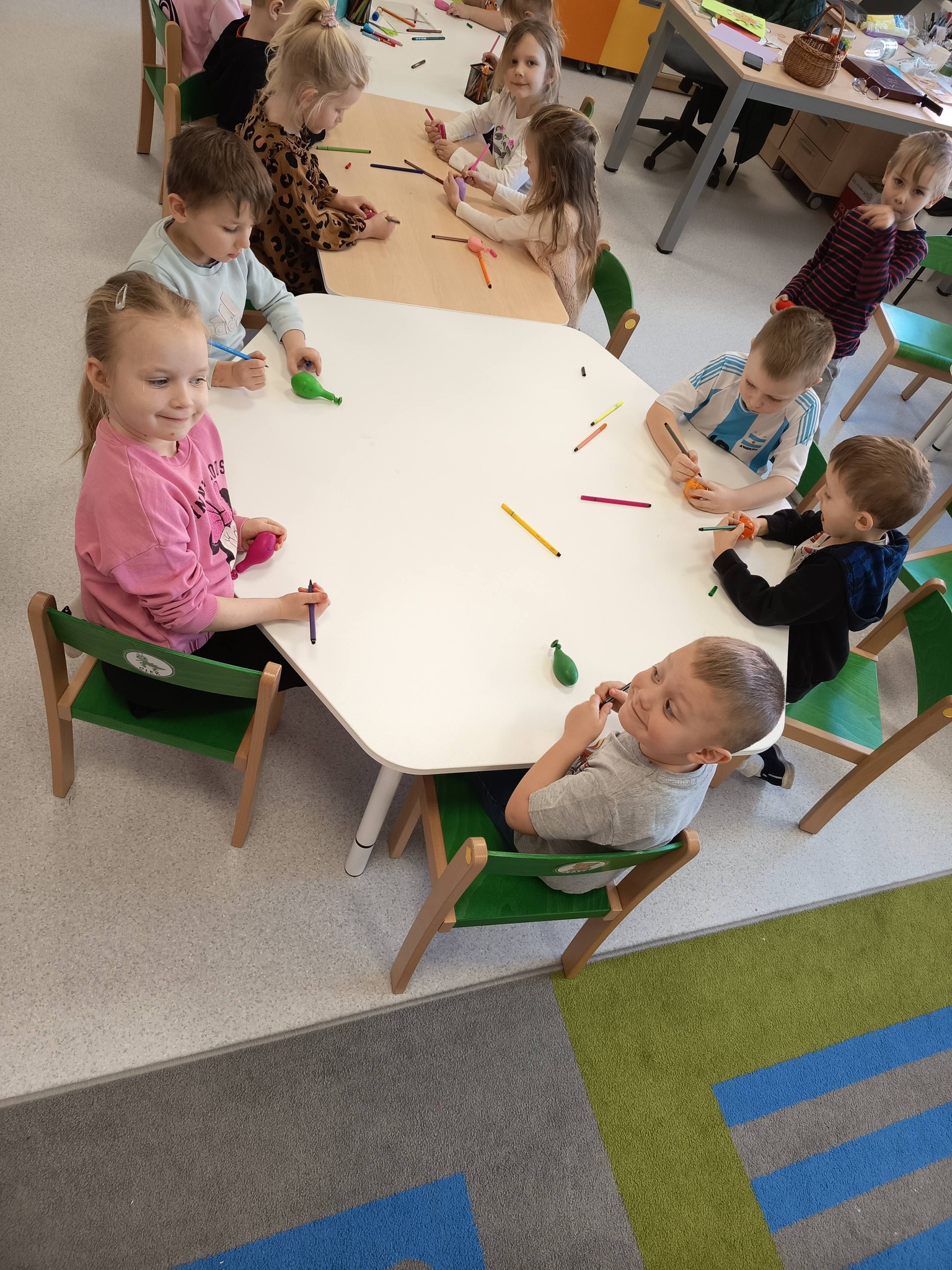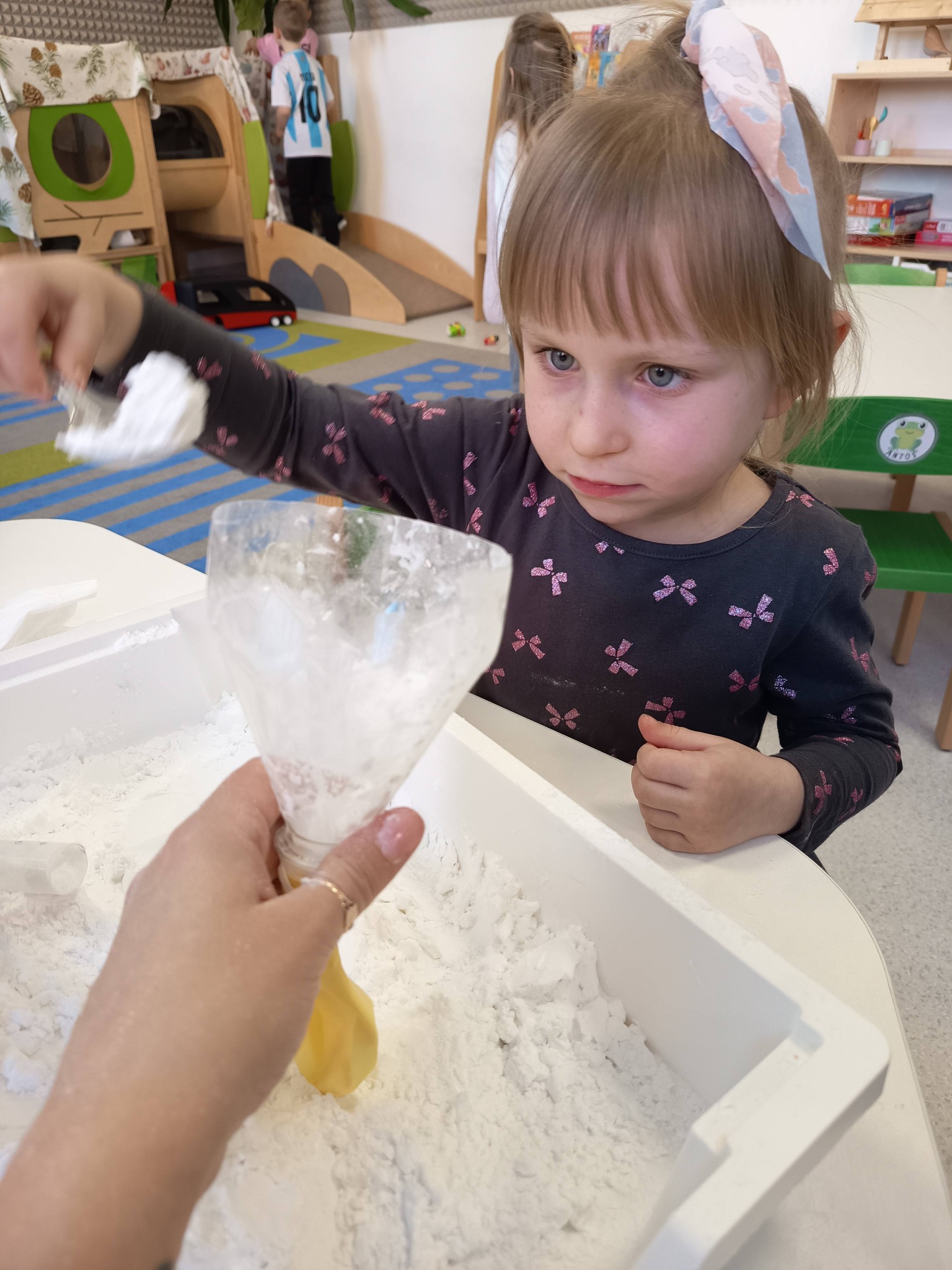 Podczas zajęć:🎨 sprawdzaliśmy, jak powstają piękne kolory, barwiąc mleko płatkiem kosmetycznym pomalowanym mazakami,🌬️ tworzyliśmy niezwykłe obrazy poprzez rozdmuchiwanie kleksów z farby,🎈 a także wykonaliśmy kolorowe gniotki z balonów, które świetnie sprawdzają się do ćwiczeń rączek i zabawy sensorycznej.