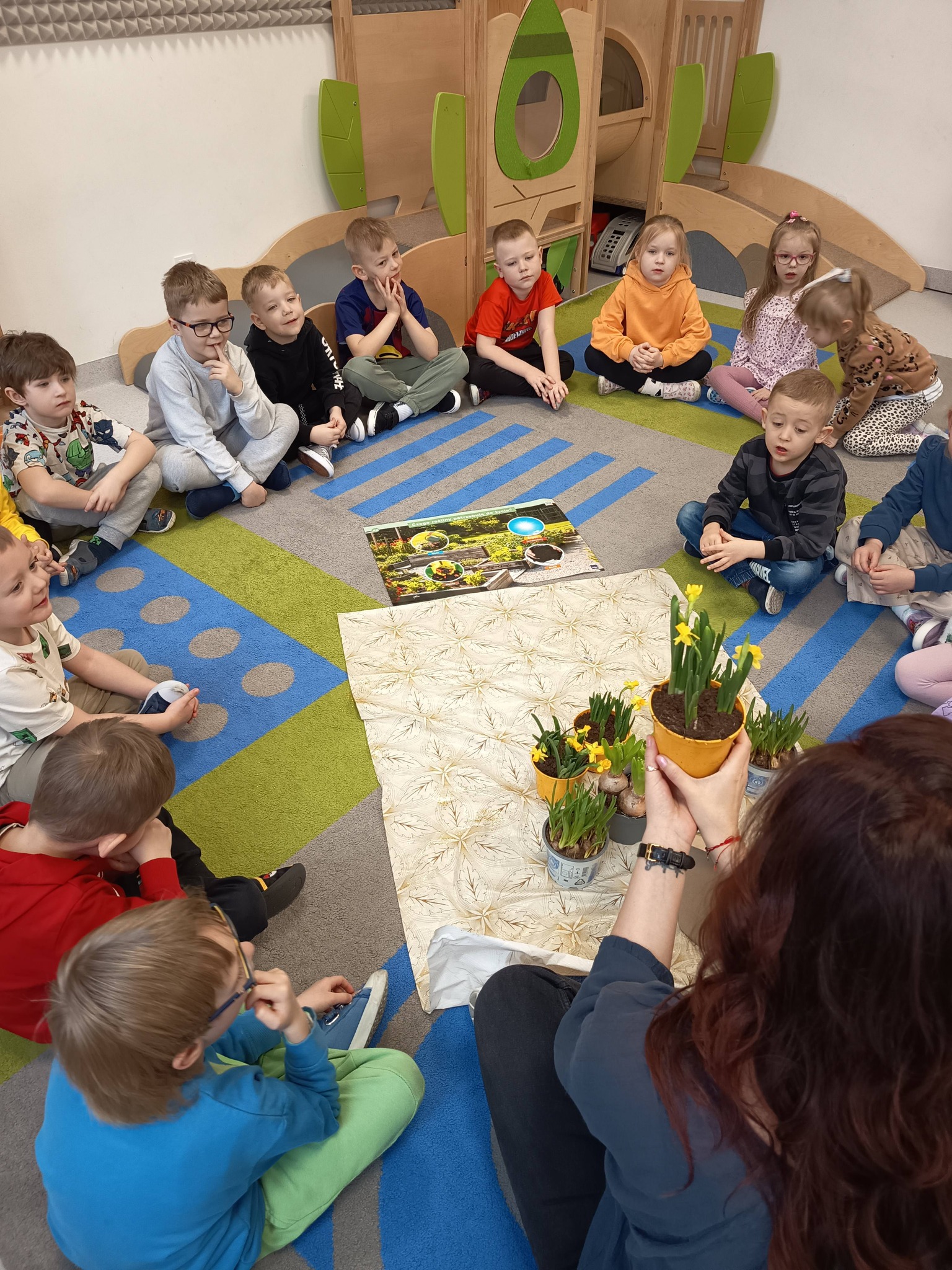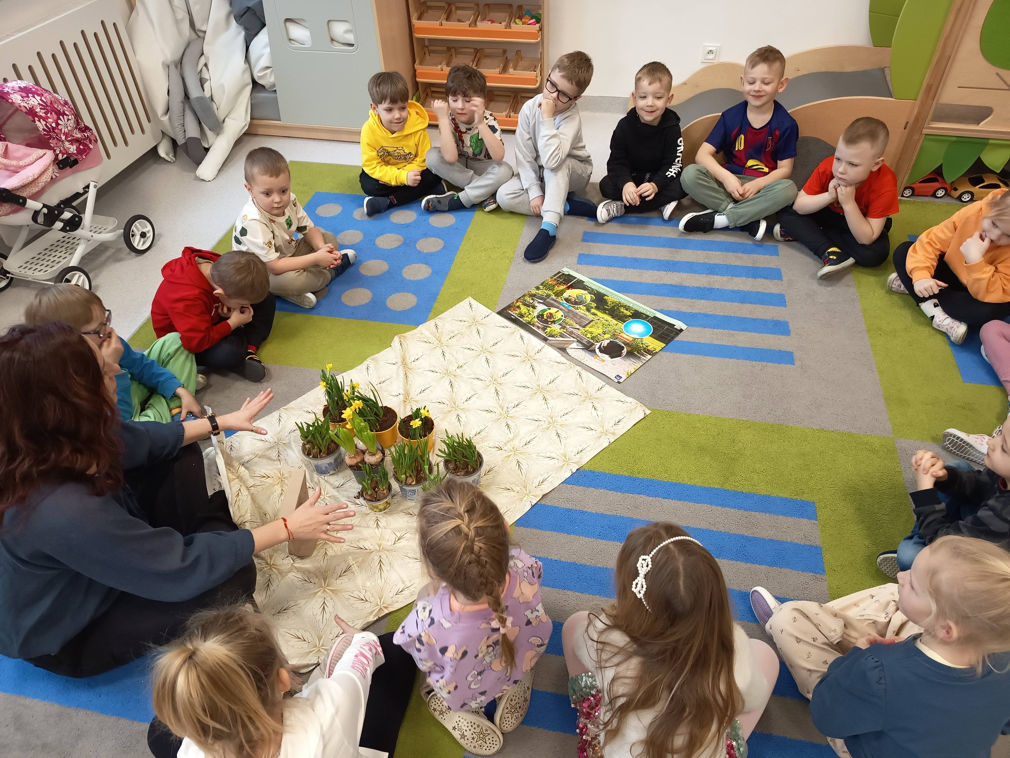 Podczas zajęć rozmawialiśmy także o tym, czego rośliny potrzebują do wzrostu. Dzieci dowiedziały się, że aby roślinki pięknie rosły, potrzebują ziemi, wody, światła słonecznego i troski. 🌞💧