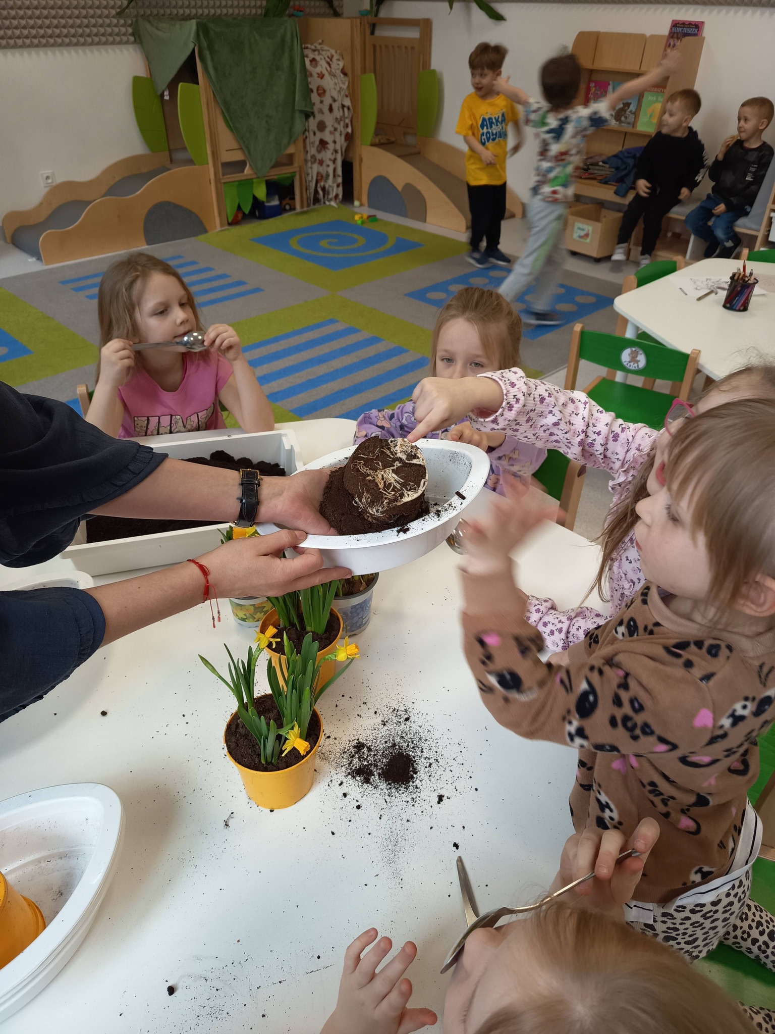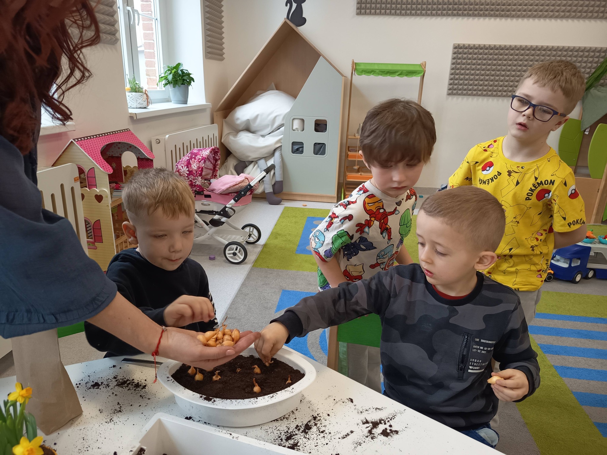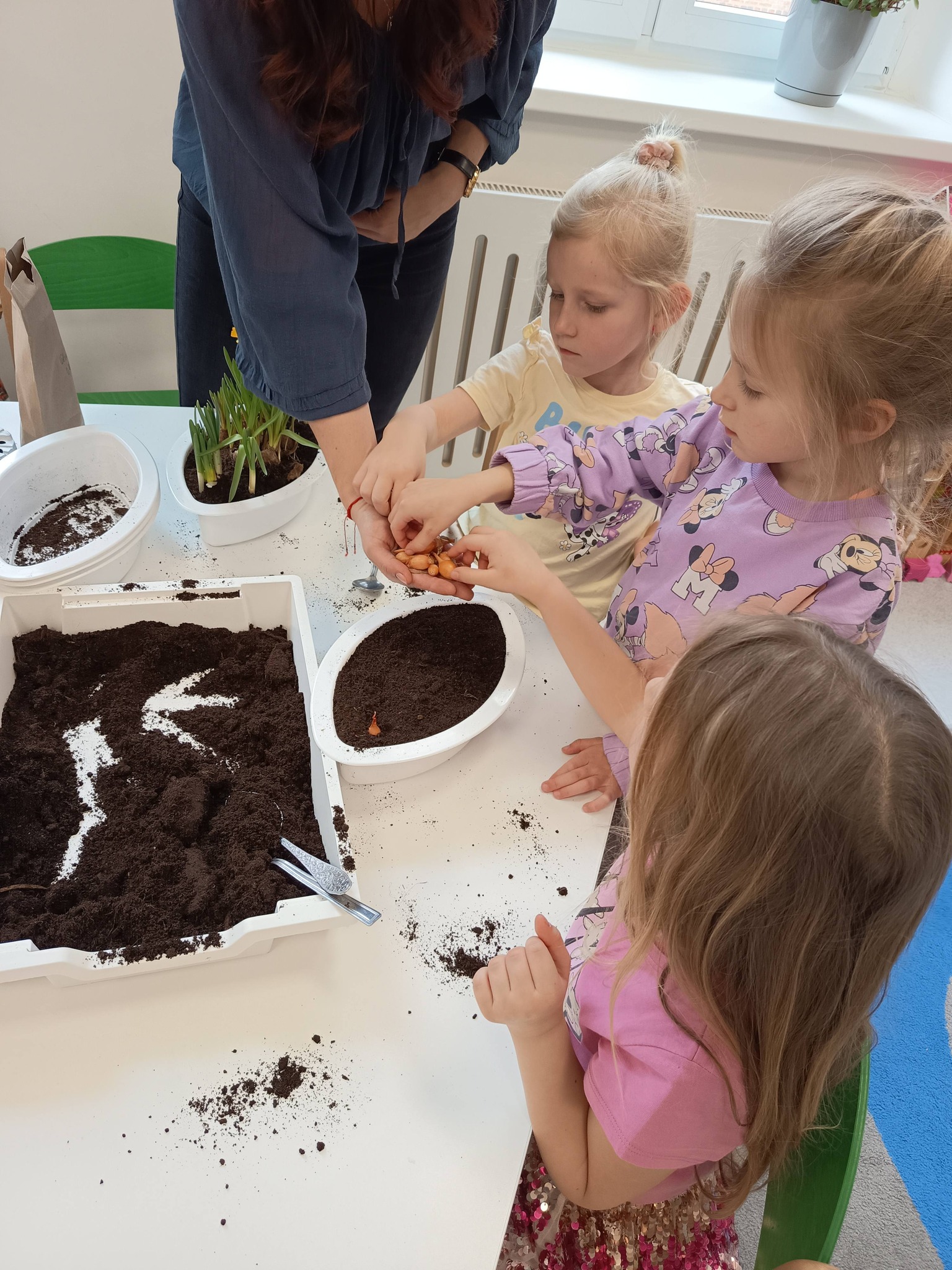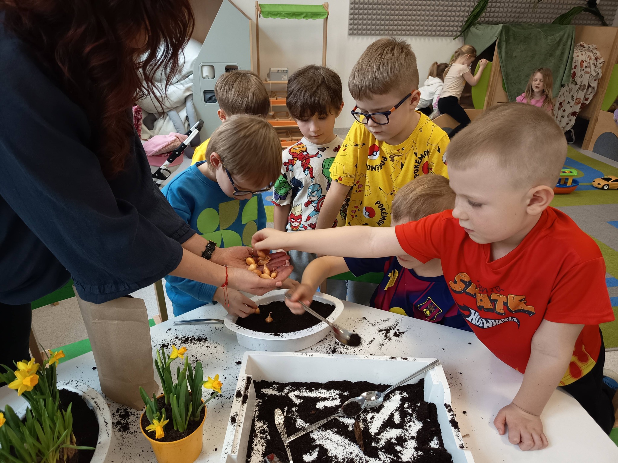 Przedszkolaki posadziły również cebulki, z których już wkrótce wyrośnie świeży szczypiorek. 🌱 Dzieci dowiedziały się, że będziemy mogli wykorzystać go później w kuchni – na kanapki lub do pysznej jajecznicy. To świetny sposób, aby zobaczyć, jak z małej cebulki wyrasta coś, co możemy potem zjeść! 🥪🍳