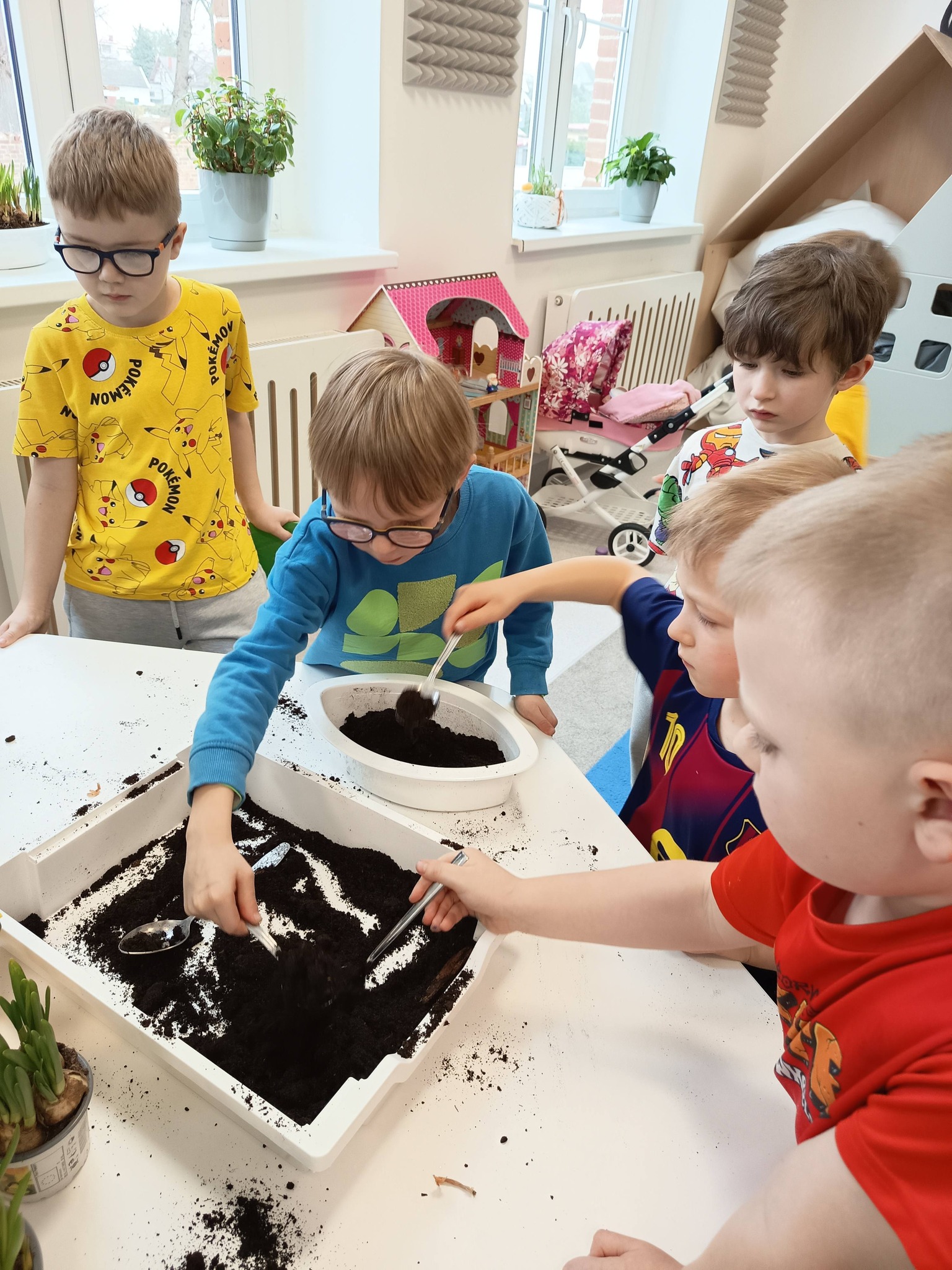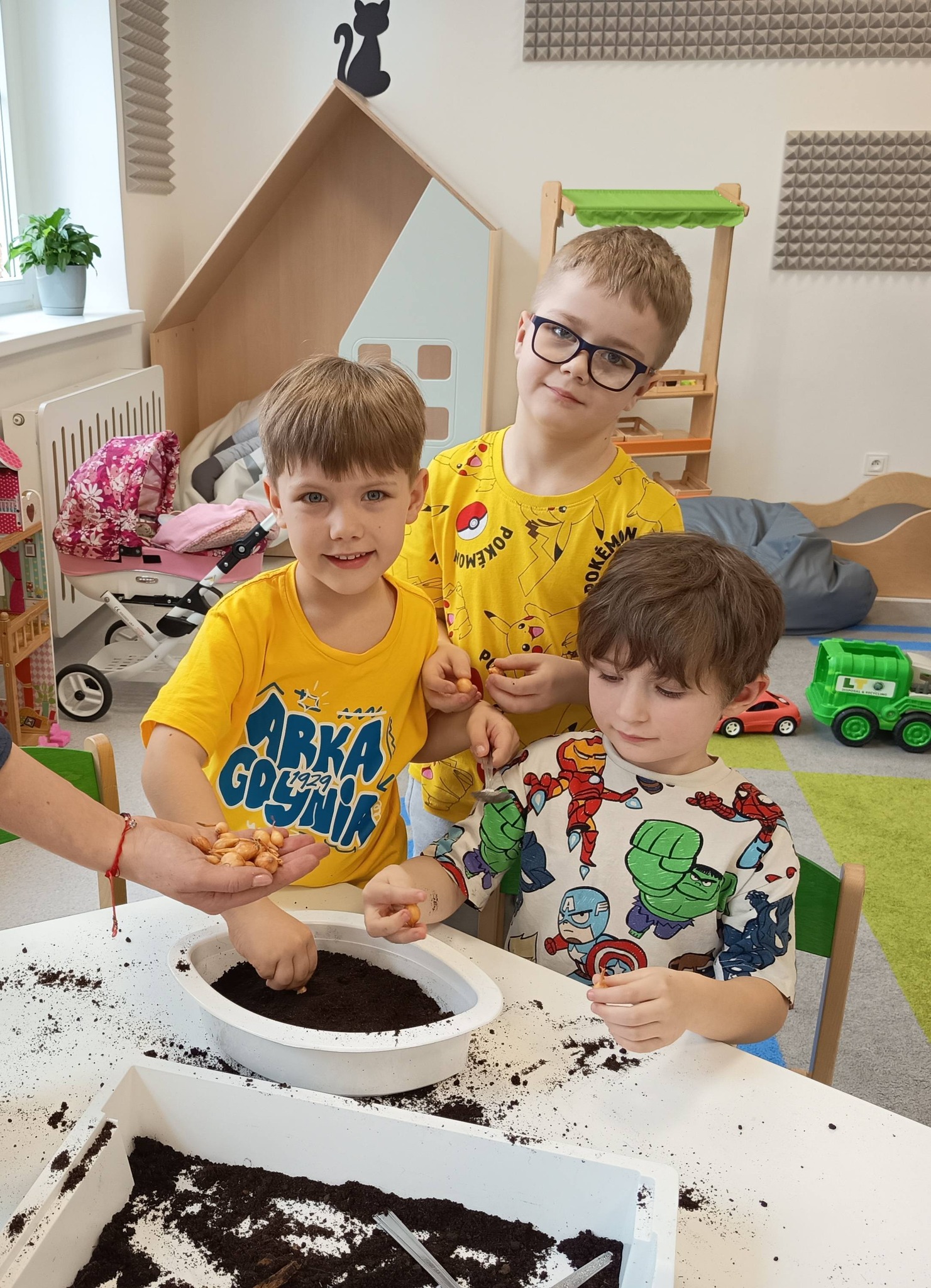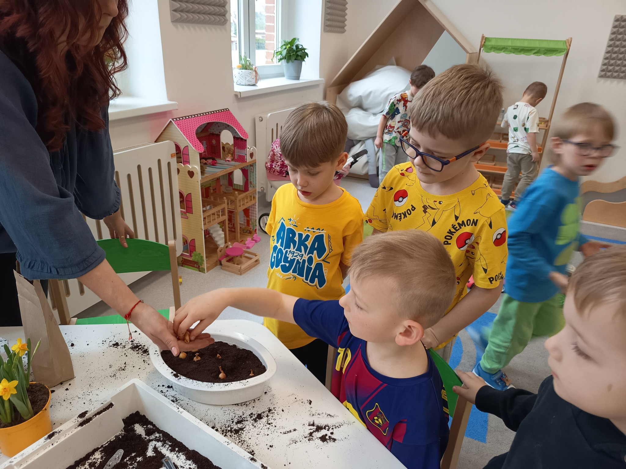 Przedszkolaki posadziły również cebulki, z których już wkrótce wyrośnie świeży szczypiorek. 🌱 Dzieci dowiedziały się, że będziemy mogli wykorzystać go później w kuchni – na kanapki lub do pysznej jajecznicy. To świetny sposób, aby zobaczyć, jak z małej cebulki wyrasta coś, co możemy potem zjeść! 🥪🍳