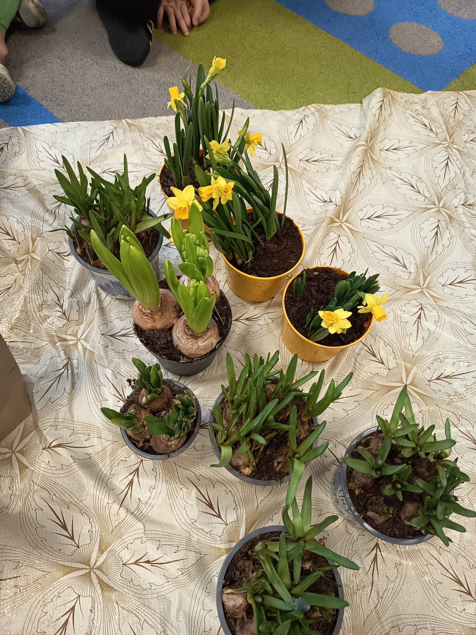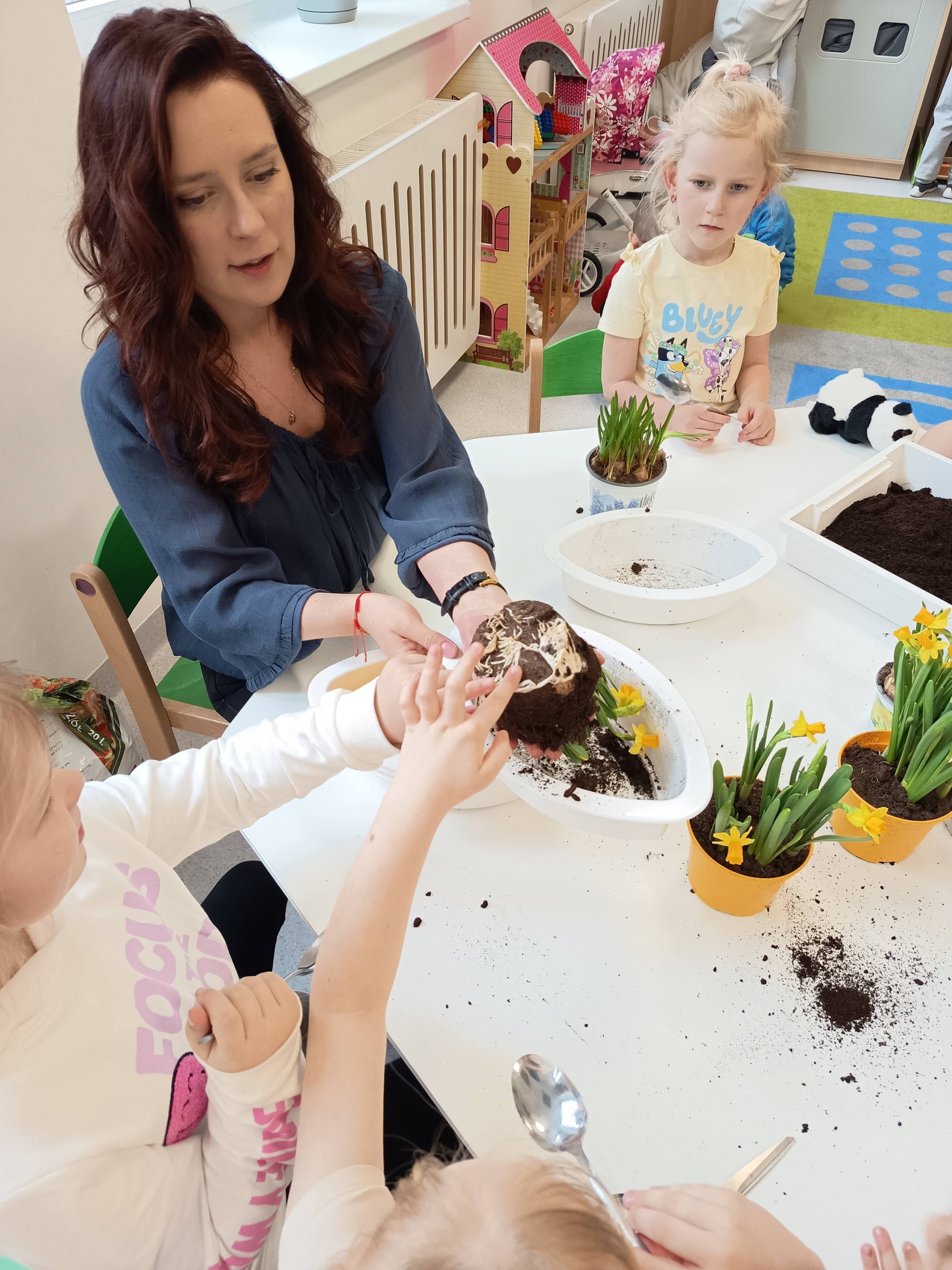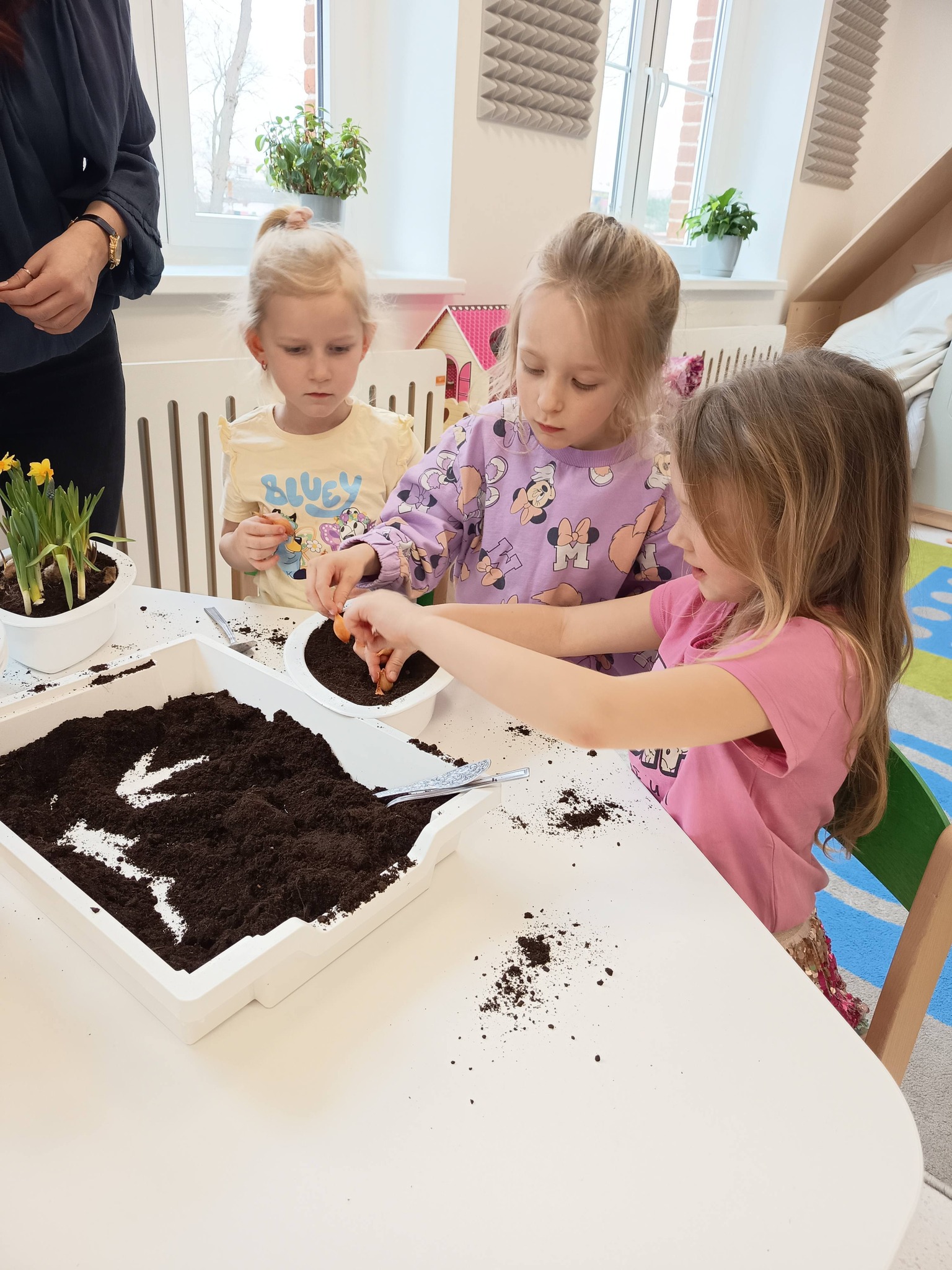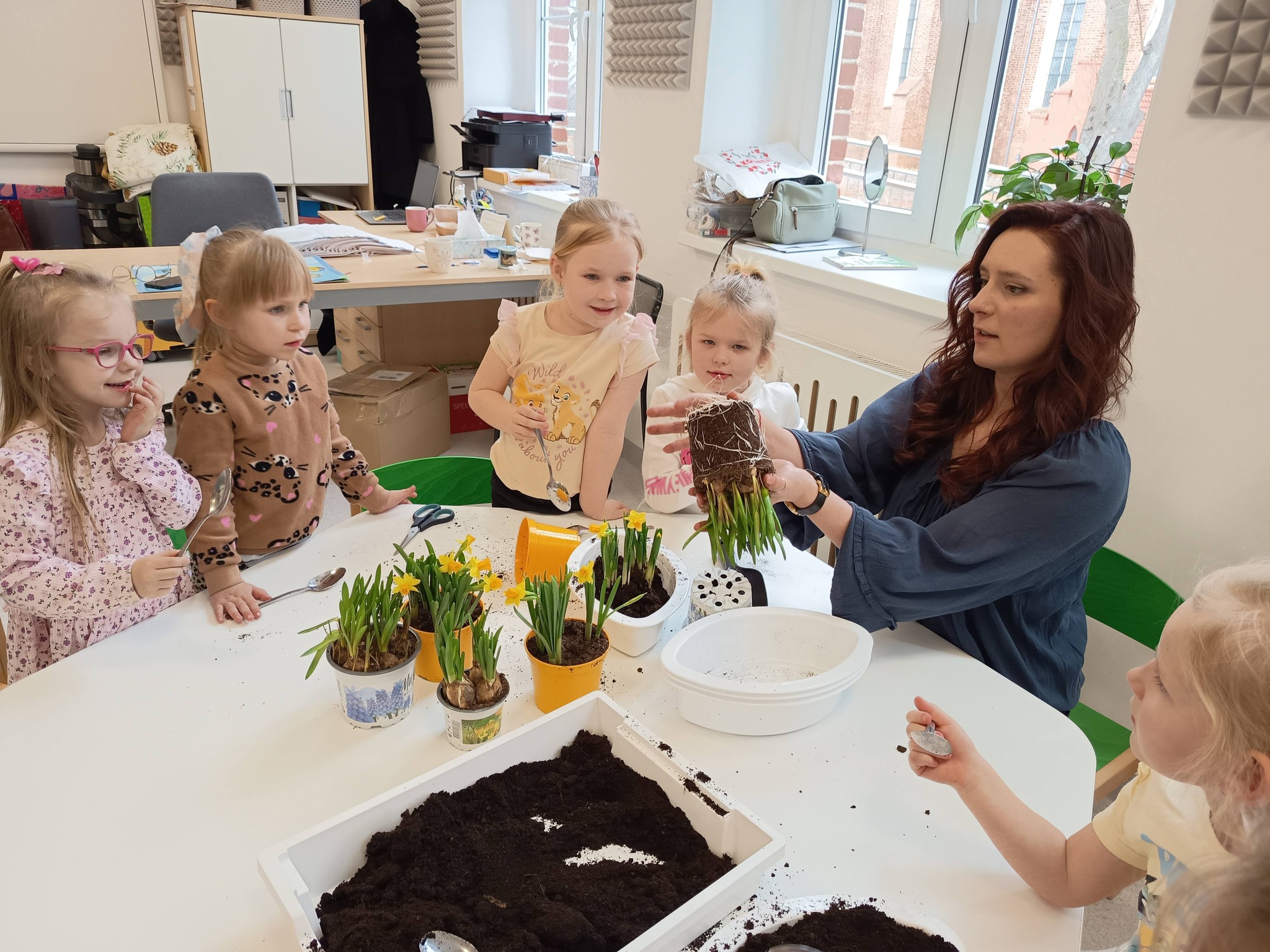 Przedszkolaki posadziły również cebulki, z których już wkrótce wyrośnie świeży szczypiorek. 🌱 Dzieci dowiedziały się, że będziemy mogli wykorzystać go później w kuchni – na kanapki lub do pysznej jajecznicy. To świetny sposób, aby zobaczyć, jak z małej cebulki wyrasta coś, co możemy potem zjeść! 🥪🍳