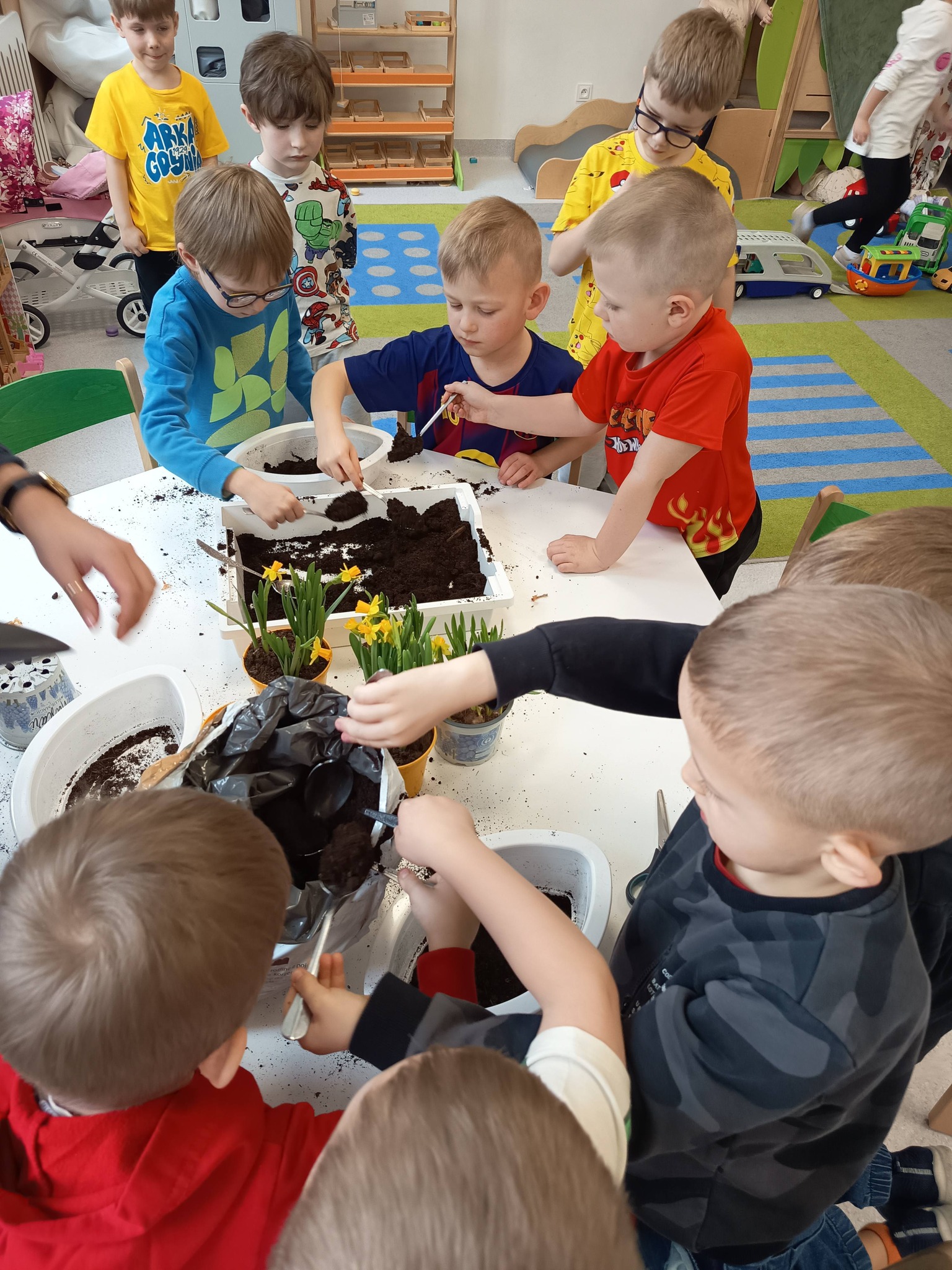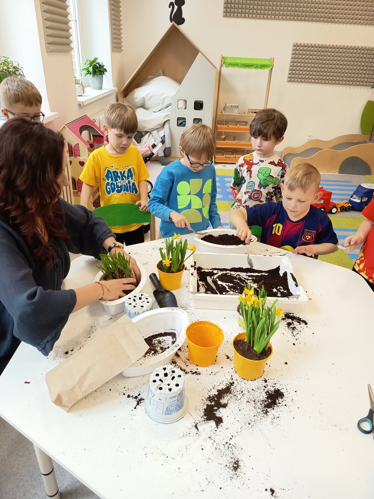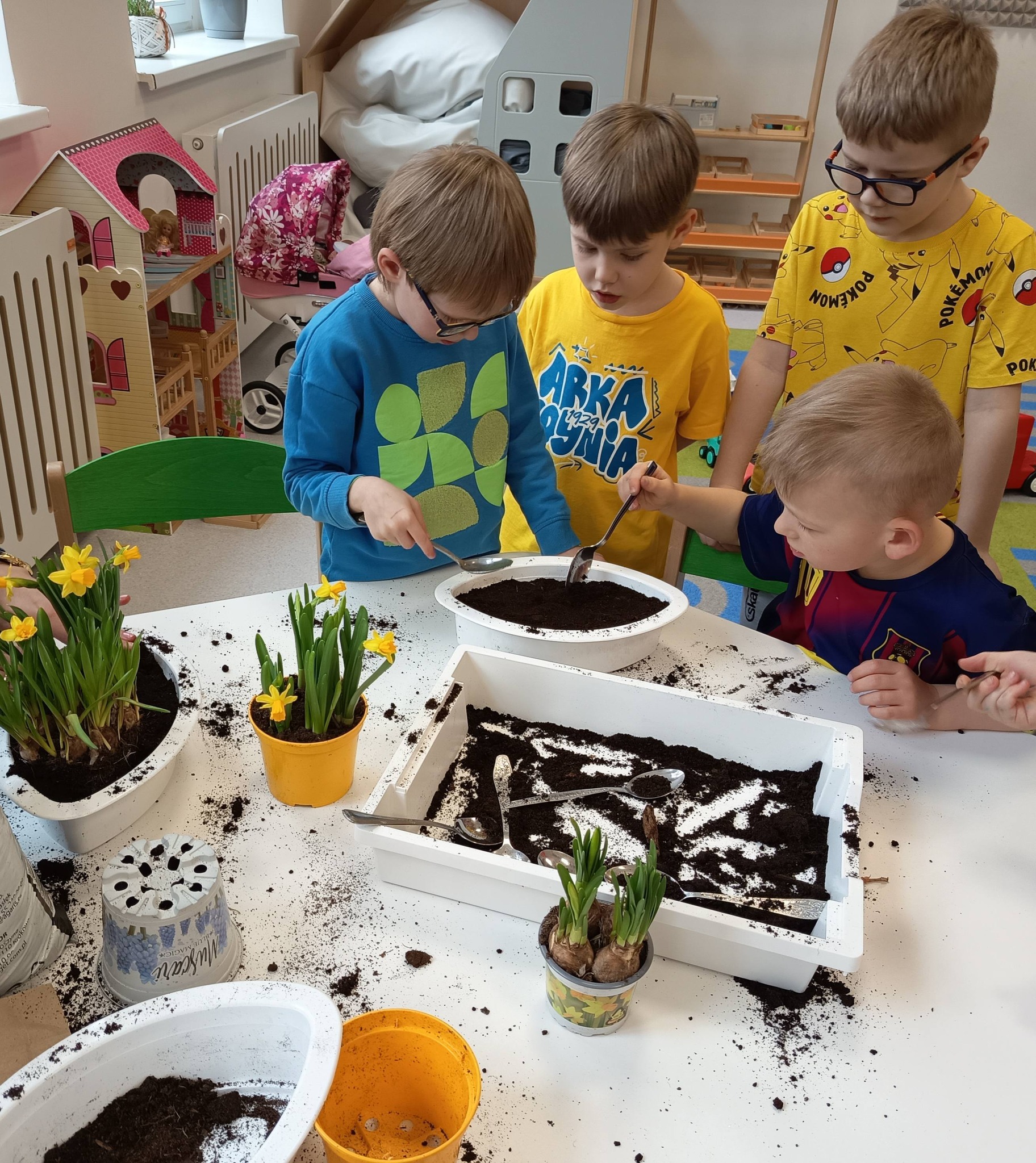 Nasze przedszkolaki z grupy Żabki zamieniły się dziś w małych ogrodników! 🌼 Dzieci z wielkim zaangażowaniem sadziły wiosenne kwiatki do doniczek. Było dużo radości, ziemi na rączkach i uśmiechów na twarzach. 😊