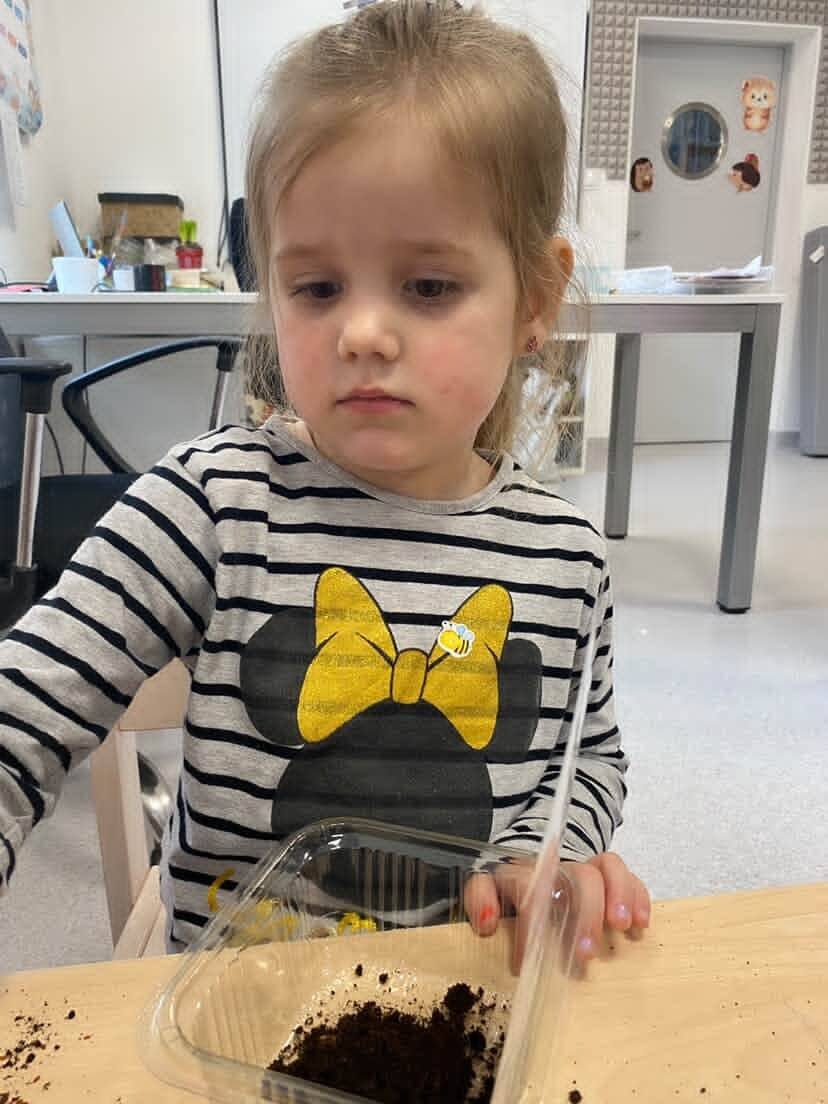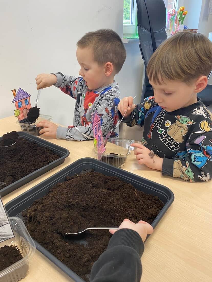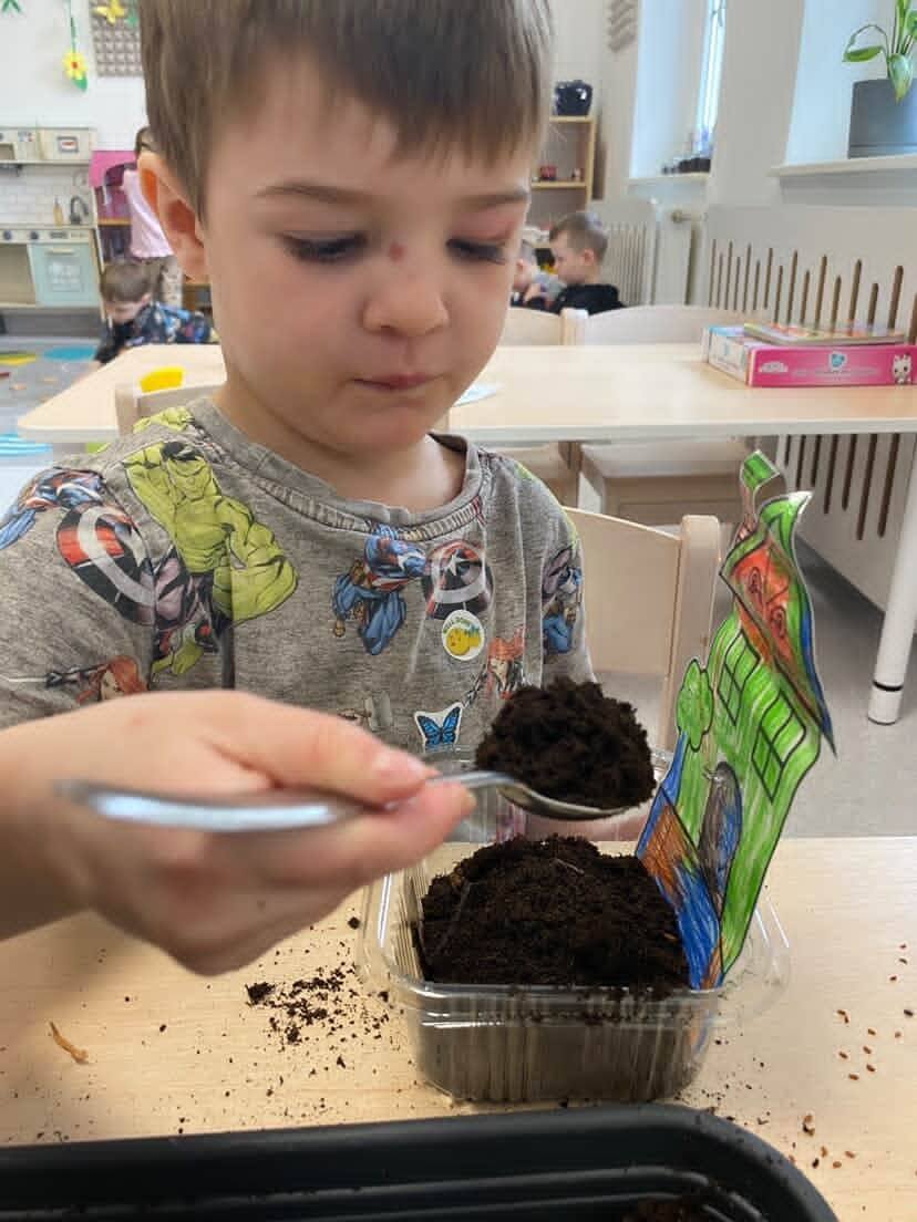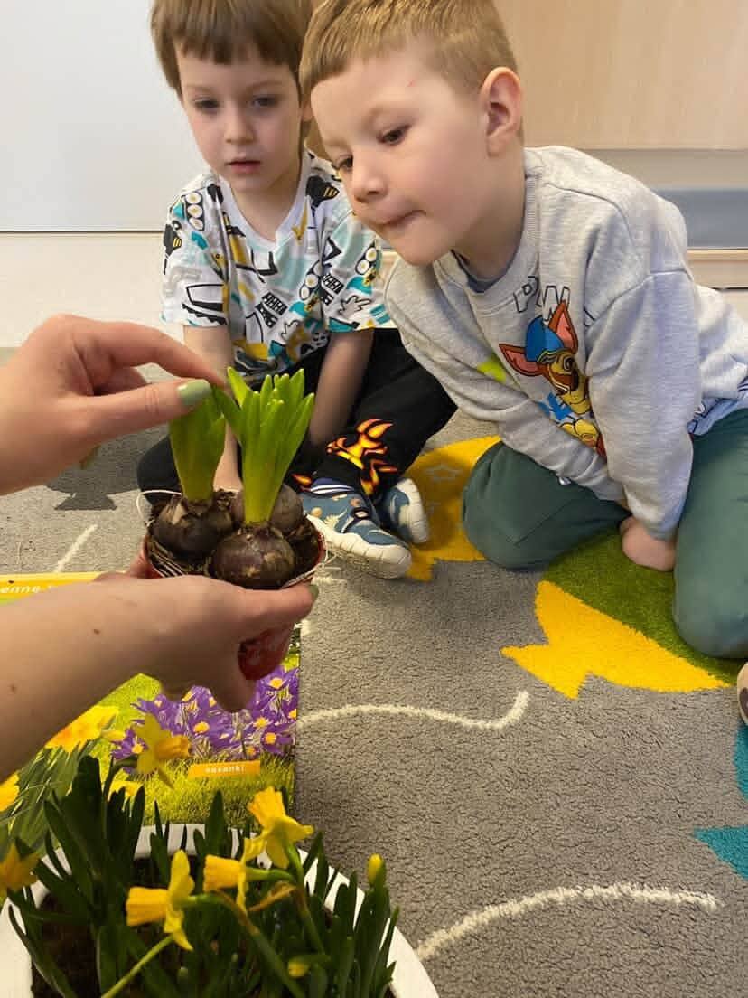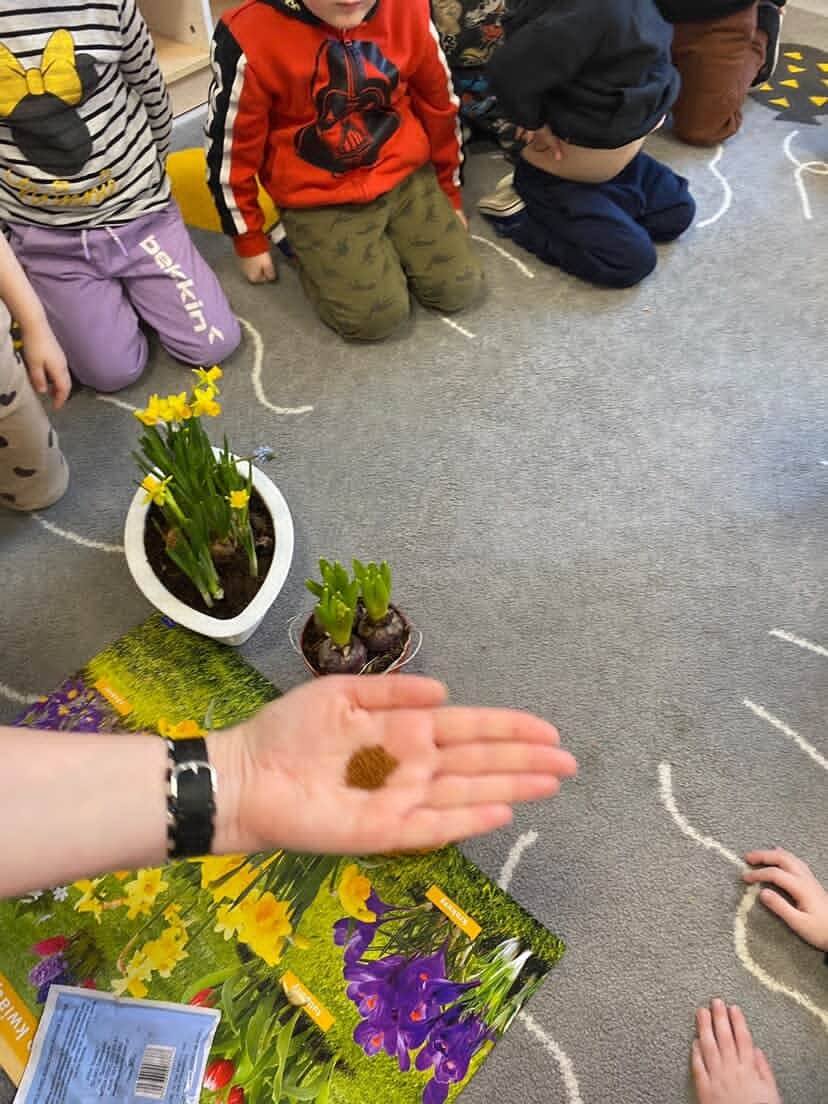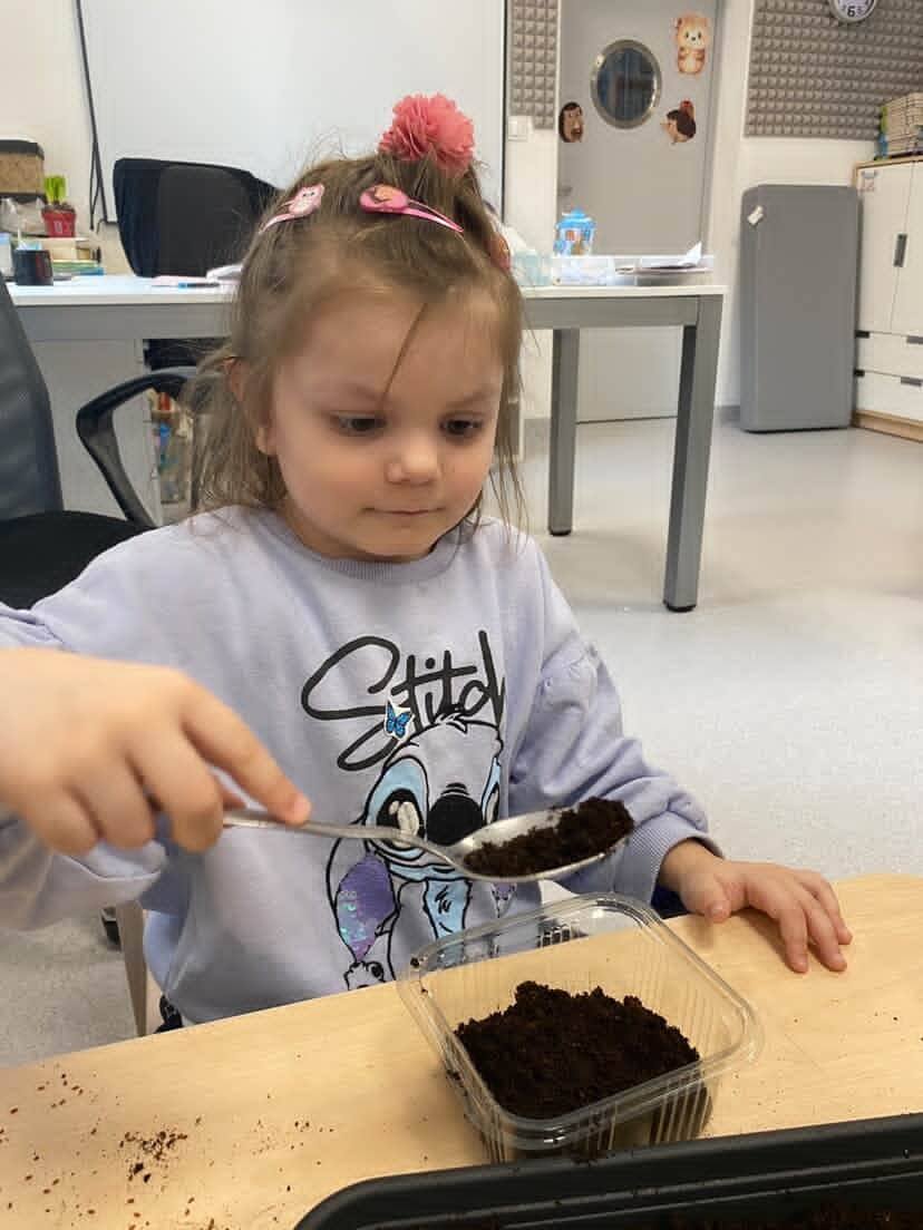 Podczas zajęć dzieci poznały tajemnice świata roślin – dowiedziały się, co jest potrzebne, aby rośliny mogły rosnąć i pięknie się rozwijać. Rozmawialiśmy o wodzie, słońcu, powietrzu i ziemi, a także o tym, że rośliny mogą wyrastać z nasionek i cebulek. Nasi mali ogrodnicy z wielkim zaangażowaniem sadzili cebulki lub nasiona 🌼 Każdy z dumą stworzył swój mały ogródek. Było dużo radości, ciekawości i świetnej zabawy!