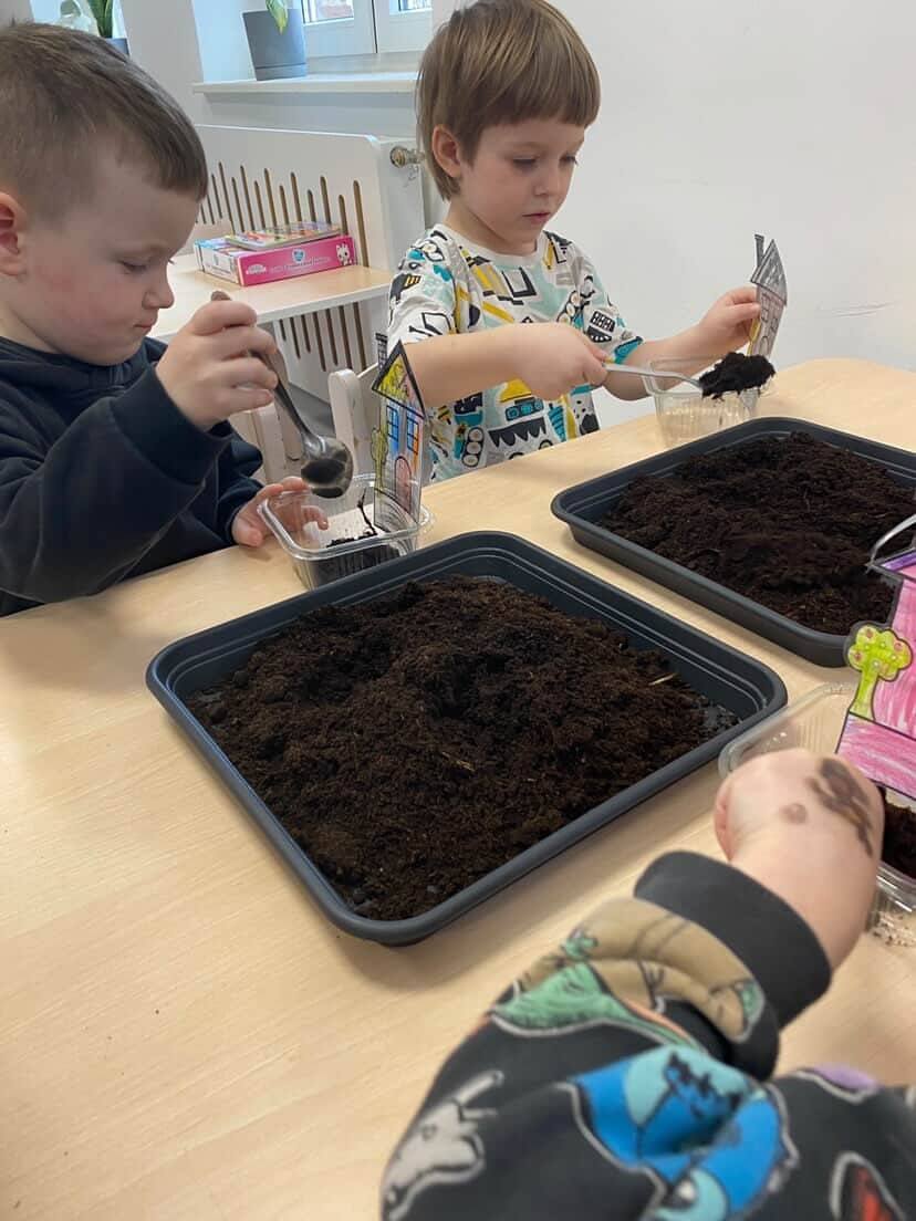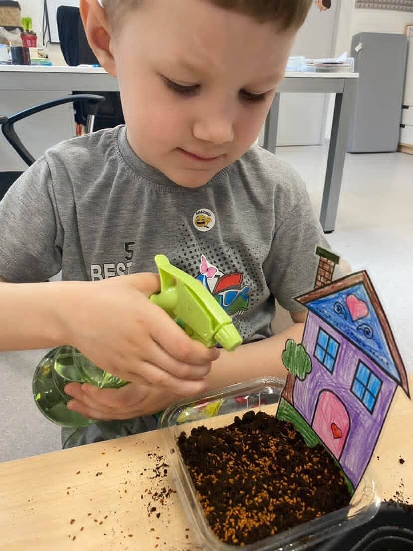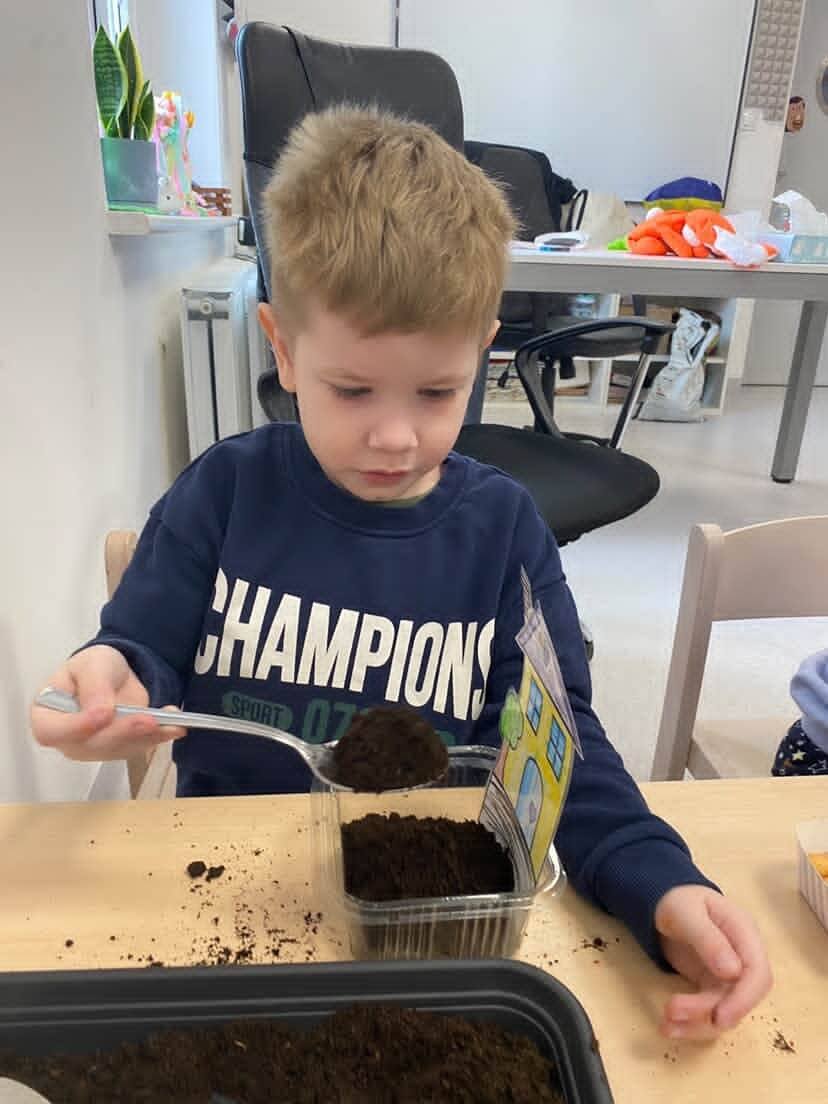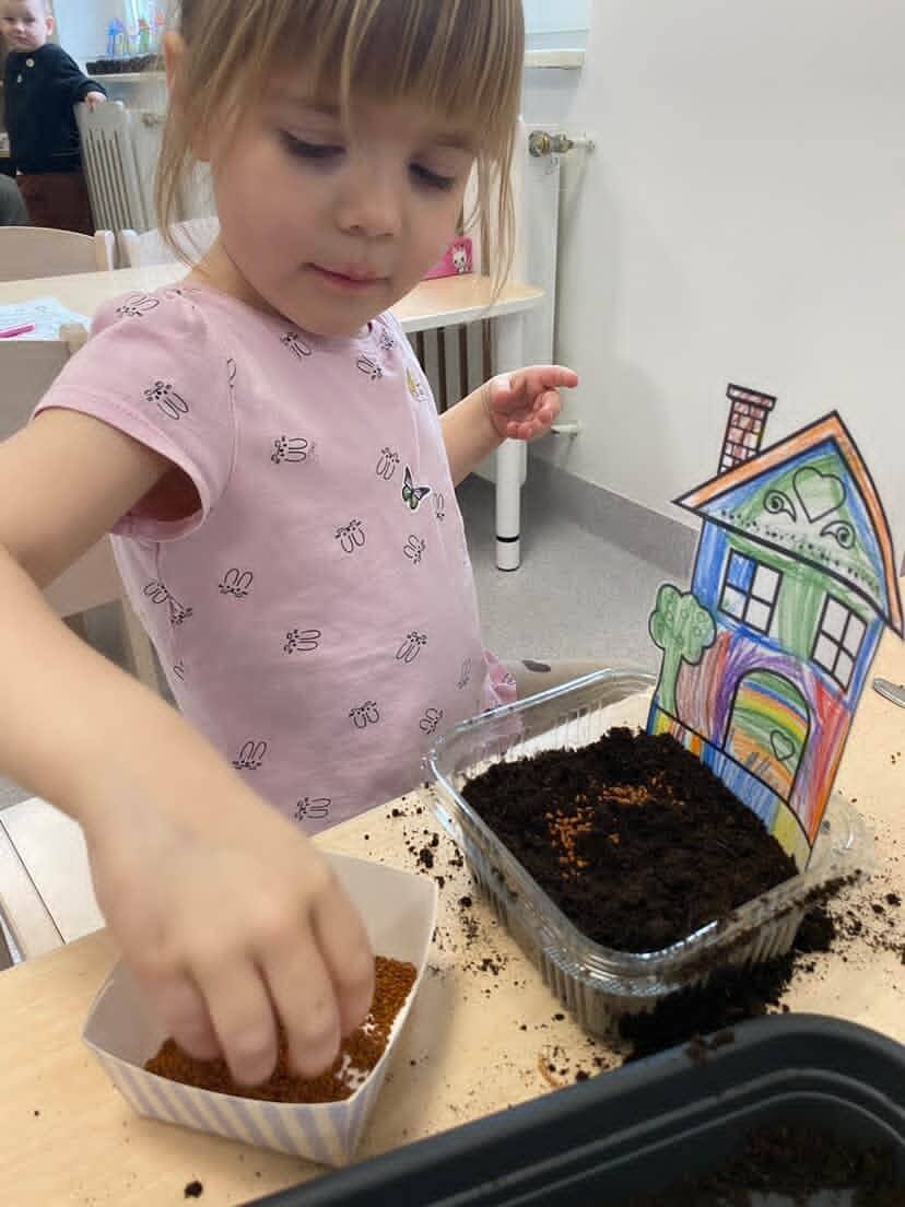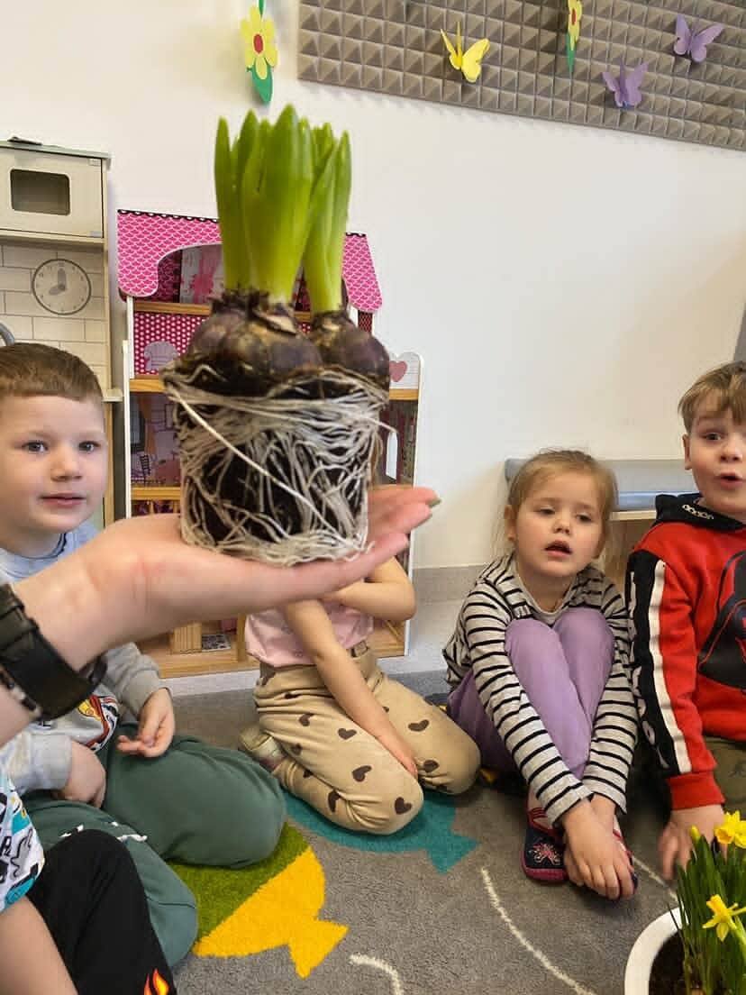 Podczas zajęć dzieci poznały tajemnice świata roślin – dowiedziały się, co jest potrzebne, aby rośliny mogły rosnąć i pięknie się rozwijać. Rozmawialiśmy o wodzie, słońcu, powietrzu i ziemi, a także o tym, że rośliny mogą wyrastać z nasionek i cebulek. Nasi mali ogrodnicy z wielkim zaangażowaniem sadzili cebulki lub nasiona 🌼 Każdy z dumą stworzył swój mały ogródek. Było dużo radości, ciekawości i świetnej zabawy!