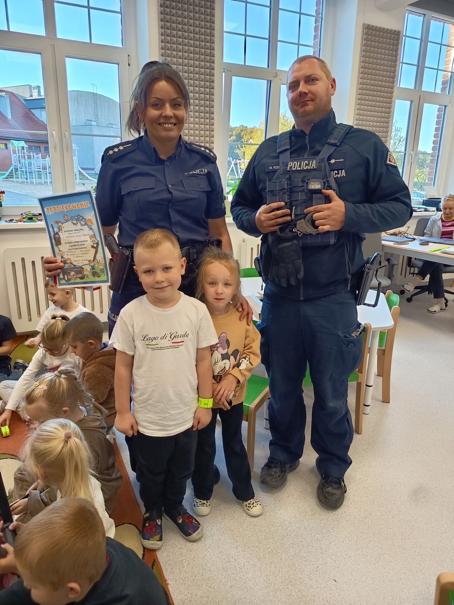 Grupy: Jeżyków, Żabek oraz Sówek uczestniczyły w bardzo interesującym spotkaniu z przedstawicielami krokowskiego komisariatu policji. Dzieci dowiedziały się co trzeba zrobić by być widocznym na drodze, jak poprawnie przechodzić przez jezdnię, dlaczego nie rozmawiamy z obcymi. Utrwaliły również numery alarmowe oraz zapoznały się z elementami umundurowania policjantów. Serdecznie dziękujemy przedstawicielom policji za poświęcony czas i rzeczowe przedstawienie tematy.