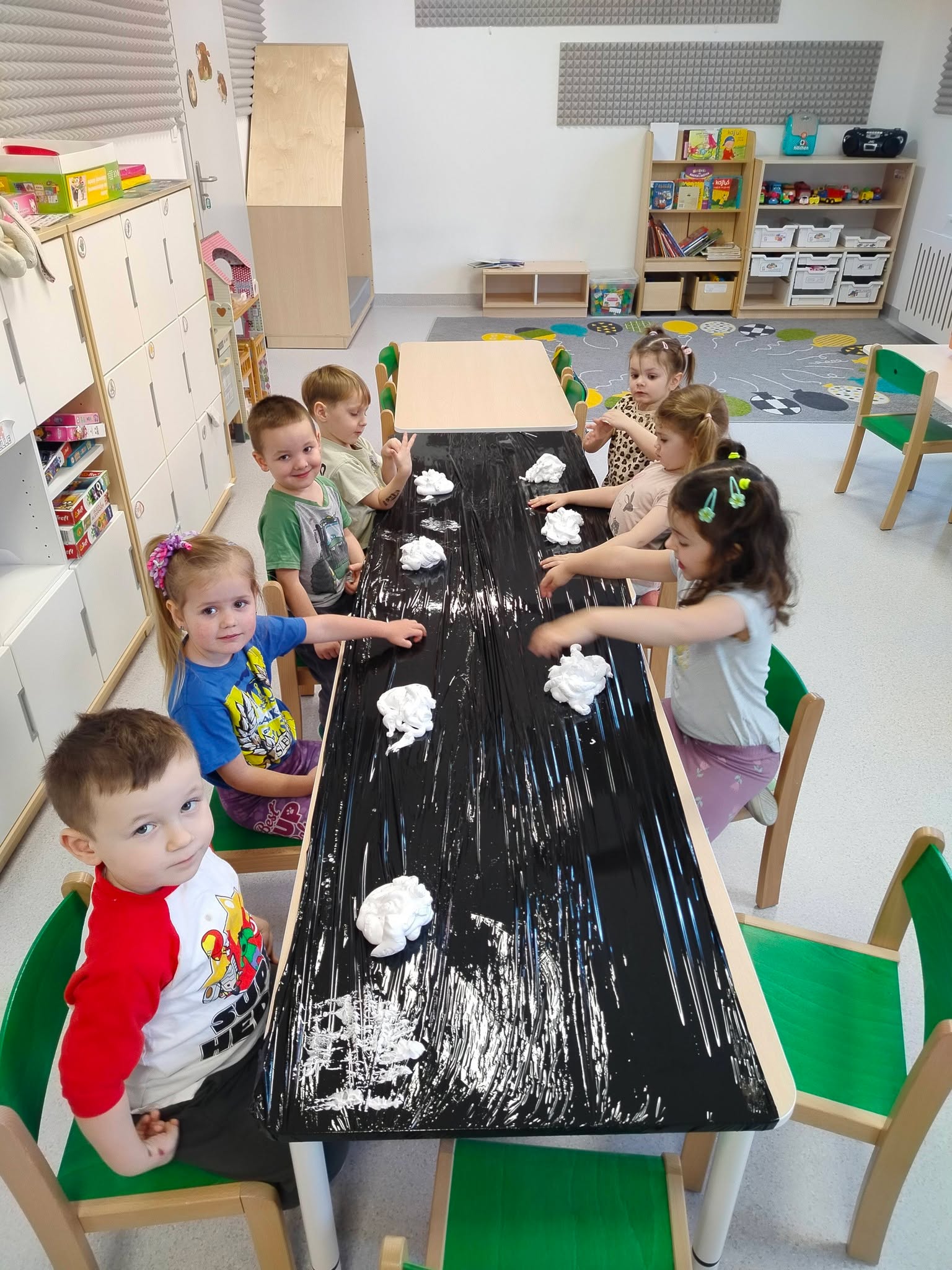 Jeżyki 🦔 – dzień pełen wrażeń! Dziś było sensorycznie i zimowo ❄️😄 Najpierw piankowe szaleństwo w sali – mazanie, ugniatanie i mnóstwo śmiechu, a potem wyjście na śnieg 🤩🌨️❄️