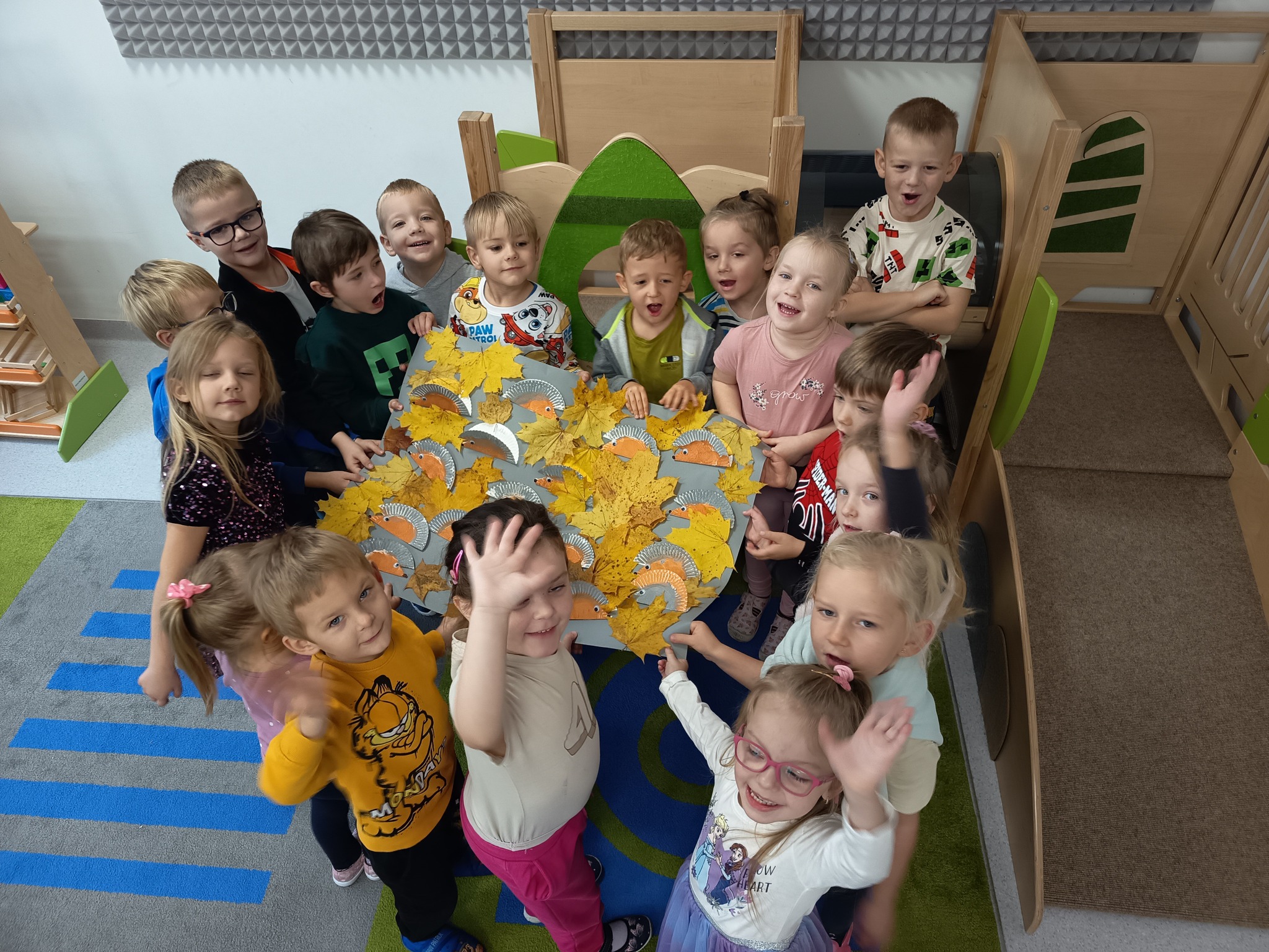 Jeżom najlepiej śpi się cieplutko w kopcu liści. Przedszkolaki z grupy Żabek stworzyły piękną pracę plastyczną.