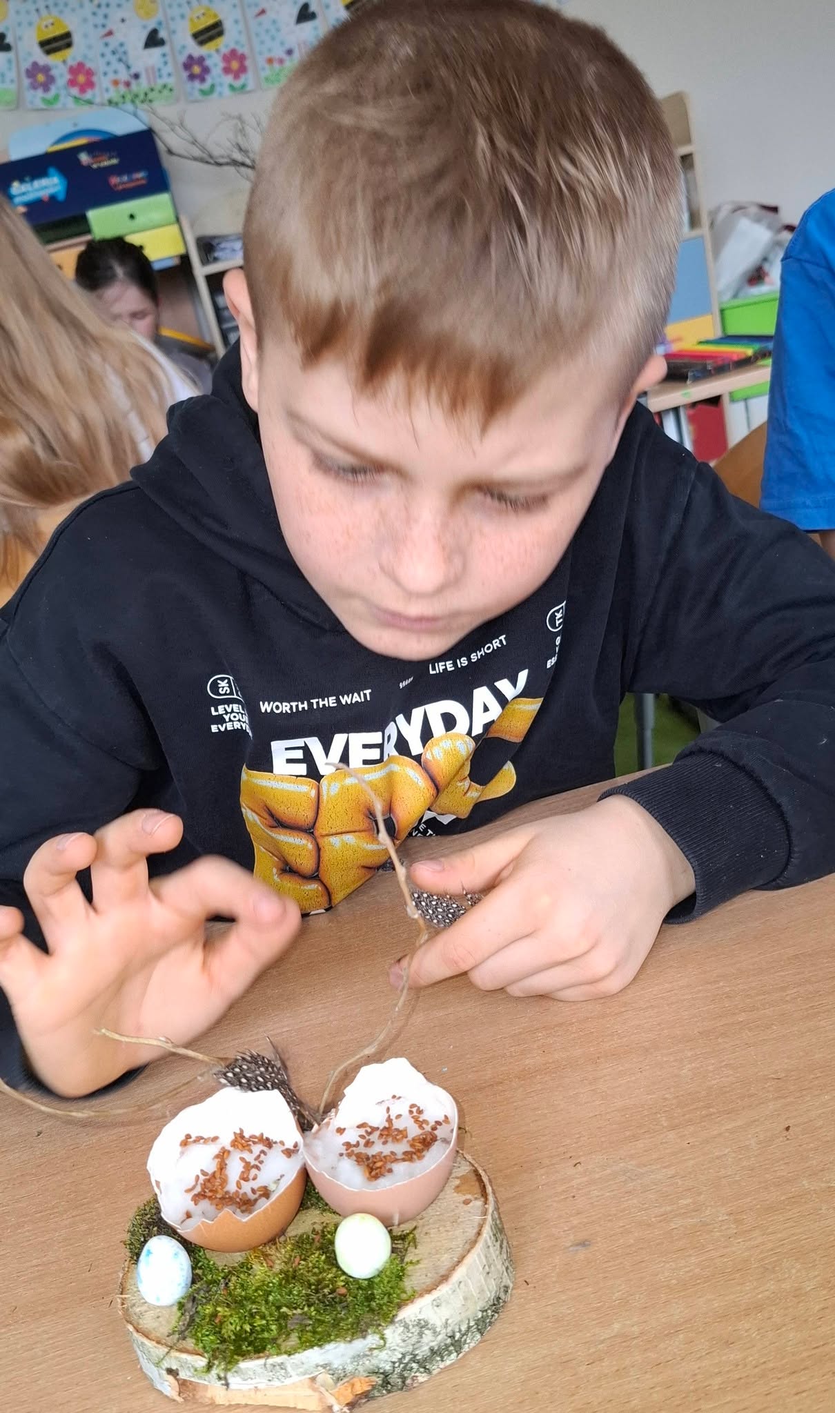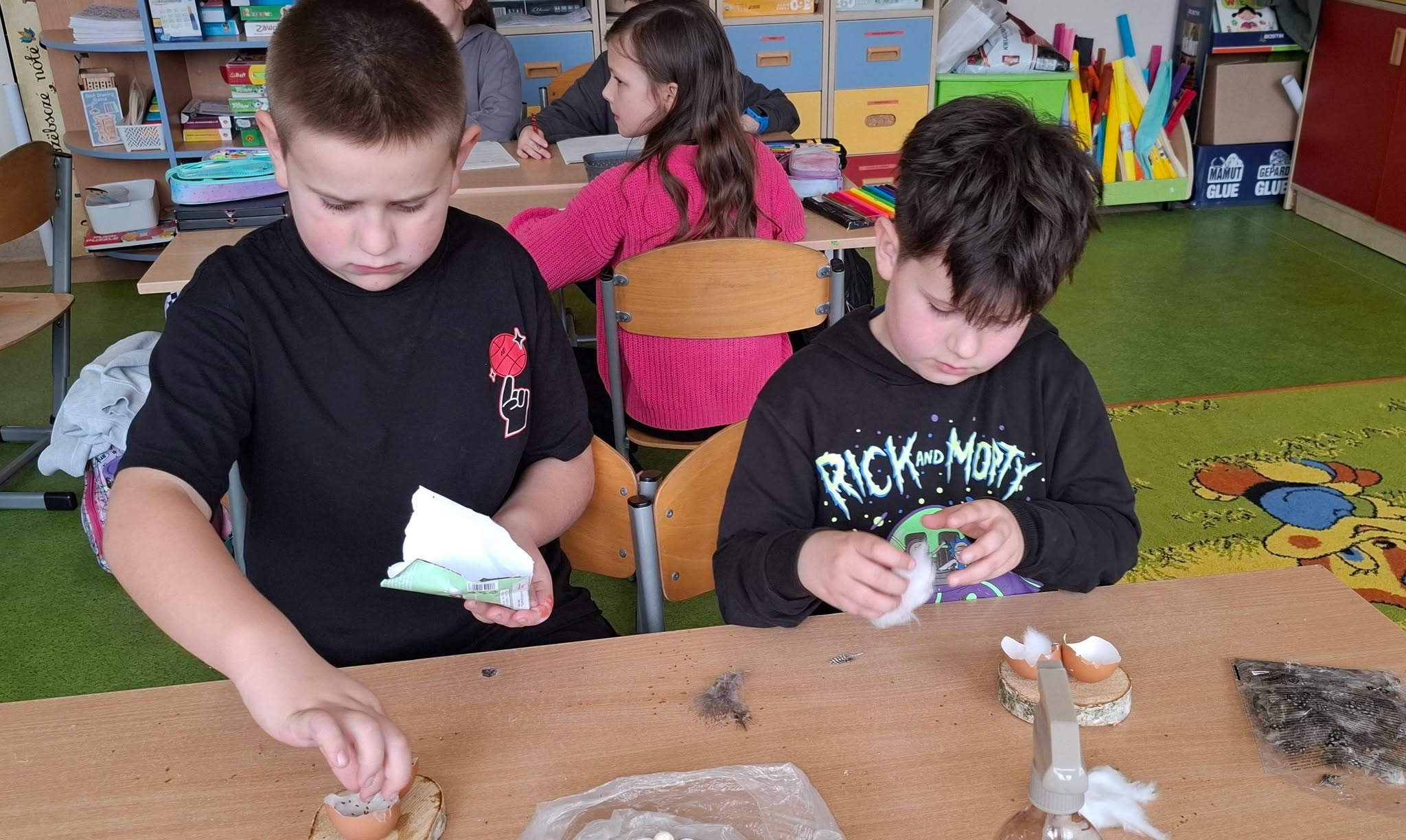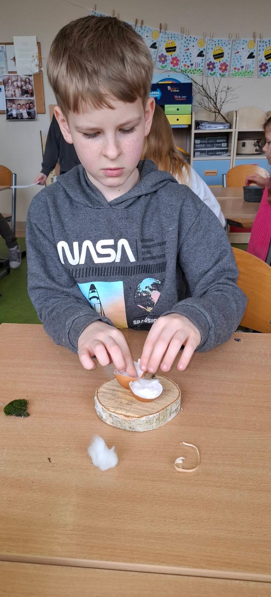 Uczniowie klasy 2A przygotowywali się do Wielkanocy, wykonując piękne i pomysłowe stroiki świąteczne 🌸🐰. W swoich pracach wykorzystali przede wszystkim materiały przyrodnicze – mech, gałązki, kawałki drewna oraz skorupki jajek 🌱🪵🥚. Stroiki zostały ozdobione rzeżuchą, delikatnymi piórkami i kolorowymi jajeczkami, co nadało im wyjątkowy, wiosenny charakter 🌼✨.