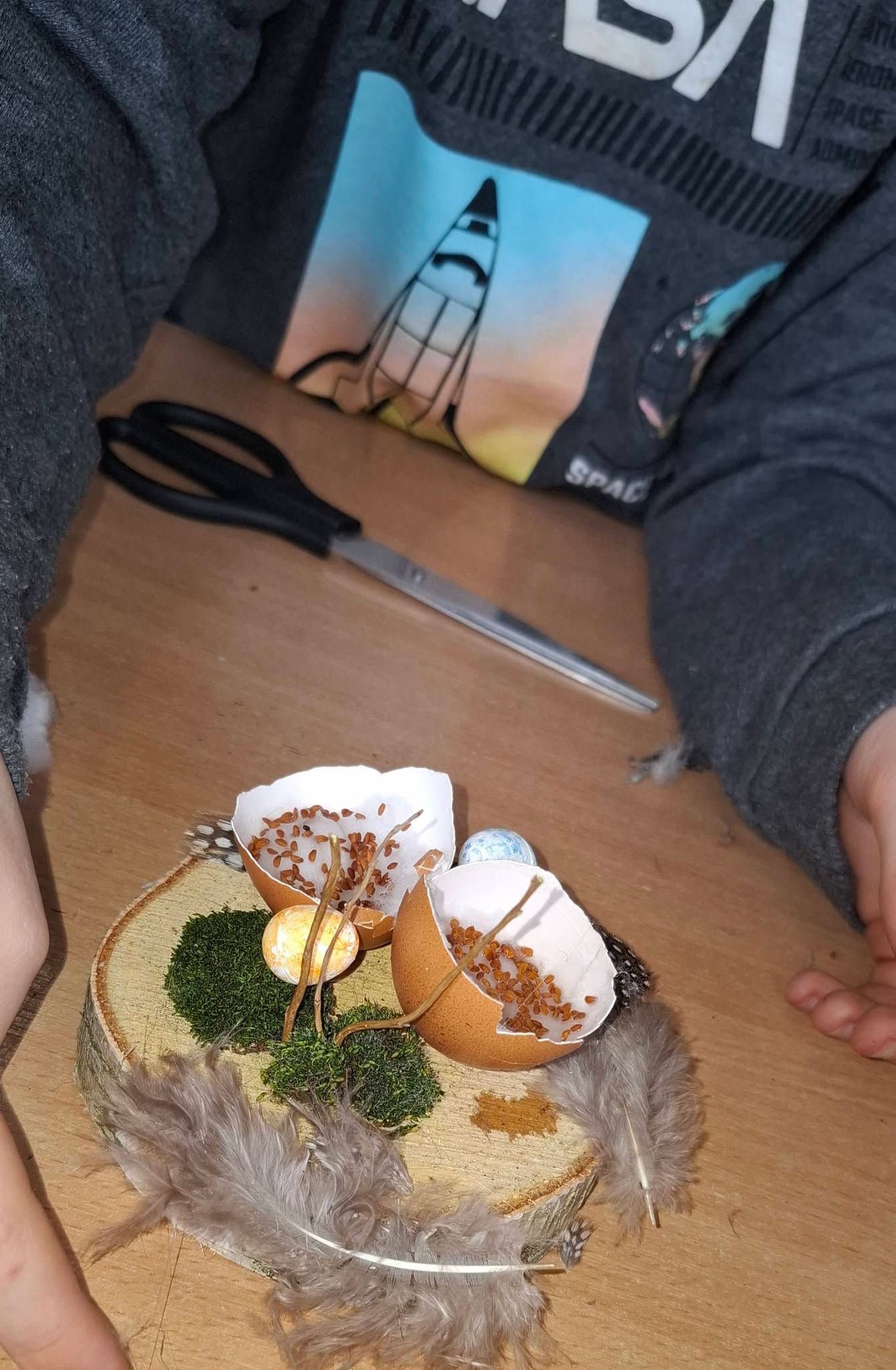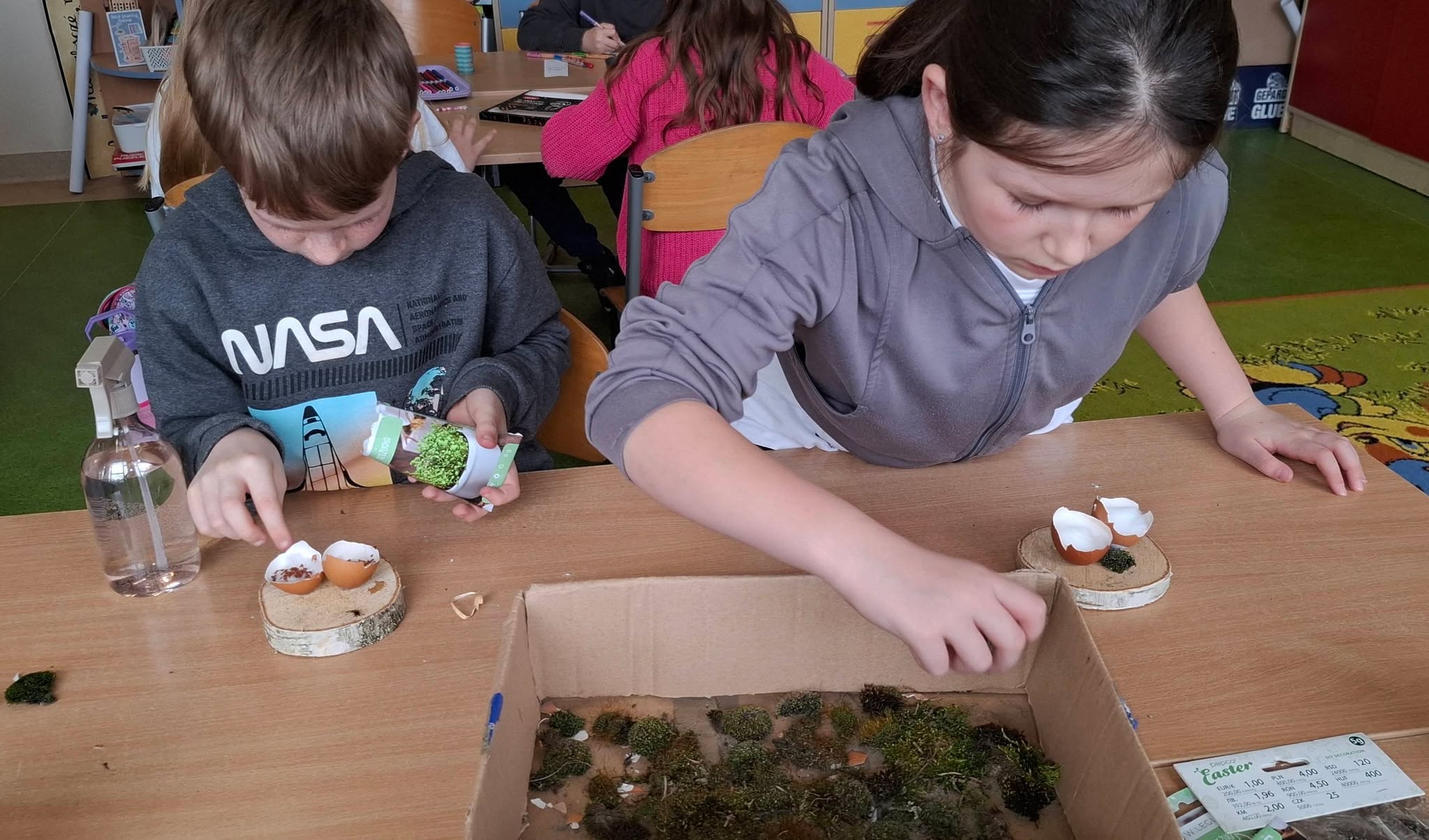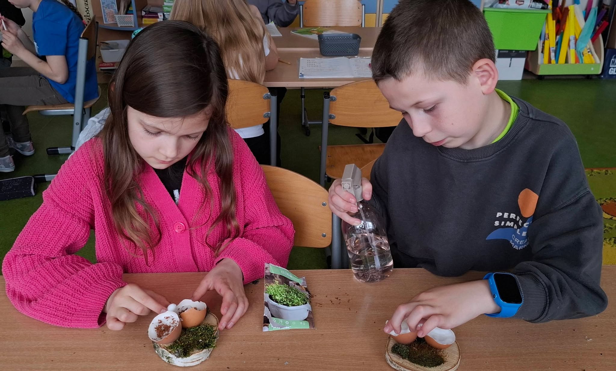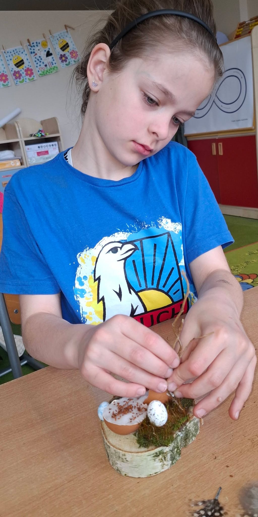 Uczniowie klasy 2A przygotowywali się do Wielkanocy, wykonując piękne i pomysłowe stroiki świąteczne 🌸🐰. W swoich pracach wykorzystali przede wszystkim materiały przyrodnicze – mech, gałązki, kawałki drewna oraz skorupki jajek 🌱🪵🥚. Stroiki zostały ozdobione rzeżuchą, delikatnymi piórkami i kolorowymi jajeczkami, co nadało im wyjątkowy, wiosenny charakter 🌼✨.