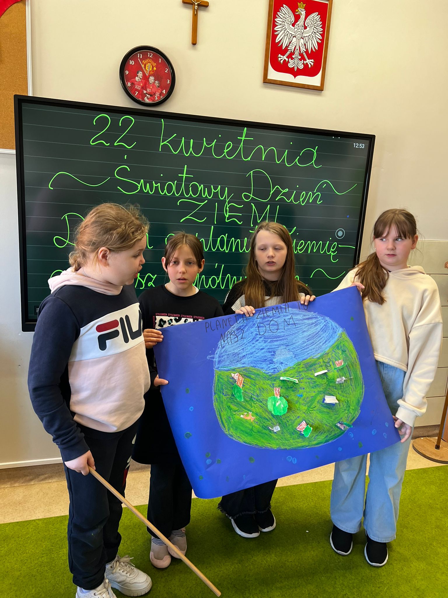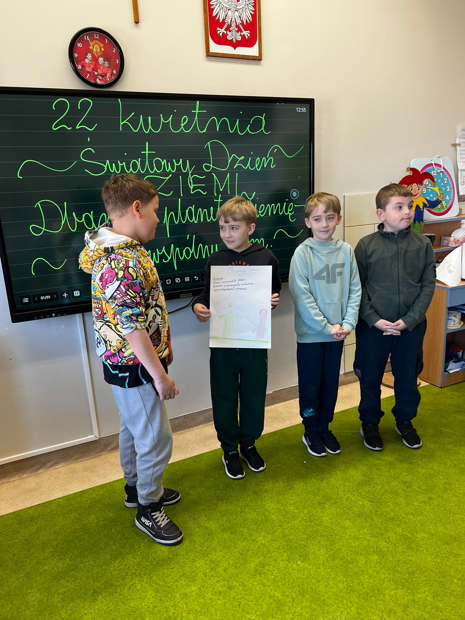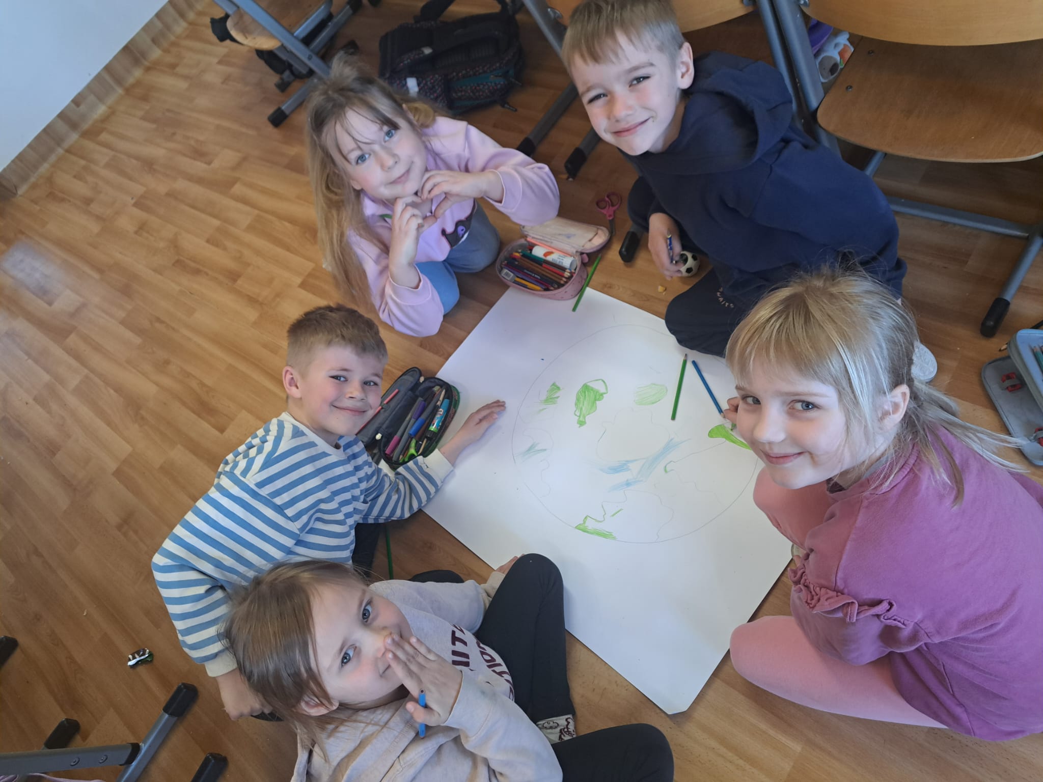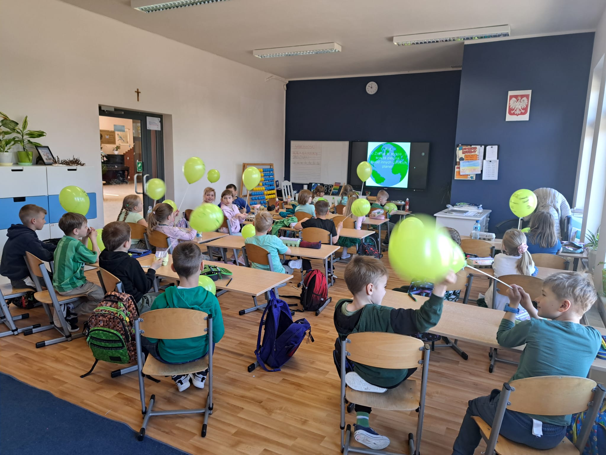 🌼 Pierwszoklasiści z ogromnym zaangażowaniem tworzyli kolorowe plakaty pt. „Jak dbać o nasz wspólny dom?”, pełne inspirujących pomysłów na ochronę przyrody. Następnie wyruszyli na pełną emocji wyprawę w poszukiwaniu „skarbów natury”, odkrywając piękno otaczającego świata. Z zebranych darów przyrody układali w grupach hasło tegorocznych obchodów, rozwijając przy tym współpracę i kreatywność. Dzień zakończyli radosnym śpiewem piosenki „Ziemia – wyspa zielona”.