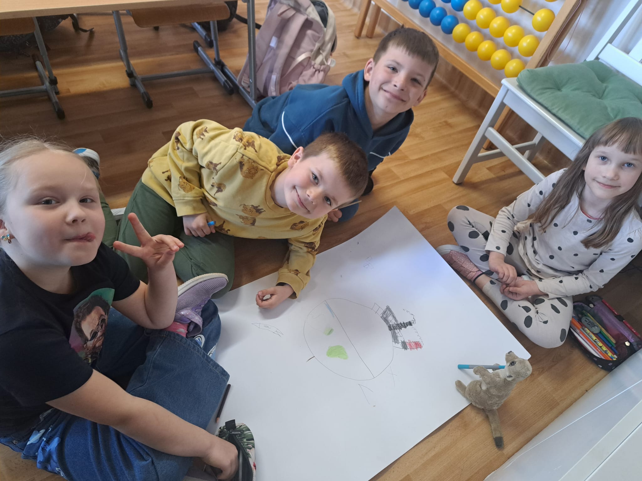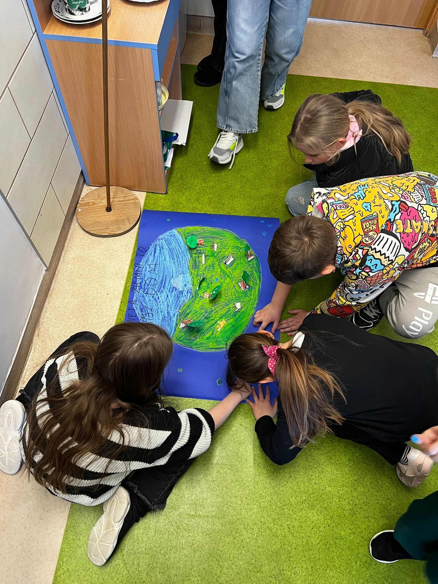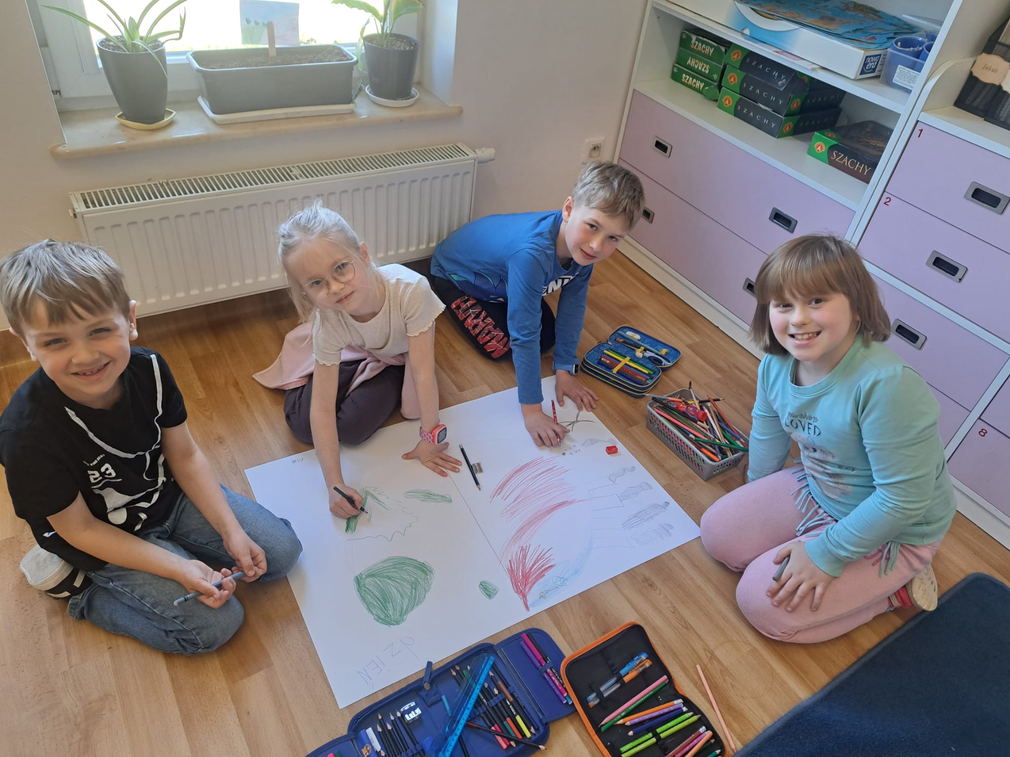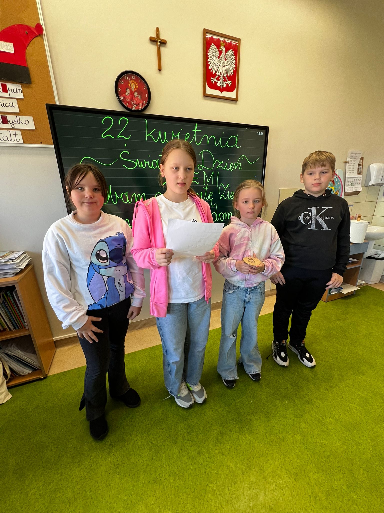 🌼 Pierwszoklasiści z ogromnym zaangażowaniem tworzyli kolorowe plakaty pt. „Jak dbać o nasz wspólny dom?”, pełne inspirujących pomysłów na ochronę przyrody. Następnie wyruszyli na pełną emocji wyprawę w poszukiwaniu „skarbów natury”, odkrywając piękno otaczającego świata. Z zebranych darów przyrody układali w grupach hasło tegorocznych obchodów, rozwijając przy tym współpracę i kreatywność. Dzień zakończyli radosnym śpiewem piosenki „Ziemia – wyspa zielona”.