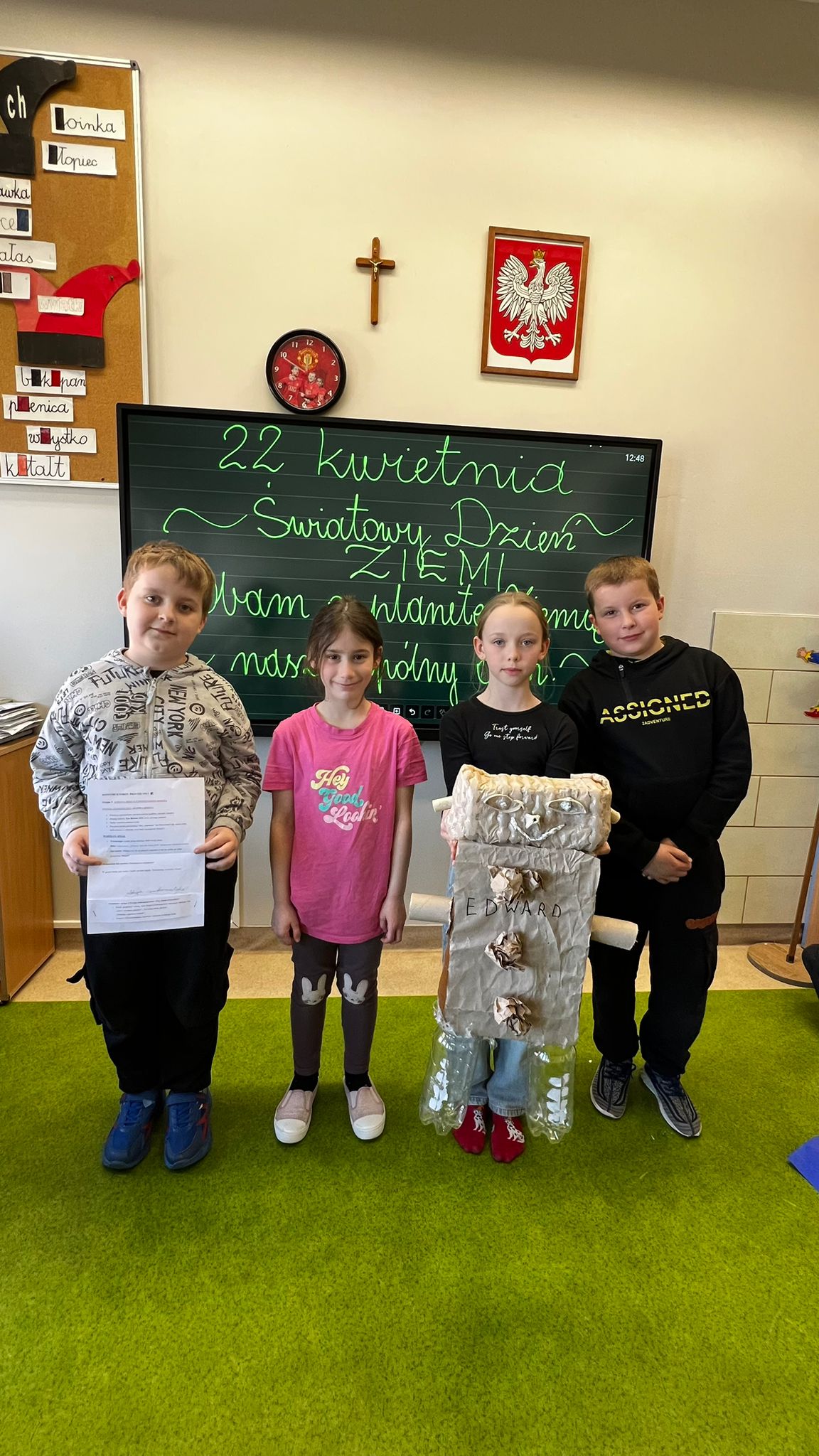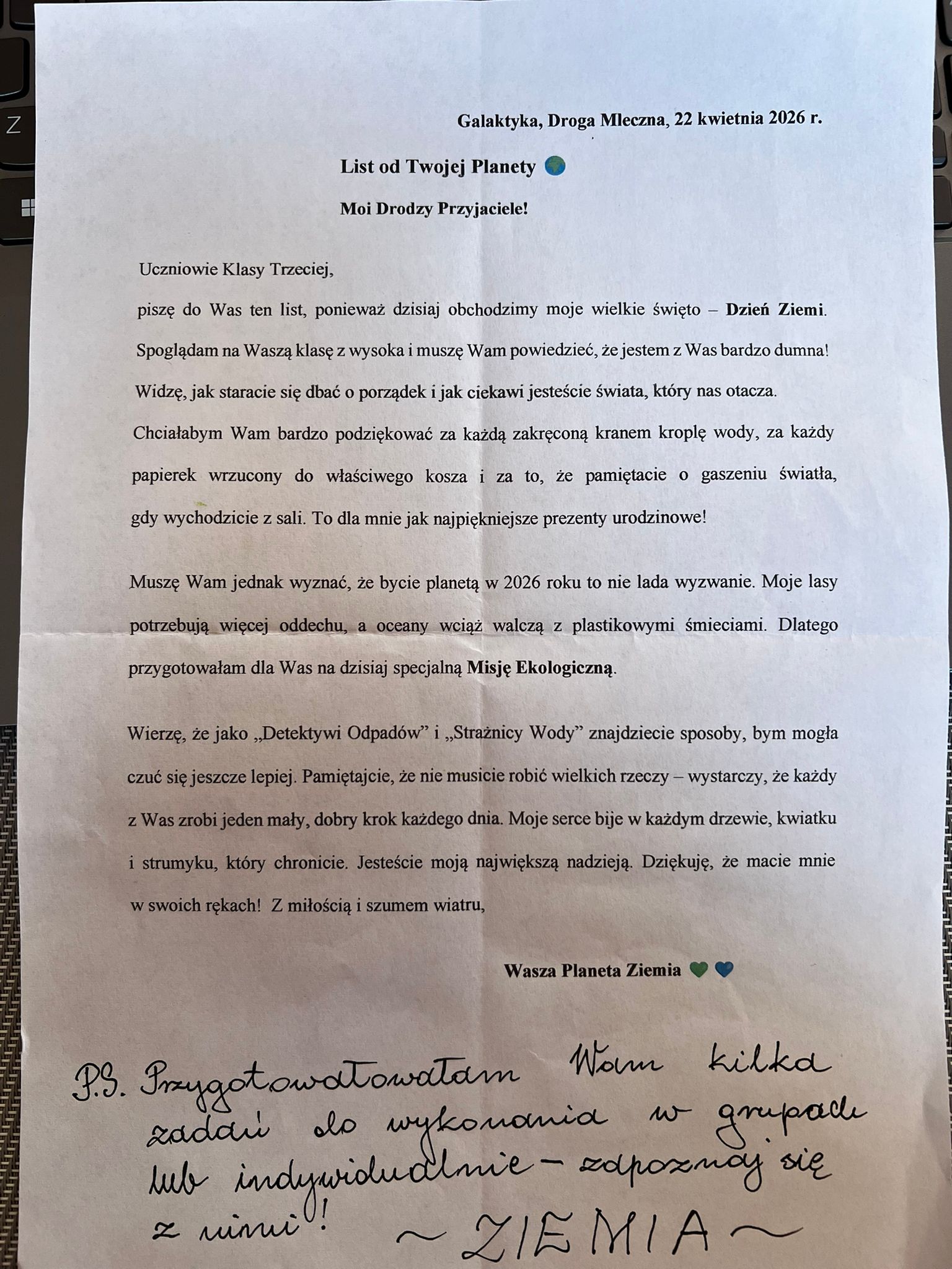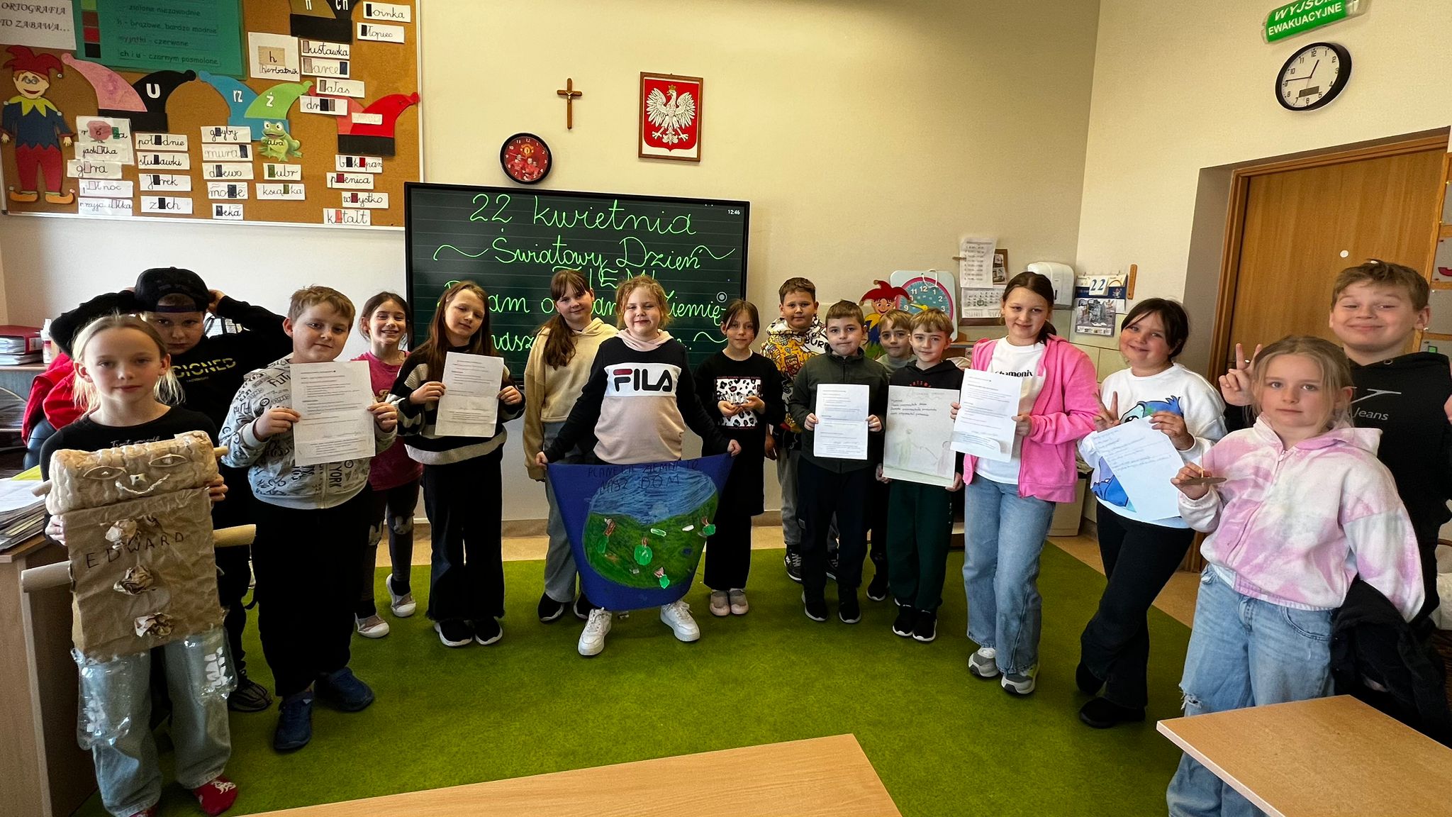 ♻️ Trzecioklasiści rozpoczęli dzień od tajemniczego „Listu od Ziemi”, który zmotywował ich do wspólnego działania na rzecz naszej planety. Następnie, podzieleni na grupy, realizowali różnorodne zadania łączące ekologię z kreatywnością i nowoczesnym podejściem do nauki. Uczniowie przygotowywali własne projekty, tworząc elementy „Encyklopedii Ratowania Ziemi”, a także wykorzystywali materiały z recyklingu do budowy ciekawych konstrukcji, rozwijając wyobraźnię i umiejętność współpracy. Nie zabrakło również działań badawczych – dzieci prowadziły obserwacje i proste analizy dotyczące codziennych nawyków proekologicznych, ucząc się, jak nawet drobne zmiany mogą wpływać na środowisko. Ważnym elementem dnia była także aktywność fizyczna na świeżym powietrzu – podczas ekologicznych zabaw i zadań ruchowych utrwalały zasady dbania o planetę w radosny i angażujący sposób. Na zakończenie wszyscy wspólnie stworzyli klasowy „Pakt dla Ziemi”, symbolicznie potwierdzając swoje zaangażowanie w ochronę środowiska i troskę o przyszłość naszej planety.