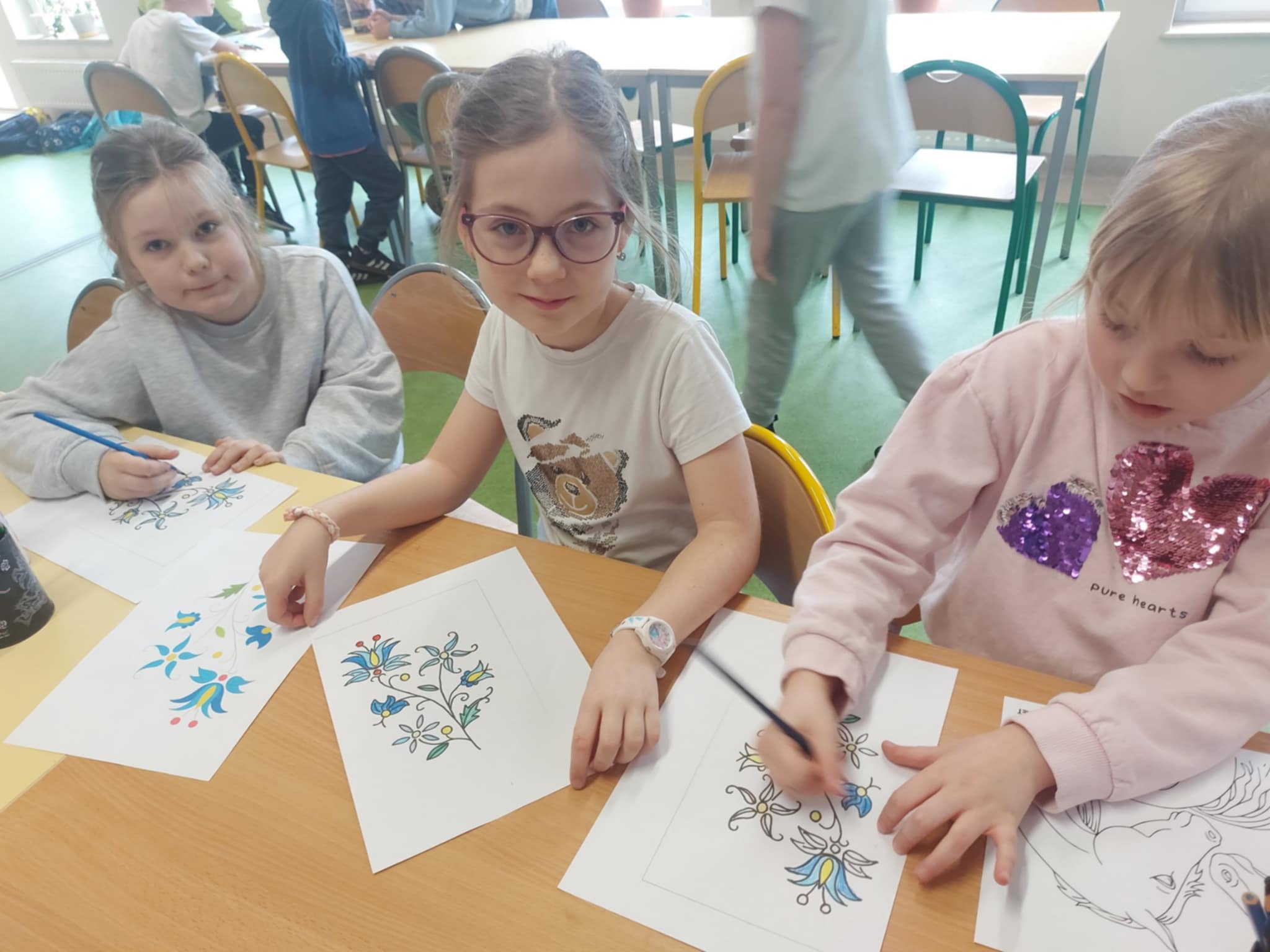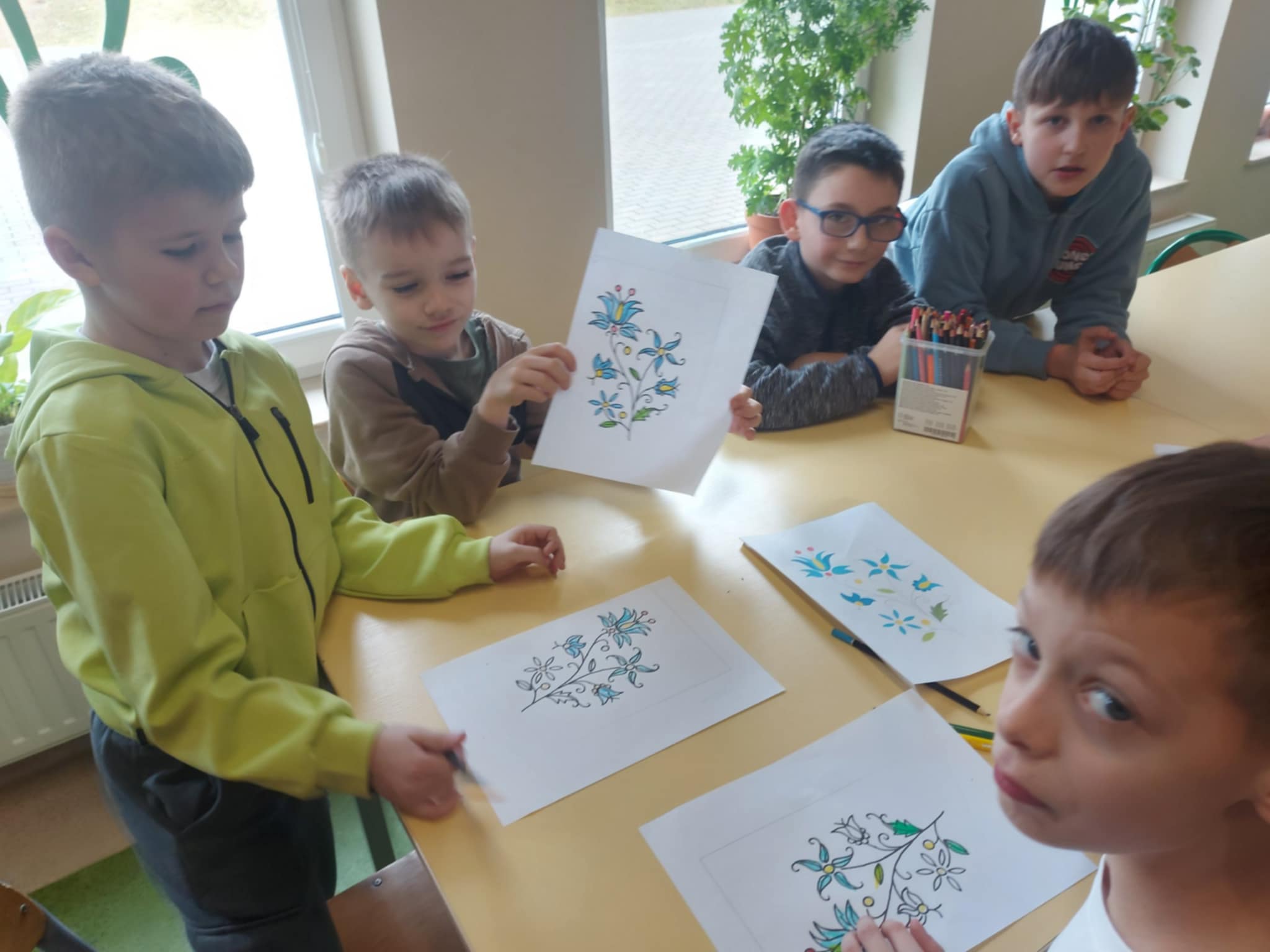 🎨 Nie zabrakło również zajęć plastycznych – uczniowie kolorowali tradycyjne wzory kaszubskie 🖌️, rozwijając swoją kreatywność i poznając regionalną sztukę ludową.