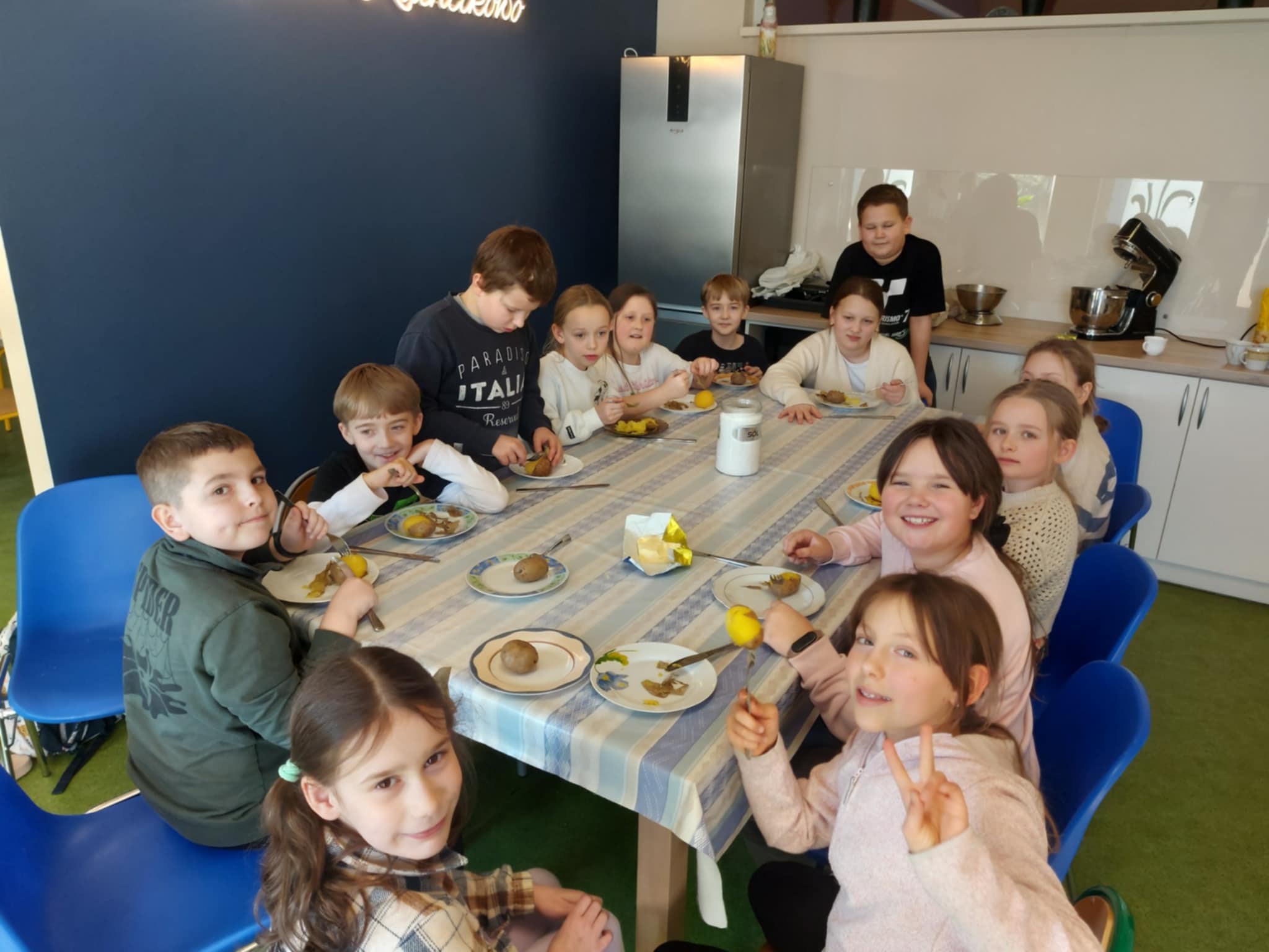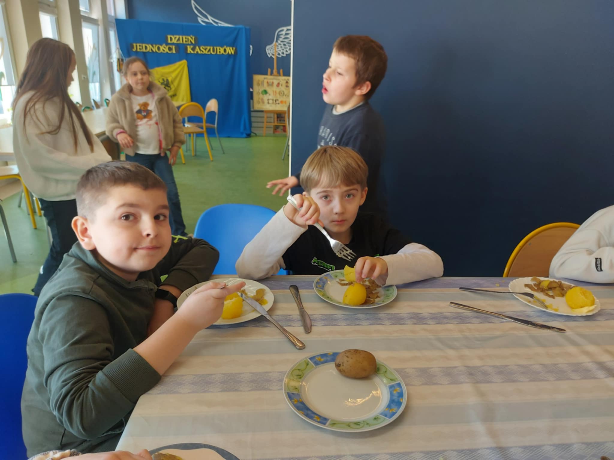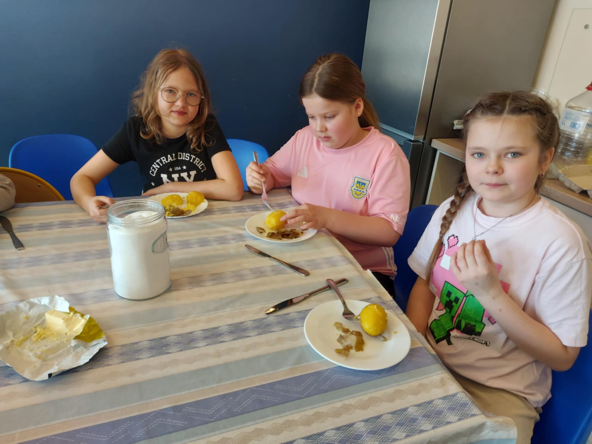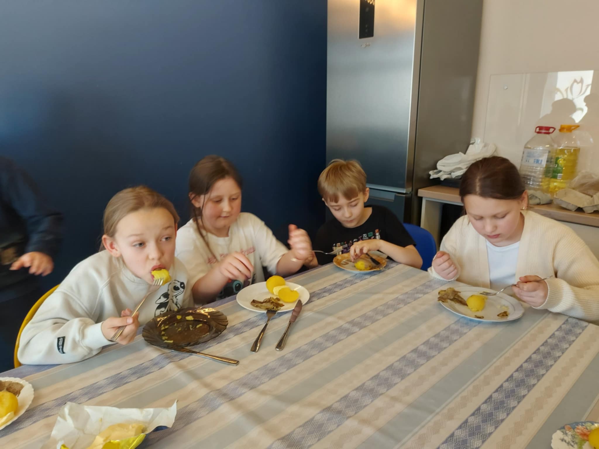 🥣🥔 Dużym zainteresowaniem cieszyła się także kuchnia kaszubska. Dzieci delektowały się smakami regionu, próbując „pulków” z masłem i solą 🧈 oraz zupy owocowej z kluskami 🍓.