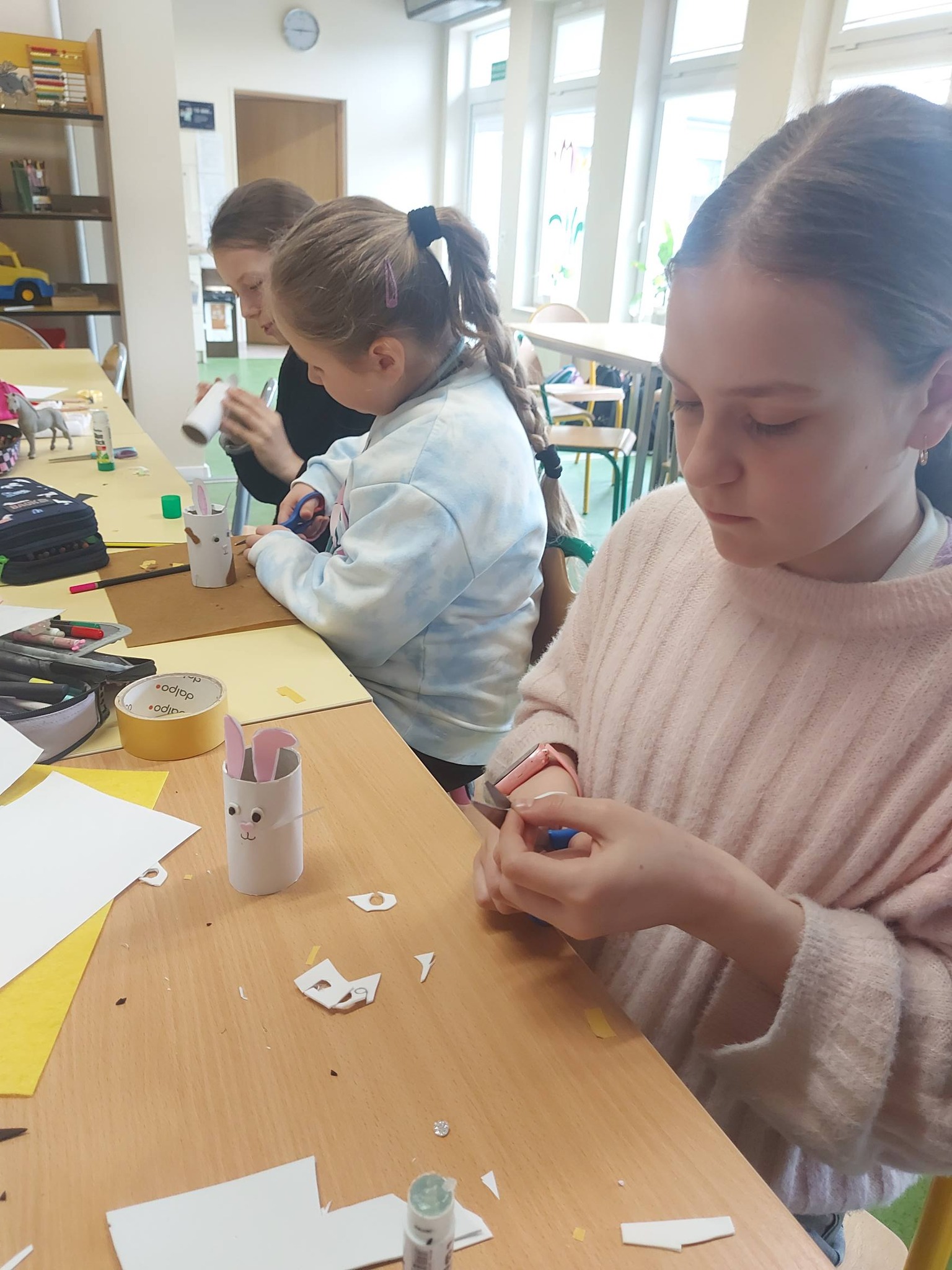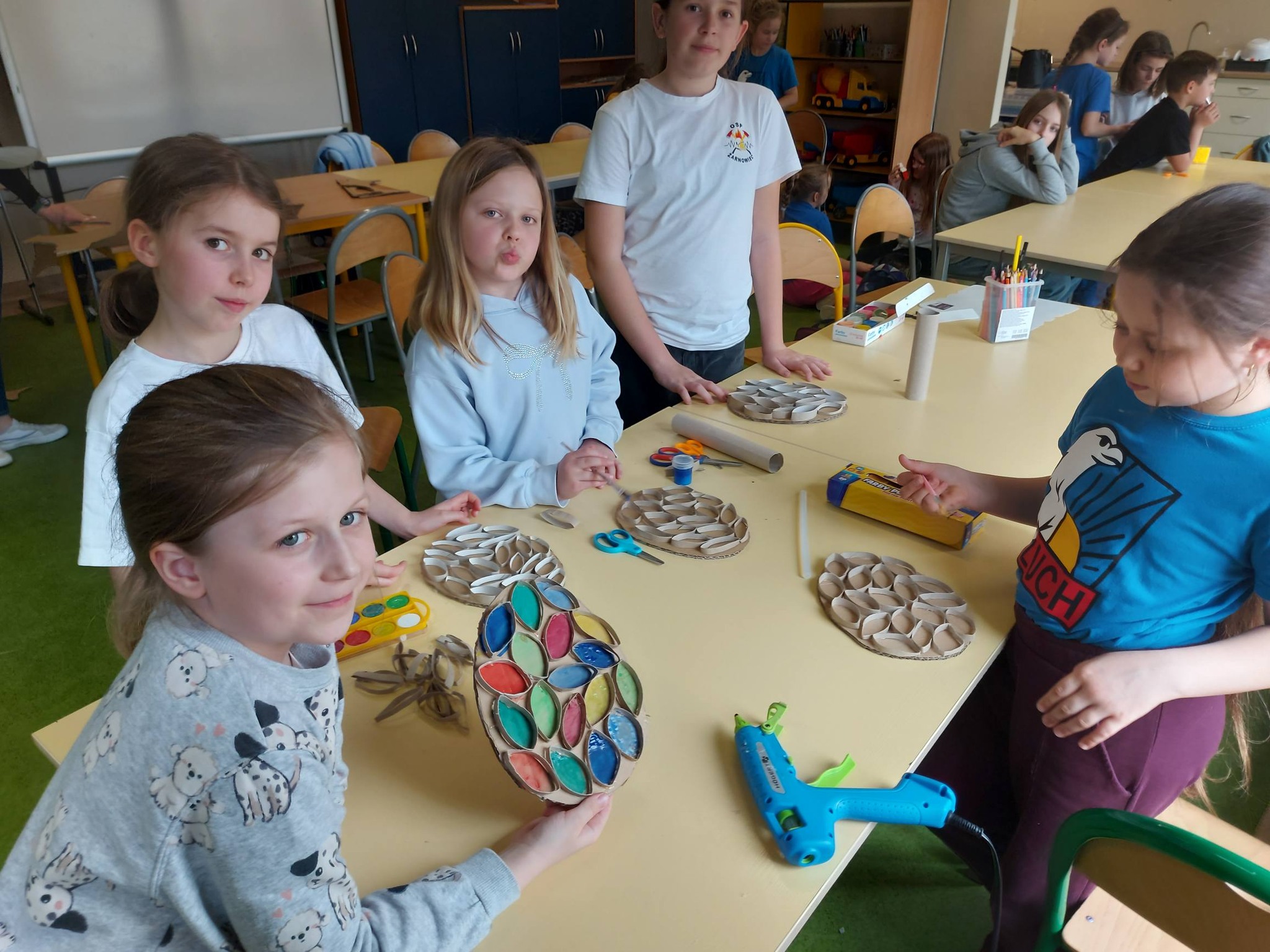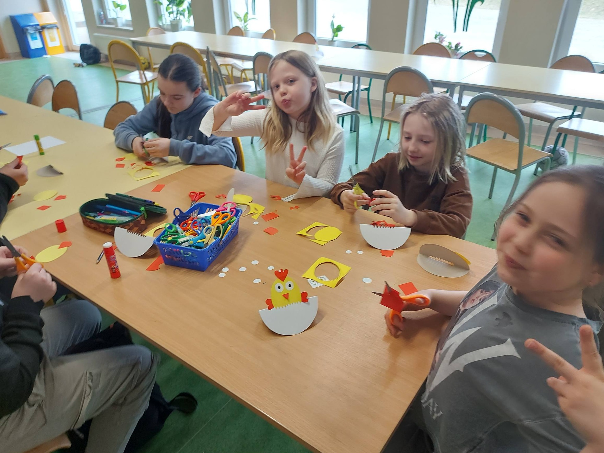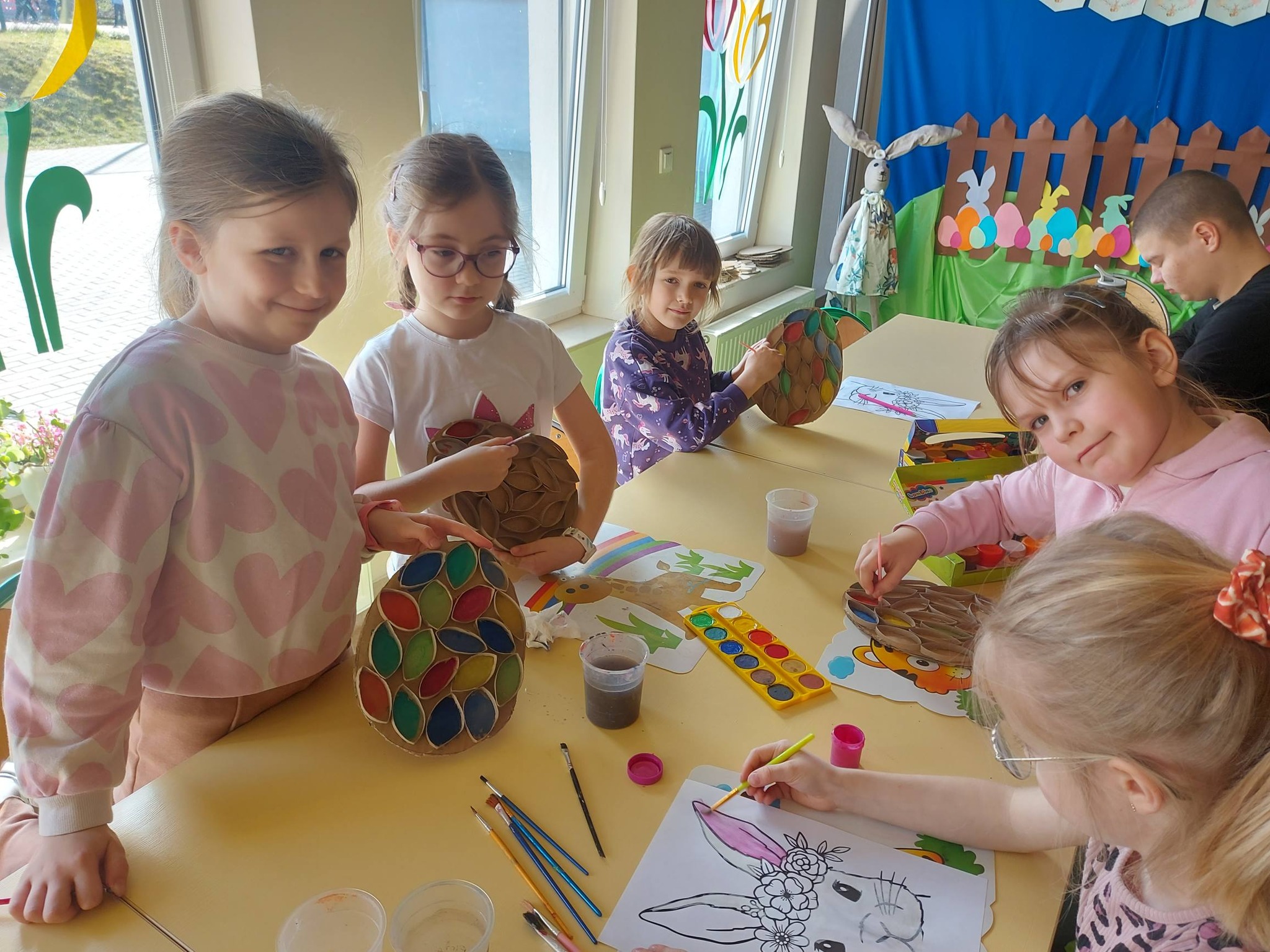 Nasi trzecioklasiści wykazali się niezwykłą starannością i pomysłowością, tworząc świąteczne koszyczki do święconki, które własnoręcznie udekorowali. Powstały również pisanki 3D, urocze kurczaczki z papieru, a także kreatywne zajączki z rolek, które wprowadziły do naszej świetlicy prawdziwie wiosenny klimat 🐰🌼