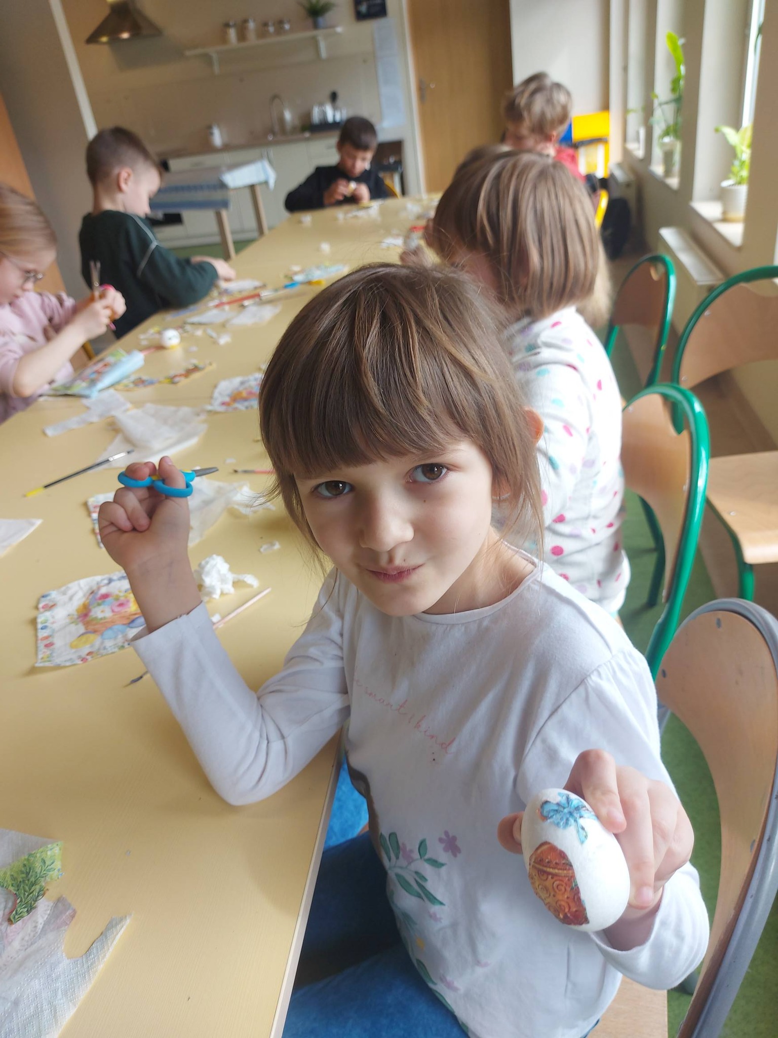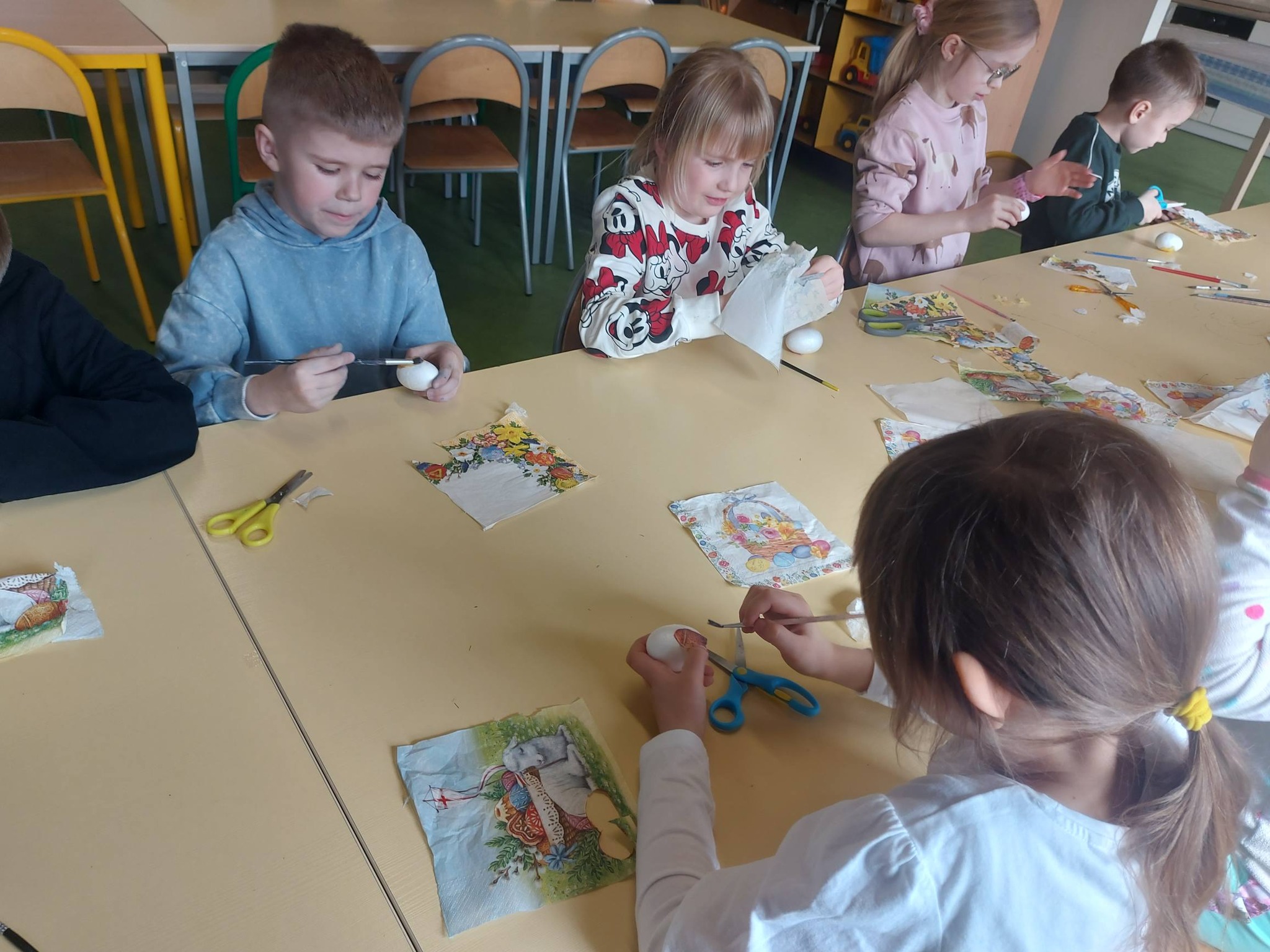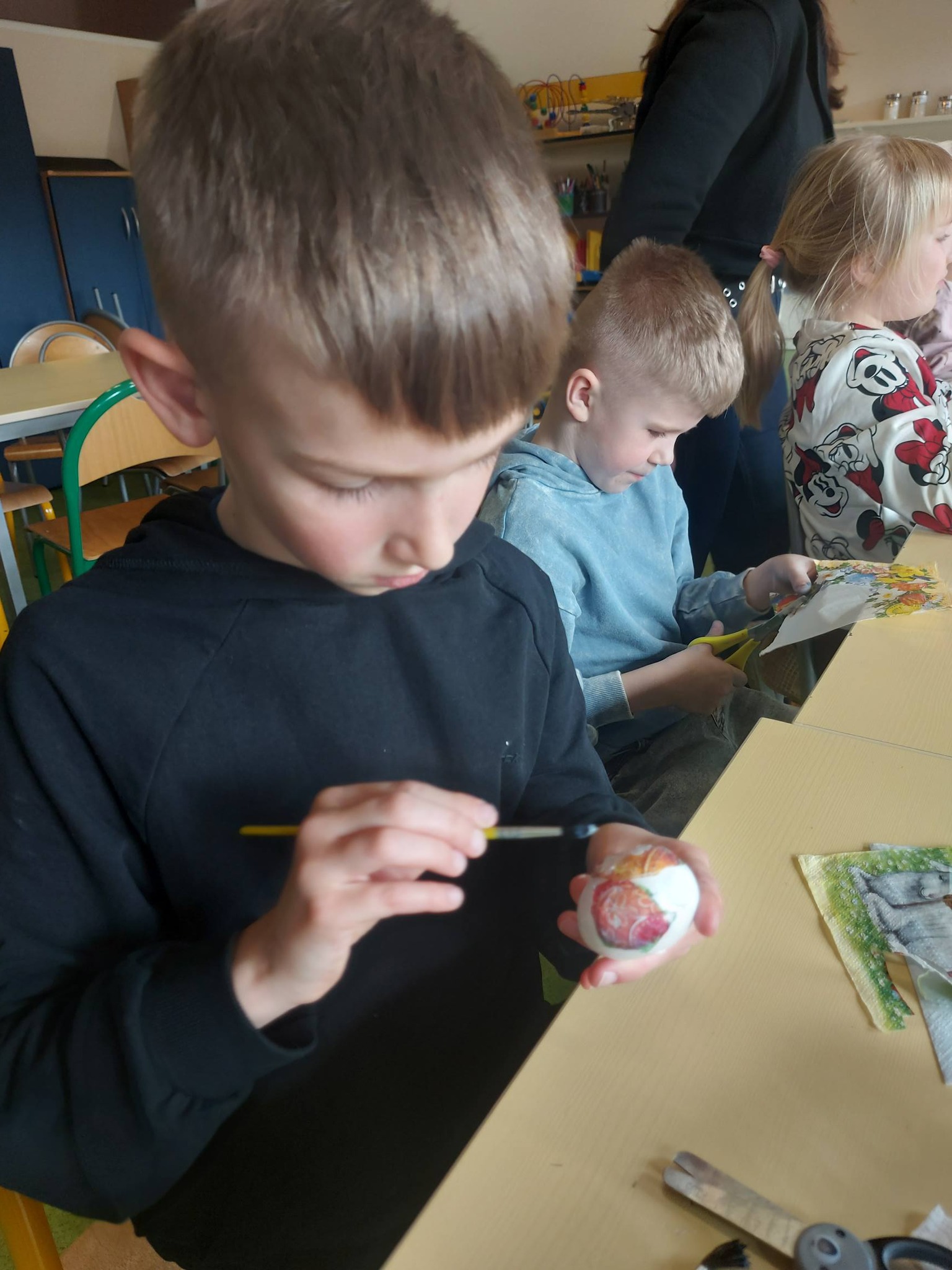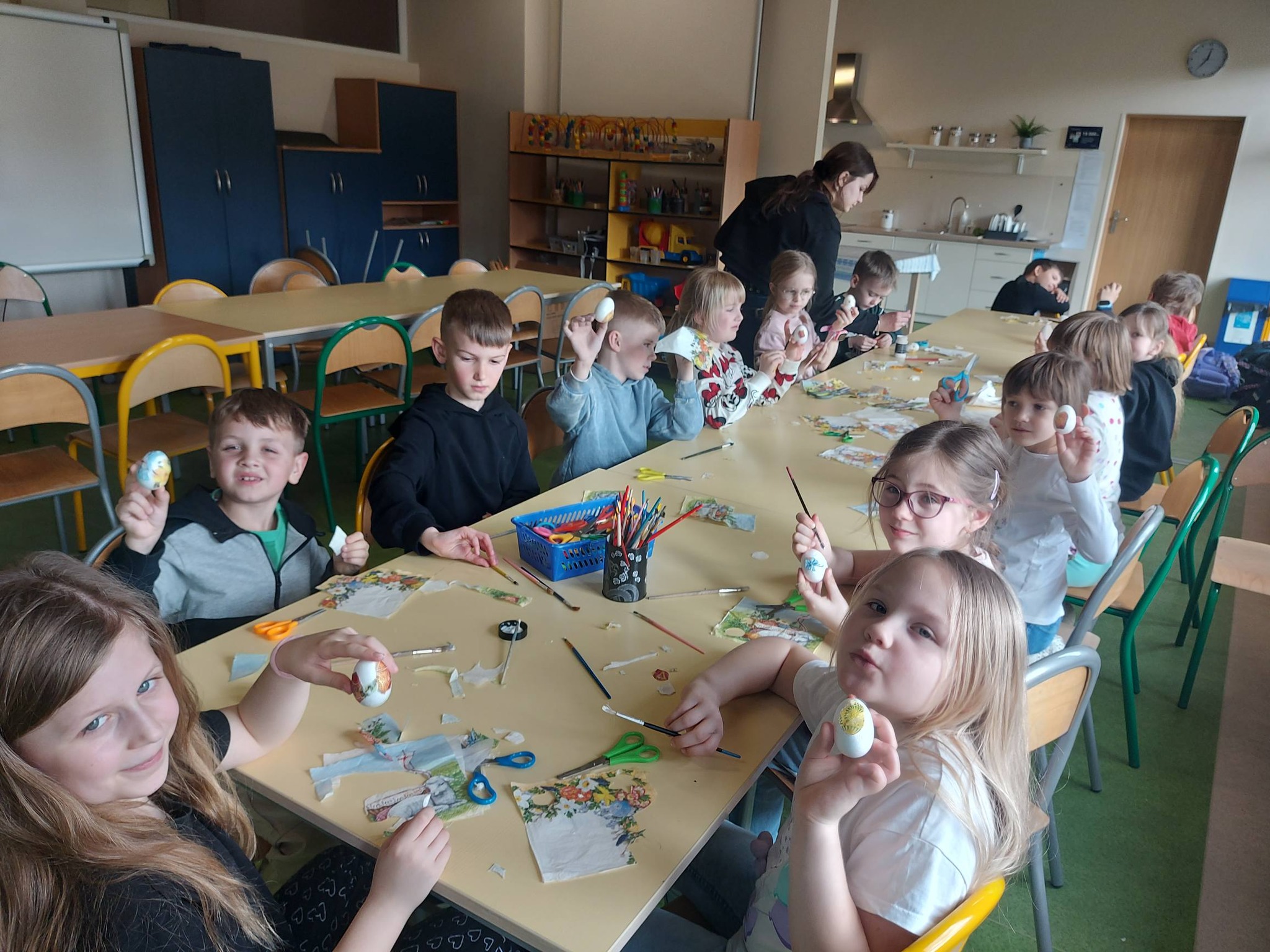 Każdy dzień przynosił nowe pomysły i inspiracje! Powstawały piękne kartki wielkanocne na konkurs plastyczny – każda inna, każda wyjątkowa, wykonana różnorodnymi technikami. Uczniowie odkrywali także nowe możliwości twórcze, ozdabiając pisanki metodą decoupage, która okazała się prawdziwym hitem! 🎨