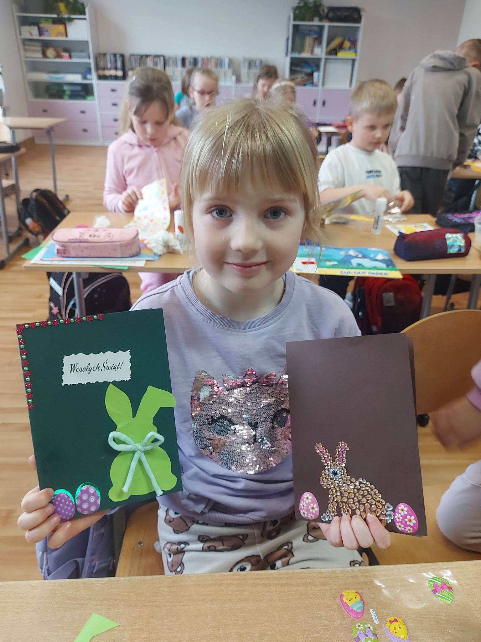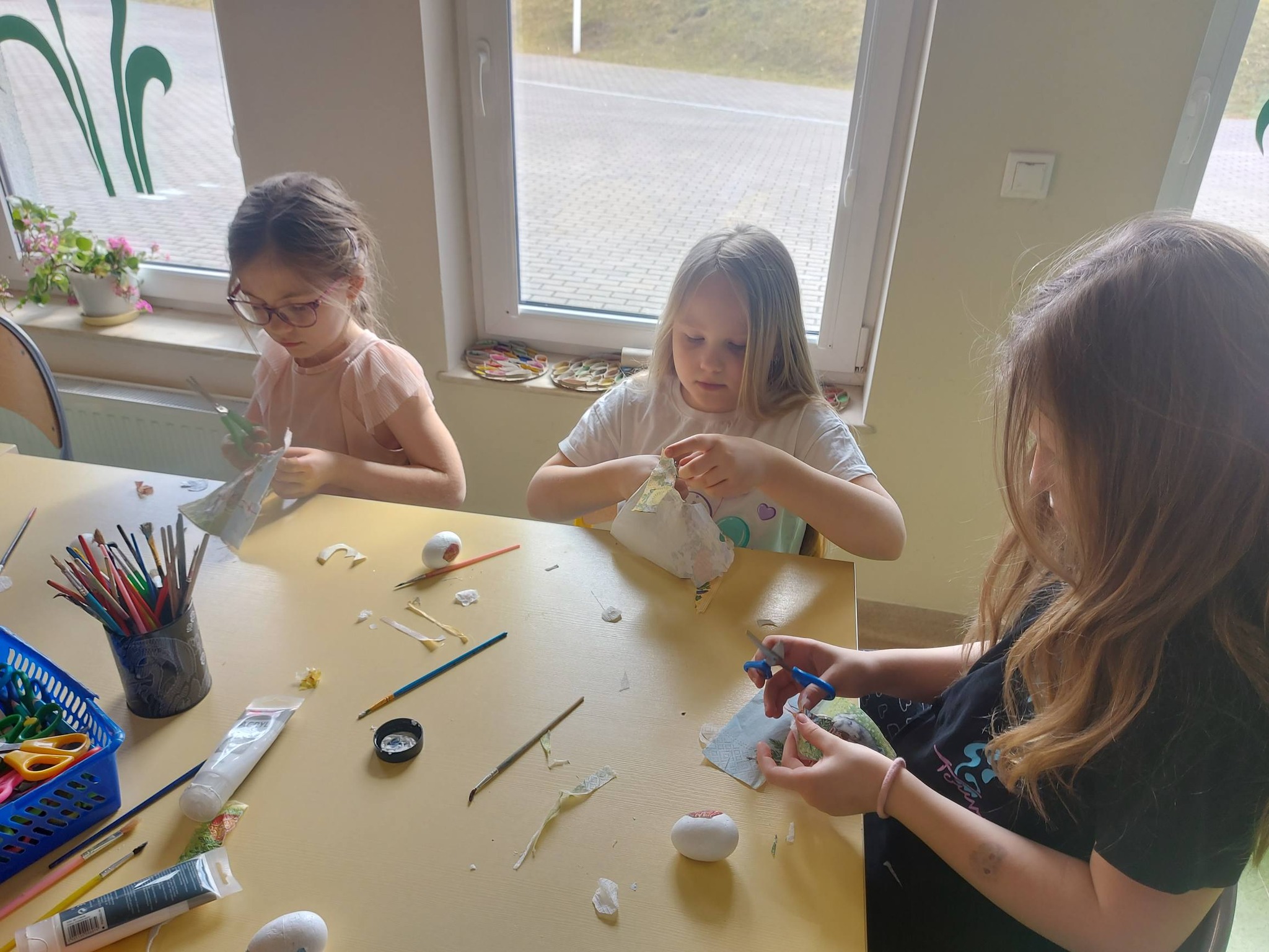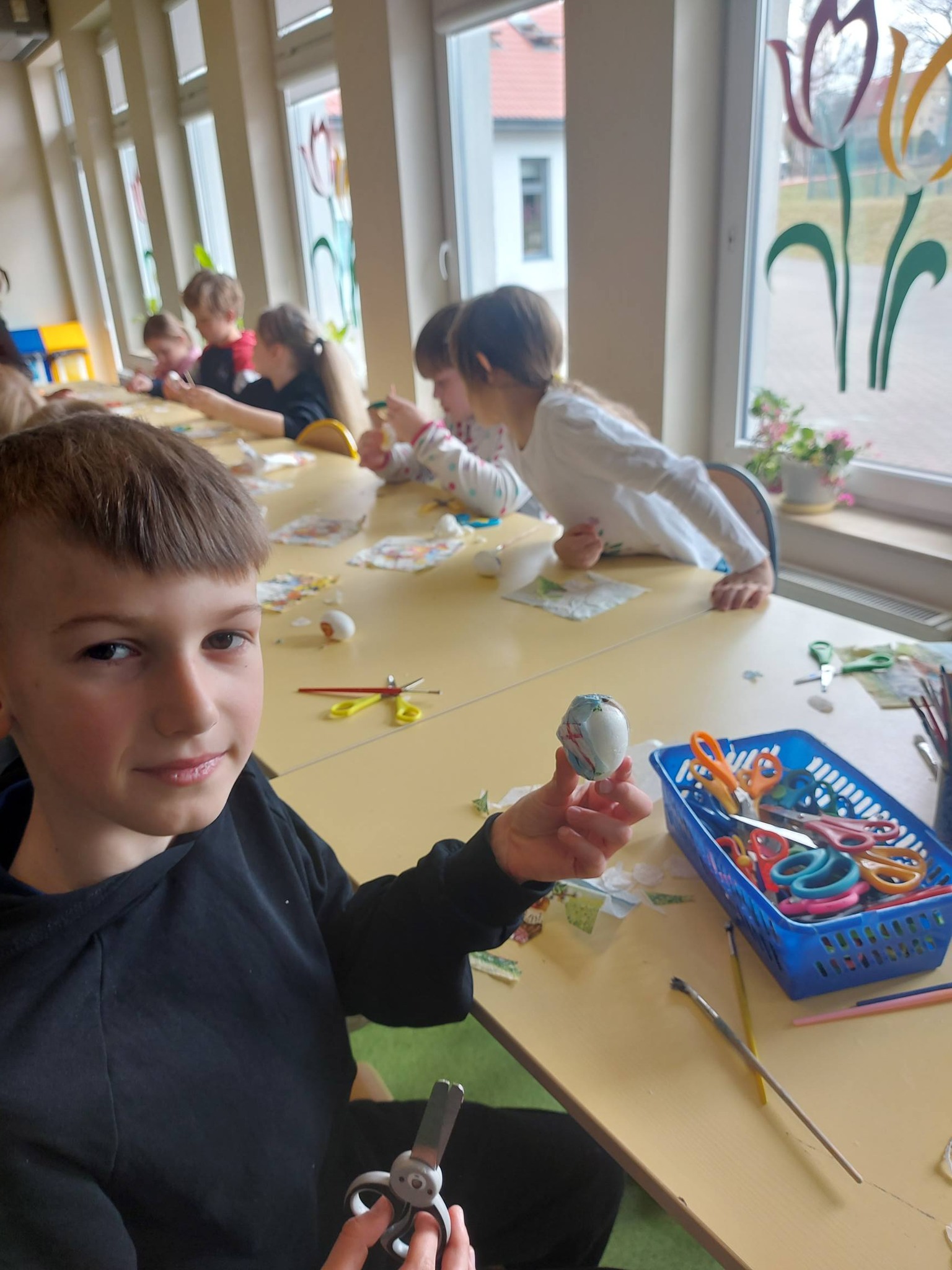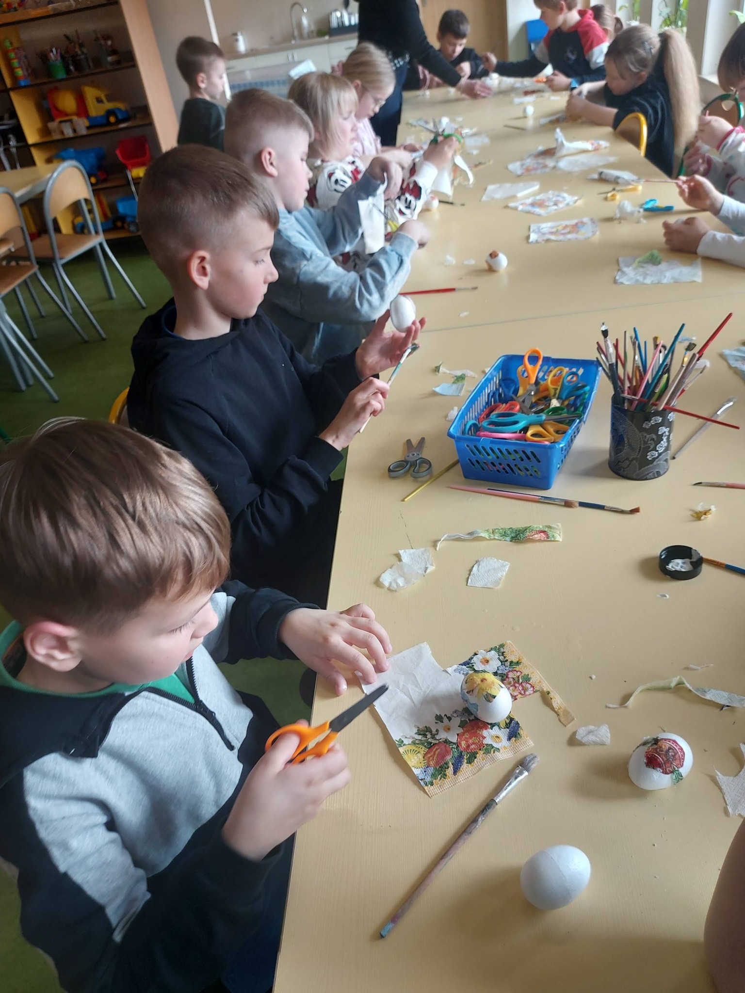 Każdy dzień przynosił nowe pomysły i inspiracje! Powstawały piękne kartki wielkanocne na konkurs plastyczny – każda inna, każda wyjątkowa, wykonana różnorodnymi technikami. Uczniowie odkrywali także nowe możliwości twórcze, ozdabiając pisanki metodą decoupage, która okazała się prawdziwym hitem! 🎨