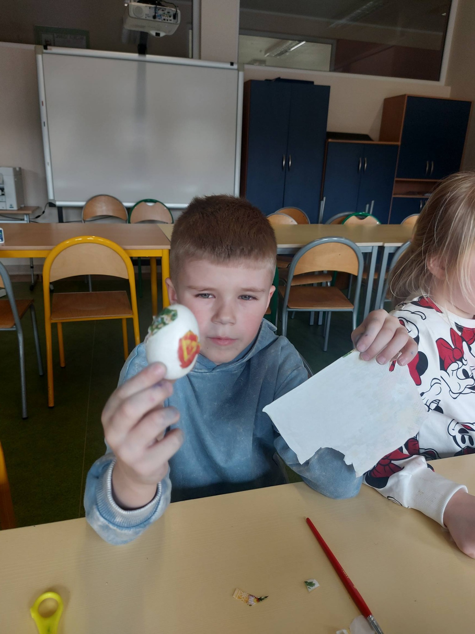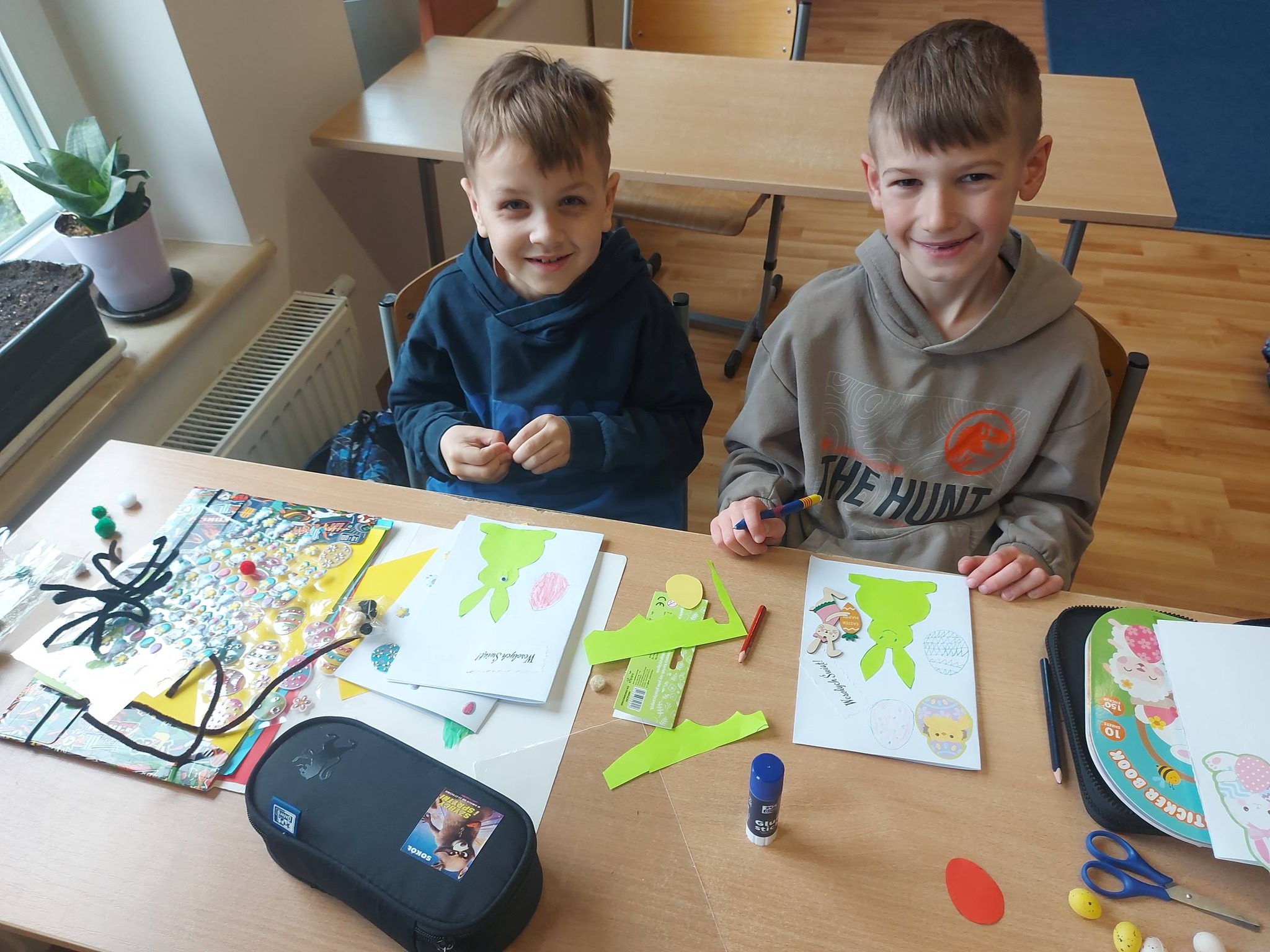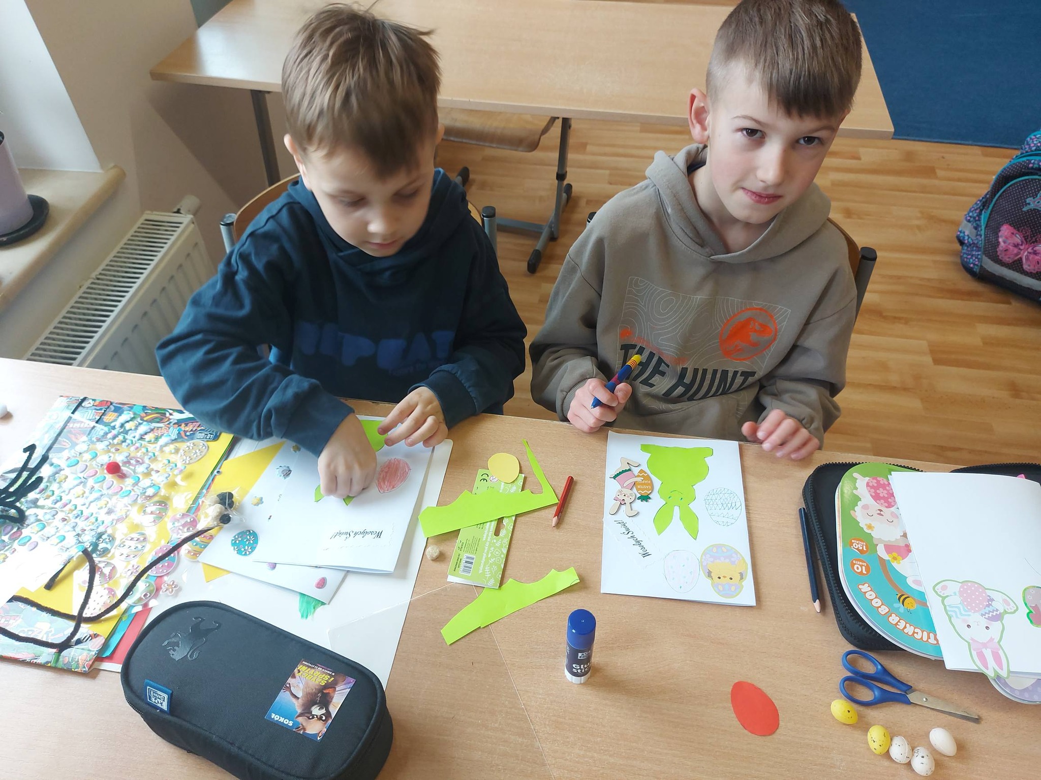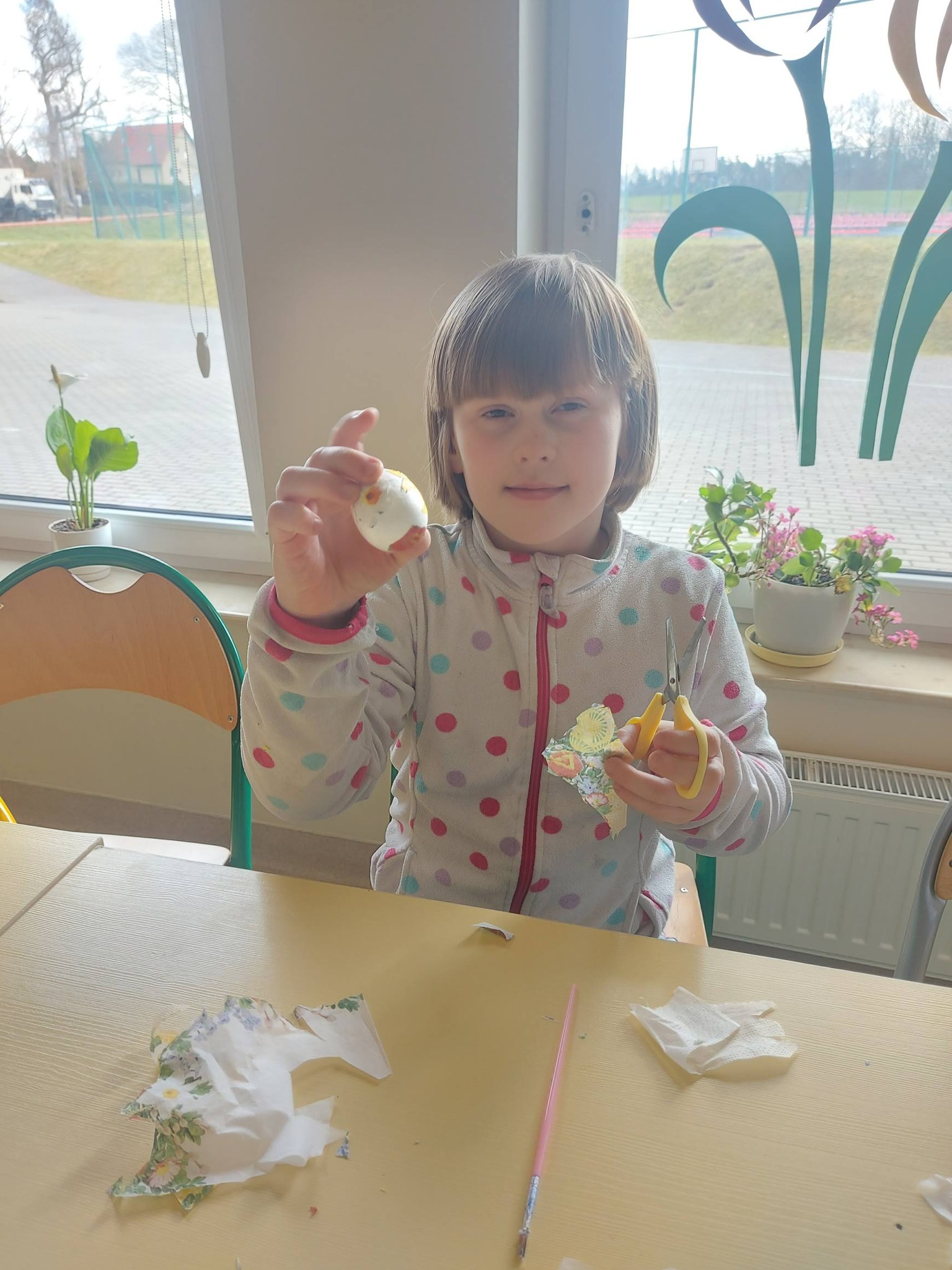 Każdy dzień przynosił nowe pomysły i inspiracje! Powstawały piękne kartki wielkanocne na konkurs plastyczny – każda inna, każda wyjątkowa, wykonana różnorodnymi technikami. Uczniowie odkrywali także nowe możliwości twórcze, ozdabiając pisanki metodą decoupage, która okazała się prawdziwym hitem! 🎨
