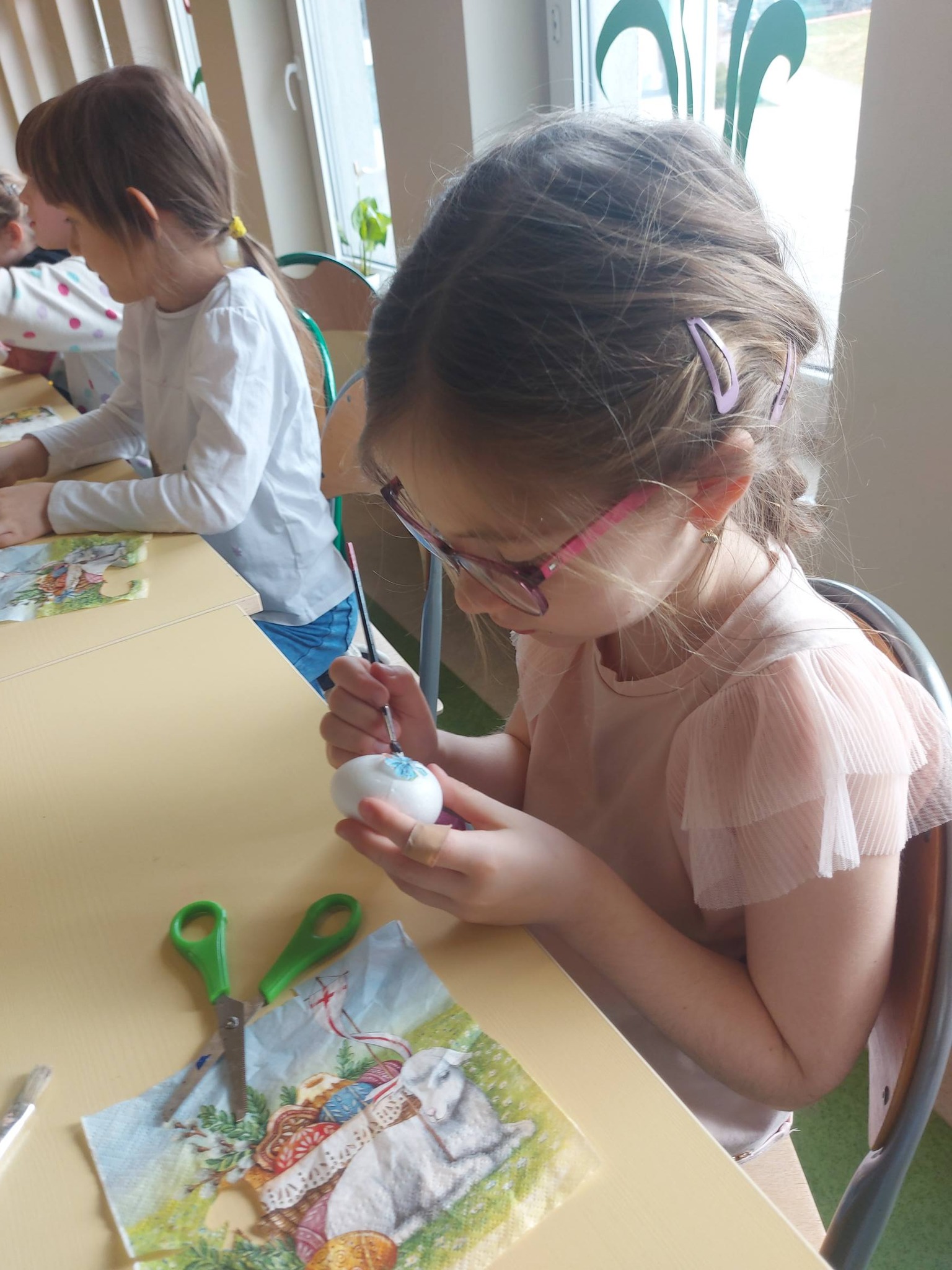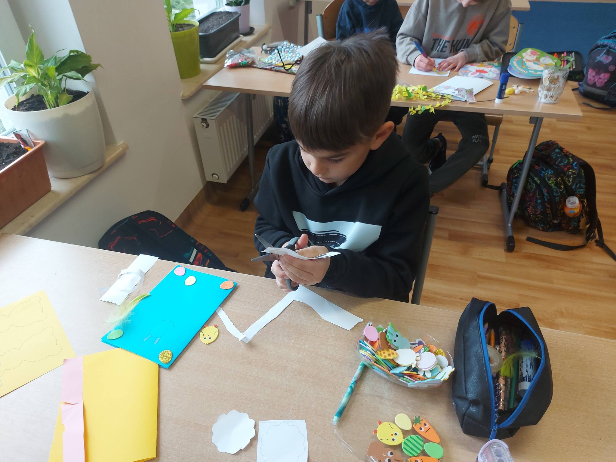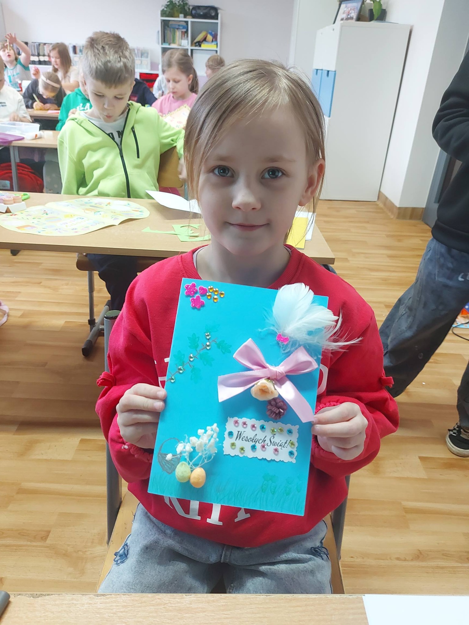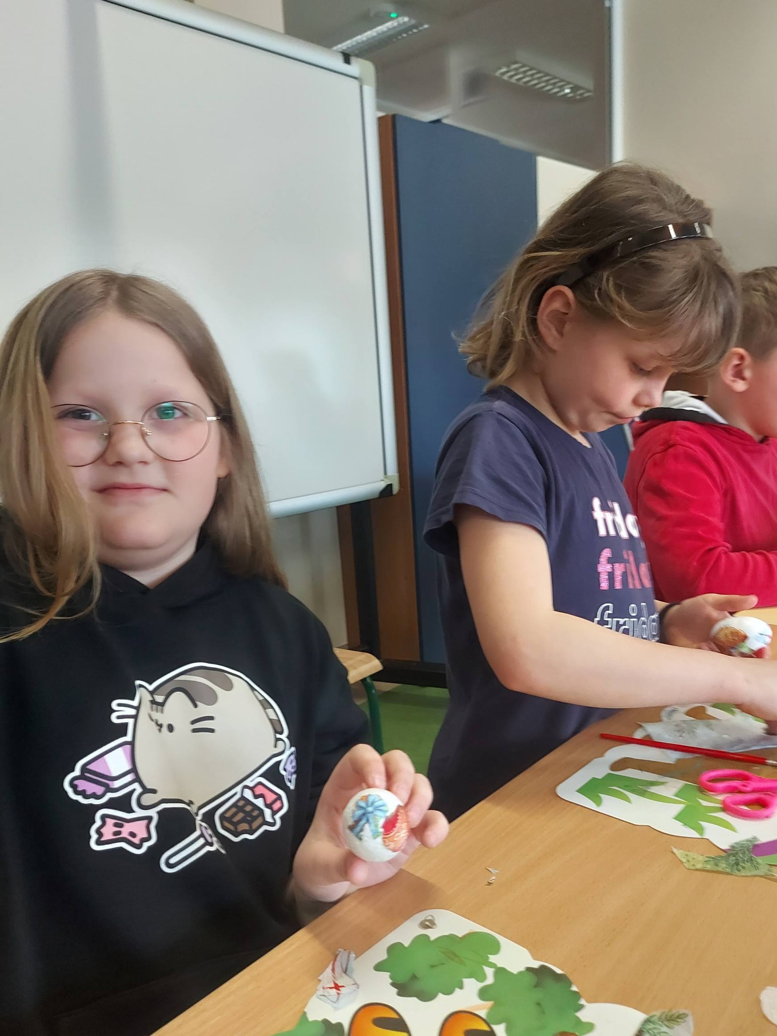 Każdy dzień przynosił nowe pomysły i inspiracje! Powstawały piękne kartki wielkanocne na konkurs plastyczny – każda inna, każda wyjątkowa, wykonana różnorodnymi technikami. Uczniowie odkrywali także nowe możliwości twórcze, ozdabiając pisanki metodą decoupage, która okazała się prawdziwym hitem! 🎨