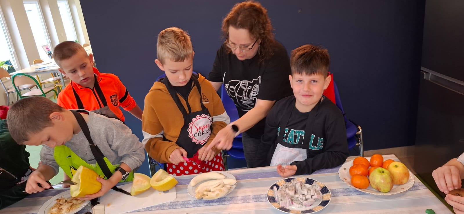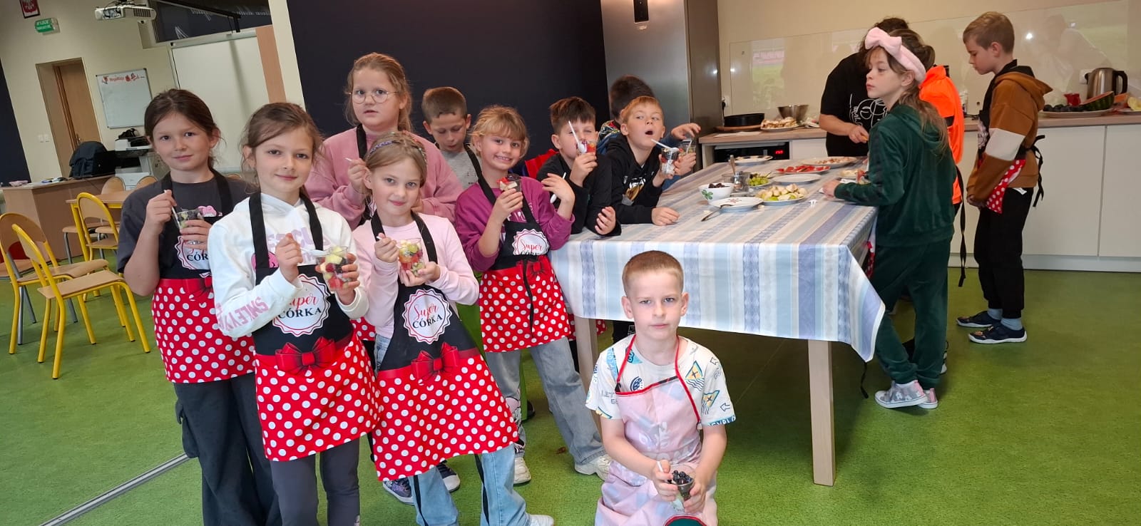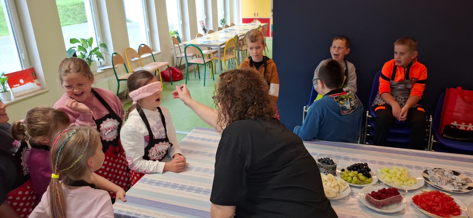 Finałem tych „pysznych” zajęć było stworzenie własnych, autorskich sałatek owocowych. Wszystko, co zostało skomponowane, zostało natychmiast zjedzone! Na koniec, z pełnymi brzuchami i uśmiechami, uczniowie zażądali, abyśmy w przyszłości koniecznie powtórzyli takie fantastyczne zadania!