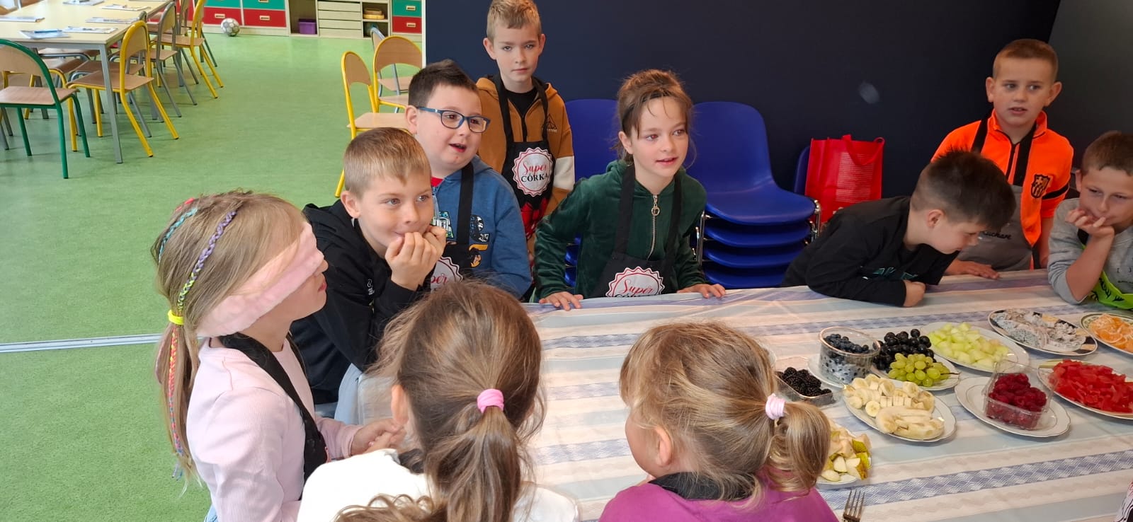 Szkolne Kuchcikowo zamieniło się w eksplozję kolorów i zapachów! Każdy uczeń przyniósł owocowe pyszności: soczyste jabłka i gruszki, jasne i ciemne winogrona, egzotyczne kiwi i banany, a także drobne skarby, jak borówki, maliny i jeżyny. Prawdziwym hitem okazały się melon, arbuz, a zwłaszcza tajemniczy smoczy owoc – pitaja!