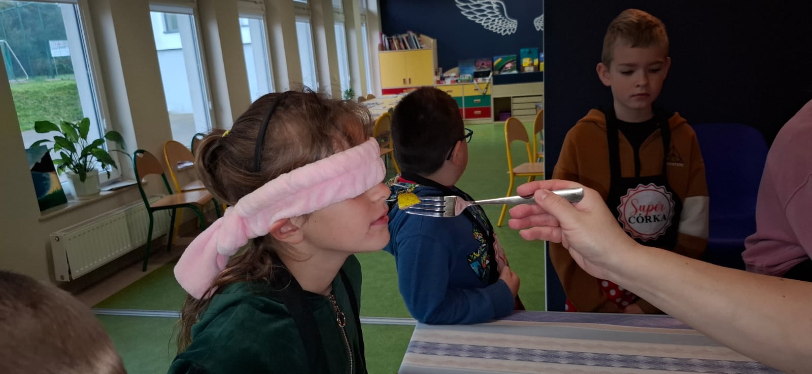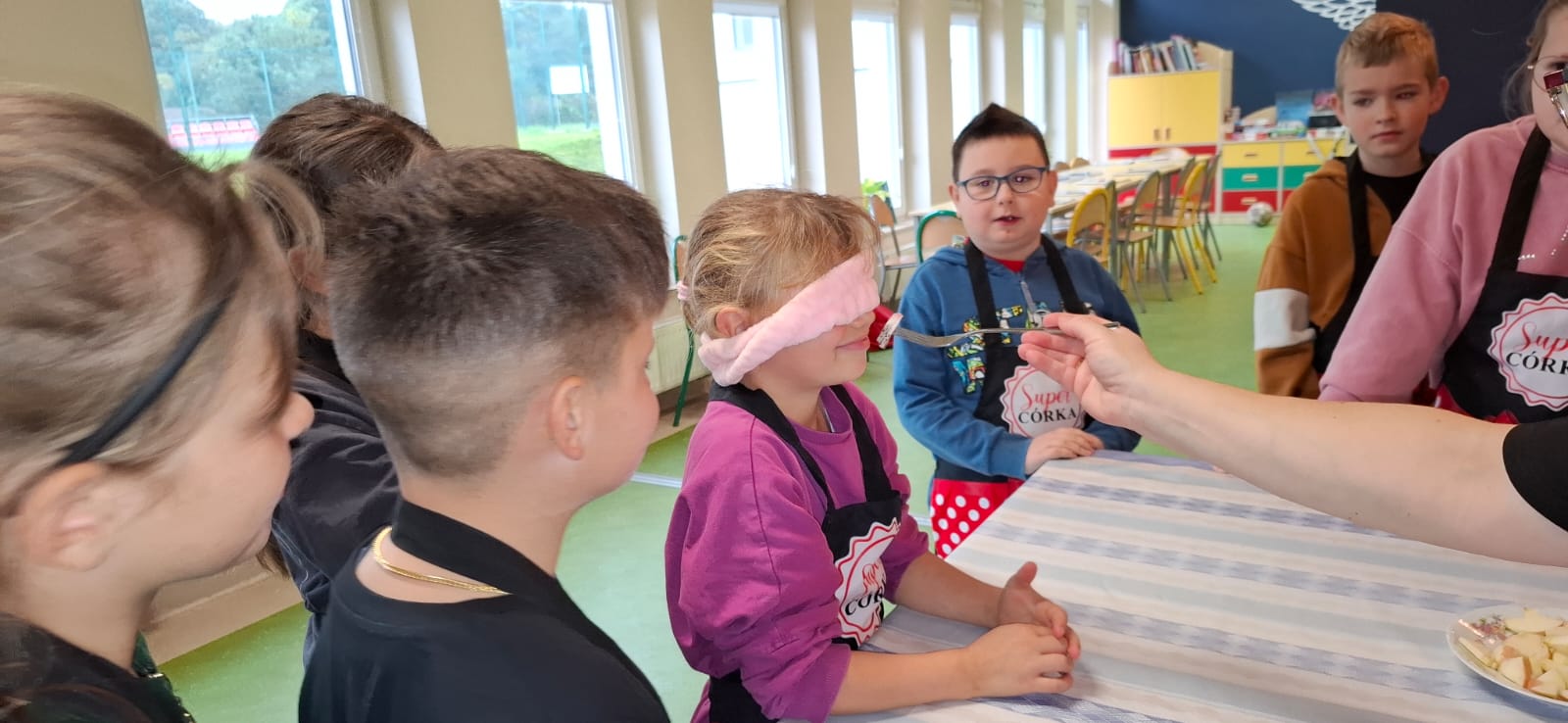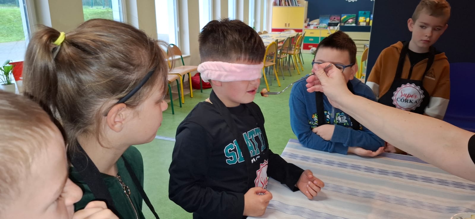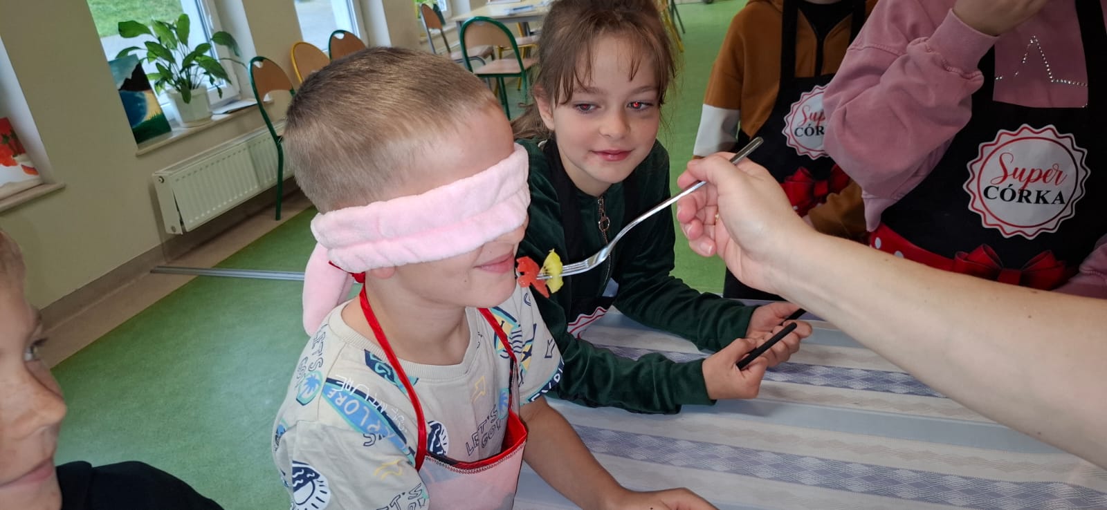 Następnie rozpoczęła się sensoryczna podróż. Z zasłoniętymi oczami dzieci musiały rozpoznać owoc wyłącznie po jego zapachu. Później przyszła kolej na test smaku. Aby utrudnić to zadanie, nauczyciel serwował jednocześnie po dwie próbki! Mali eksperci radzili sobie znakomicie, choć to egzotyczna i nieco zaskakująca pitaja sprawiła najwięcej kłopotów.