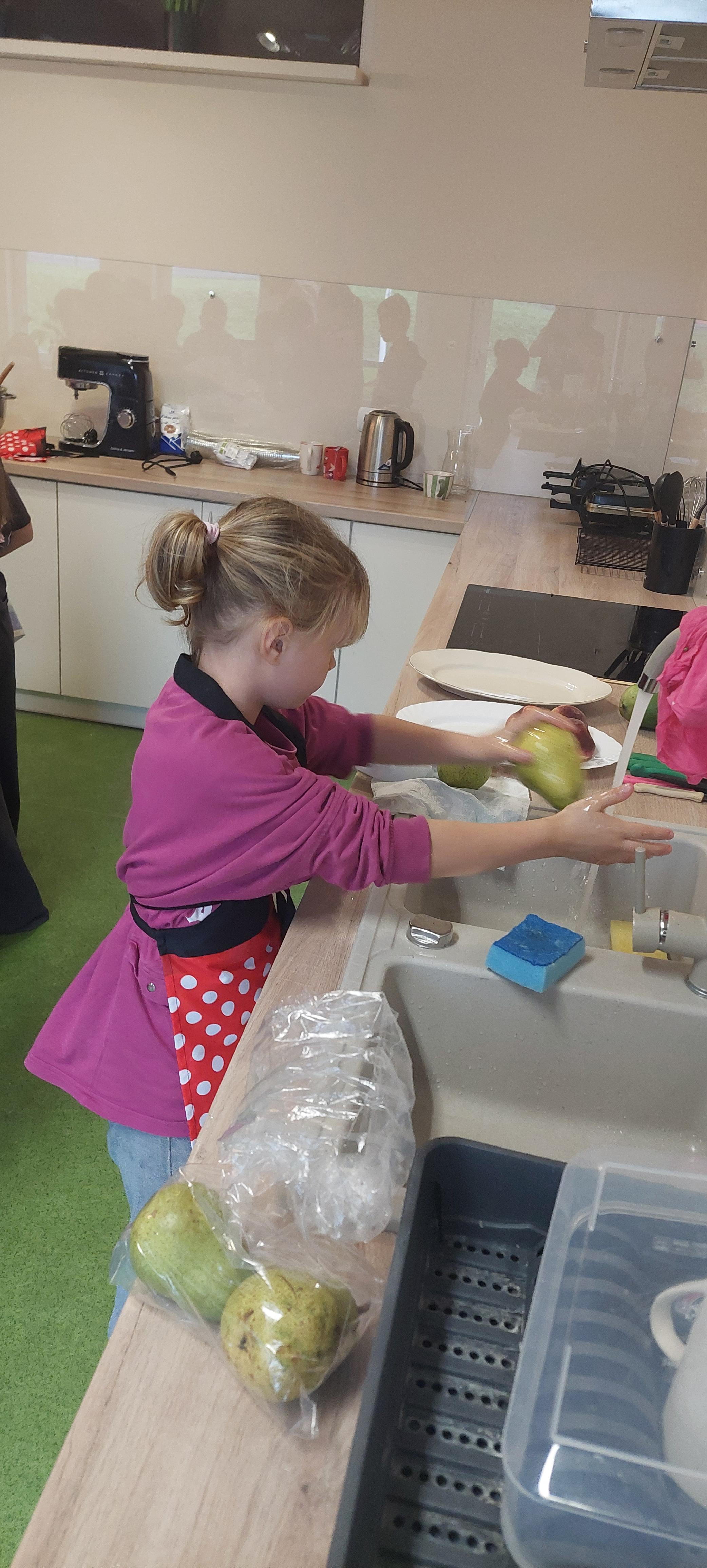Lekcja rozpoczęła się od geograficznych zagadek: dzieci z zapałem ustalały, które skarby pochodzą z polskich sadów, a które przebyły długą drogę z dalekich krajów. Nauczyciel, dbając o zasady higieny, przypomniał o niezbędnym myciu. Uczniowie natychmiast z entuzjazmem zabrali się do pracy, myjąc i krojąc przyniesione okazy.