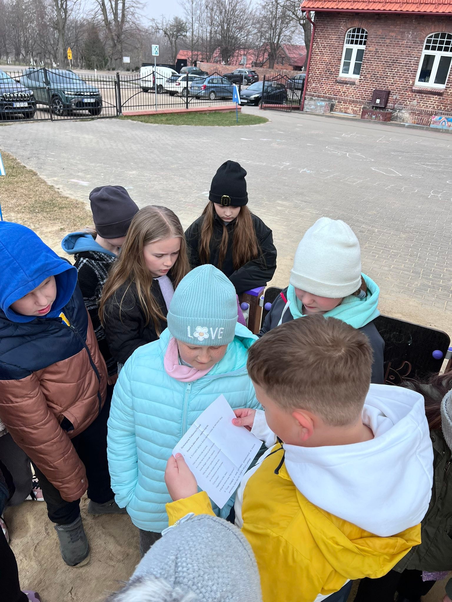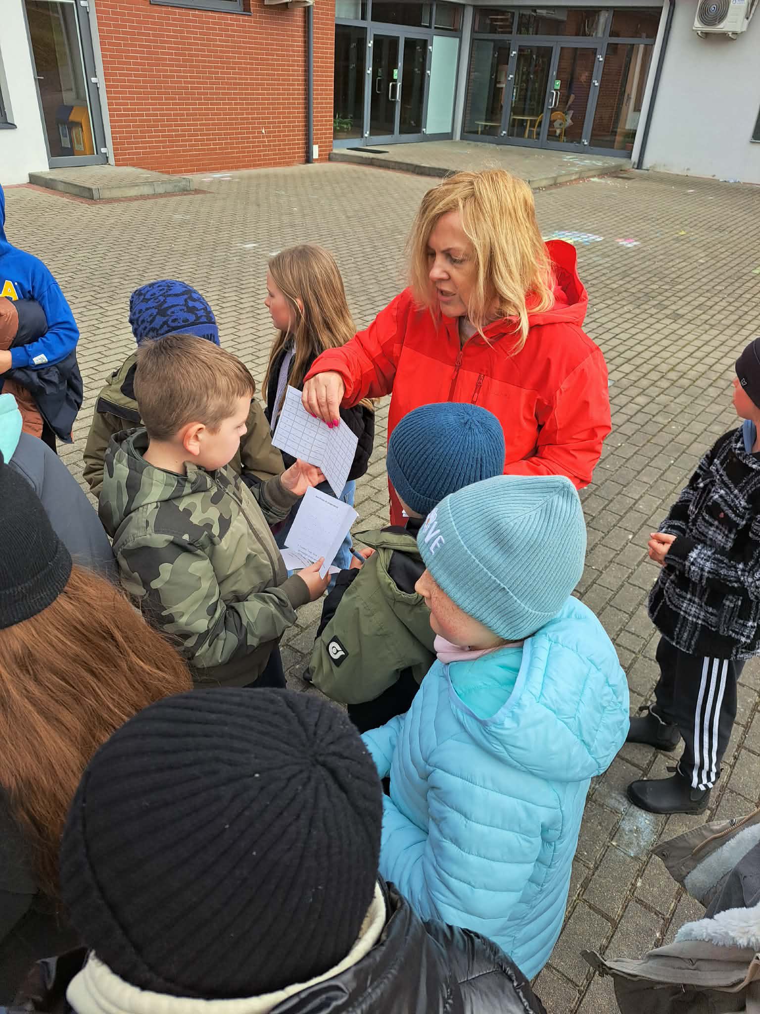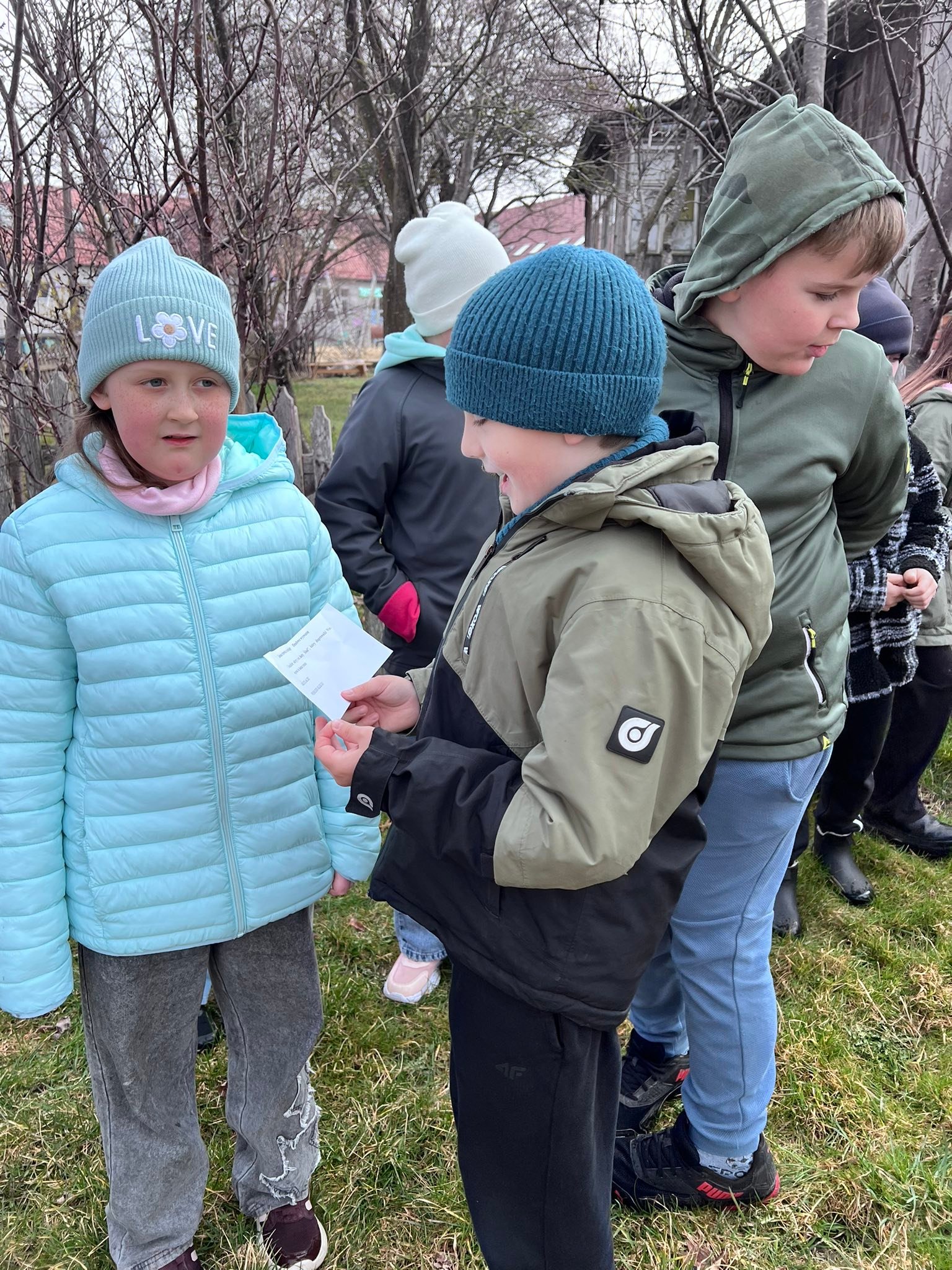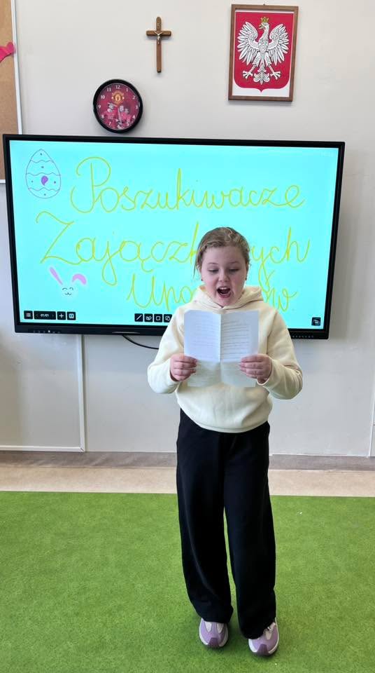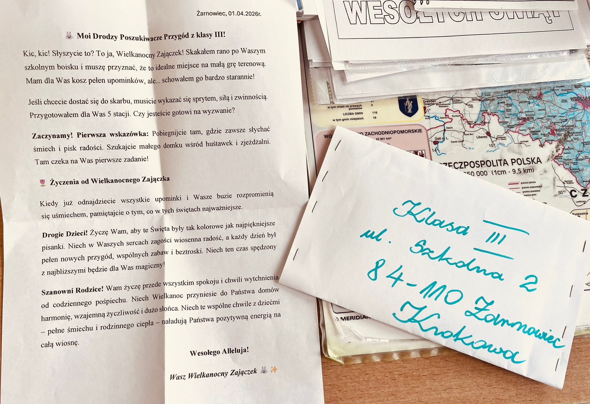 Największą niespodzianką była jednak środa przedświąteczna… Do klasy zawitał Wielkanocny Zajączek! 🐰 Zanim jednak dzieci otrzymały upominki, czekało je nie lada wyzwanie. Specjalny list, dostarczony przez kuriera i odczytany przez Magdę, zaprosił uczniów do udziału w grze terenowej.